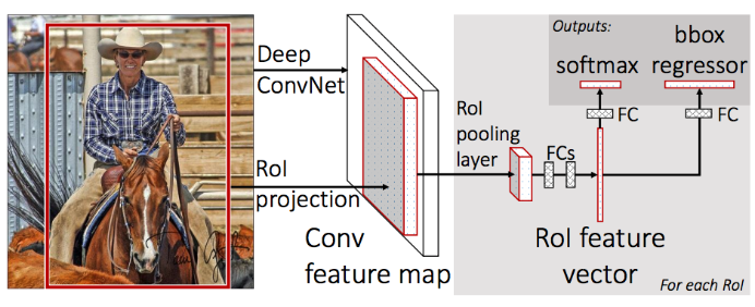 - The second stage is the Fast R-CNN detector that extracts features using RoIPool from each candidate box and performs classification and bounding-box regression