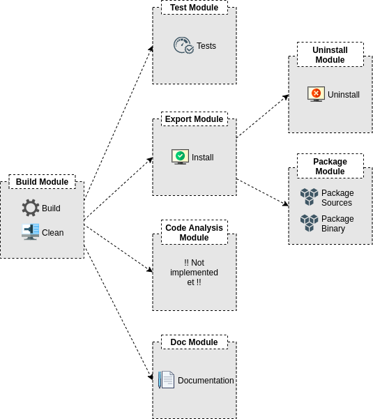 - Provides a way to generate a documentation, an installer, to run unit tests, to export the project and to install/uninstall it.
