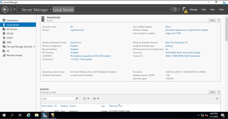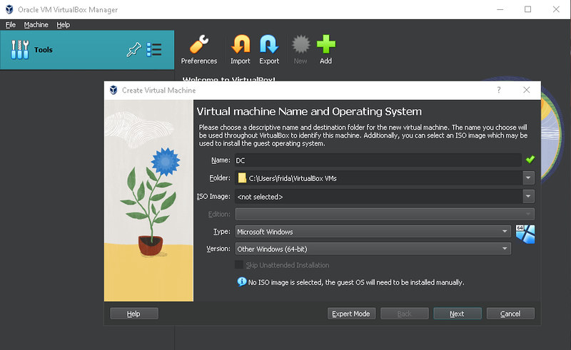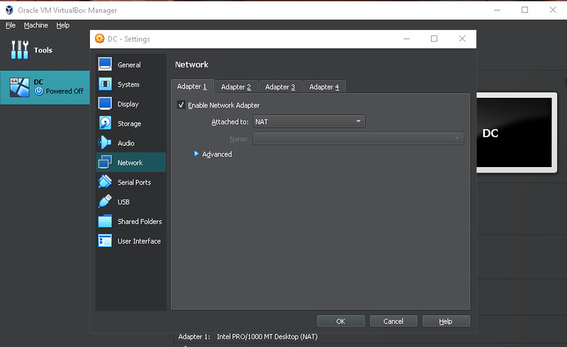 Download and install Virtual Box using the link above. The first virtual machine will house the domain controller so I'll need two network adapters, one to access the internet (NAT) and one dedicated to the internal network (Internal Network) so that the Domain Controller can communicate with the internal network. Go to Settings > Network > Advanced to make these changes.