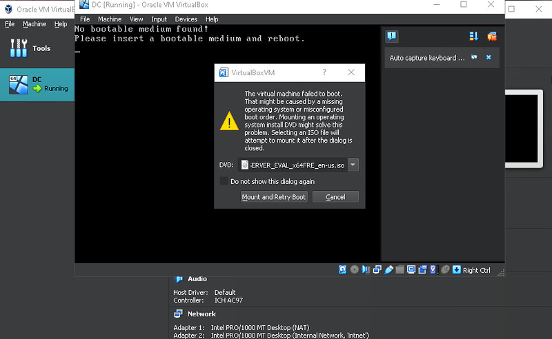 Click "Ok". Now double-click the domain controller (DC) and navigate to the directory where I downloaded Server 2019, select it and click "Mount and Retry Boot". This might take a while.