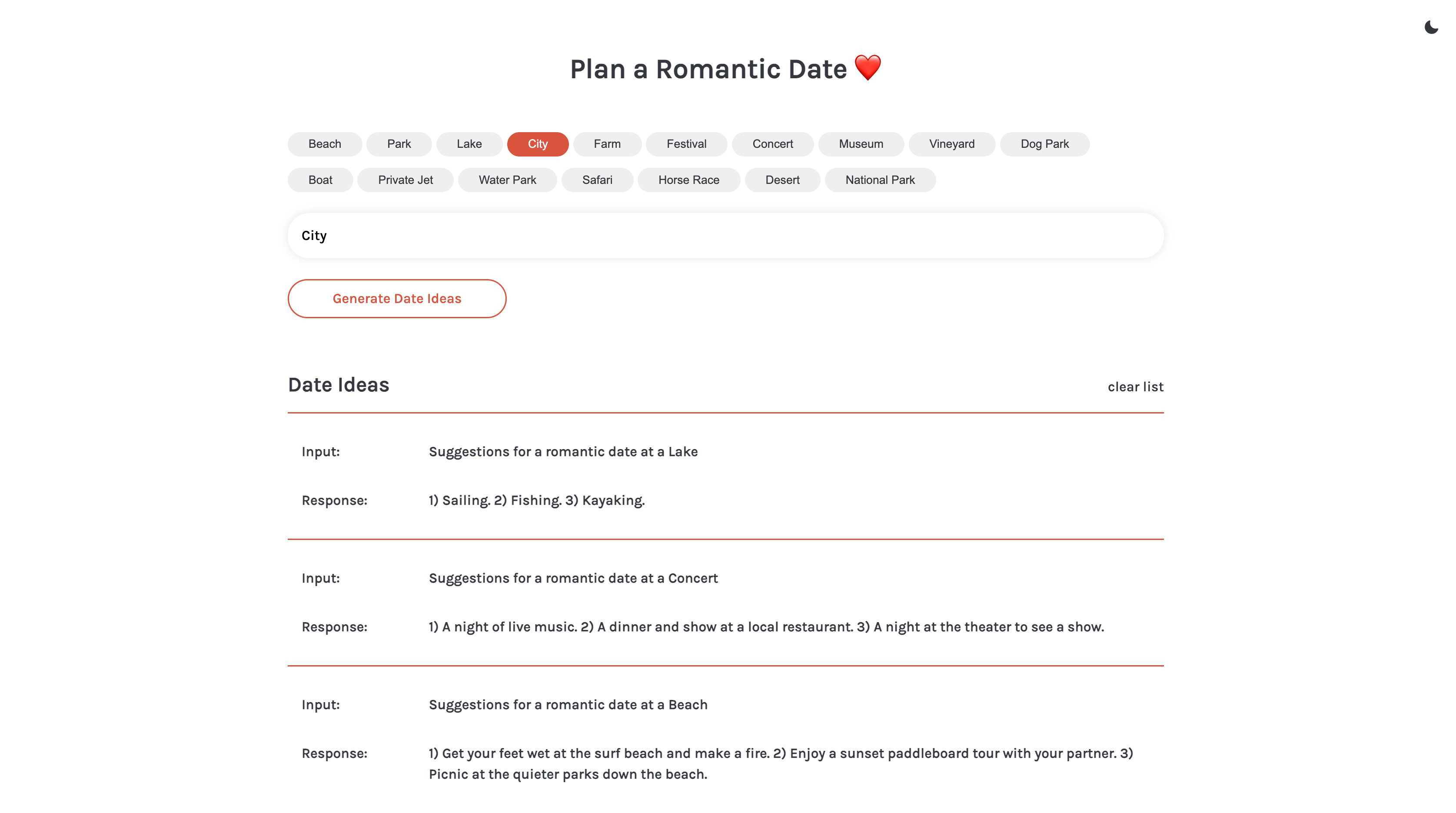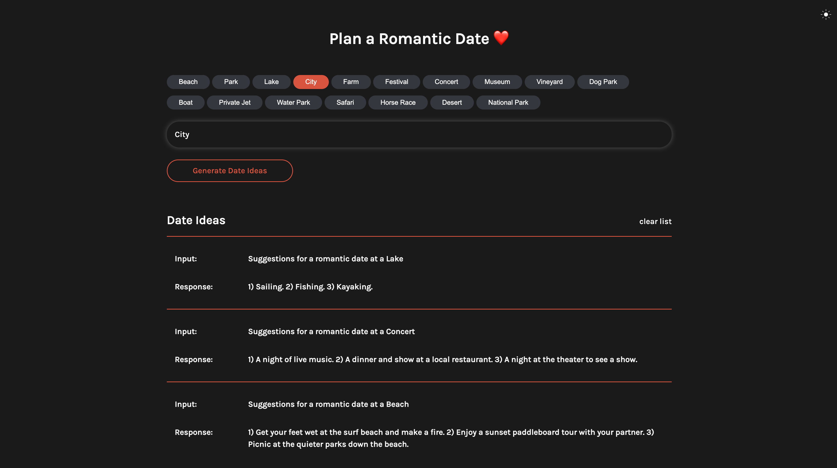 Date planning app that accepts a desired date location or environment from it's user and sends a formatted plain text prompts to the OpenAI API which returns a list of date suggestinos and displays the results in a list.