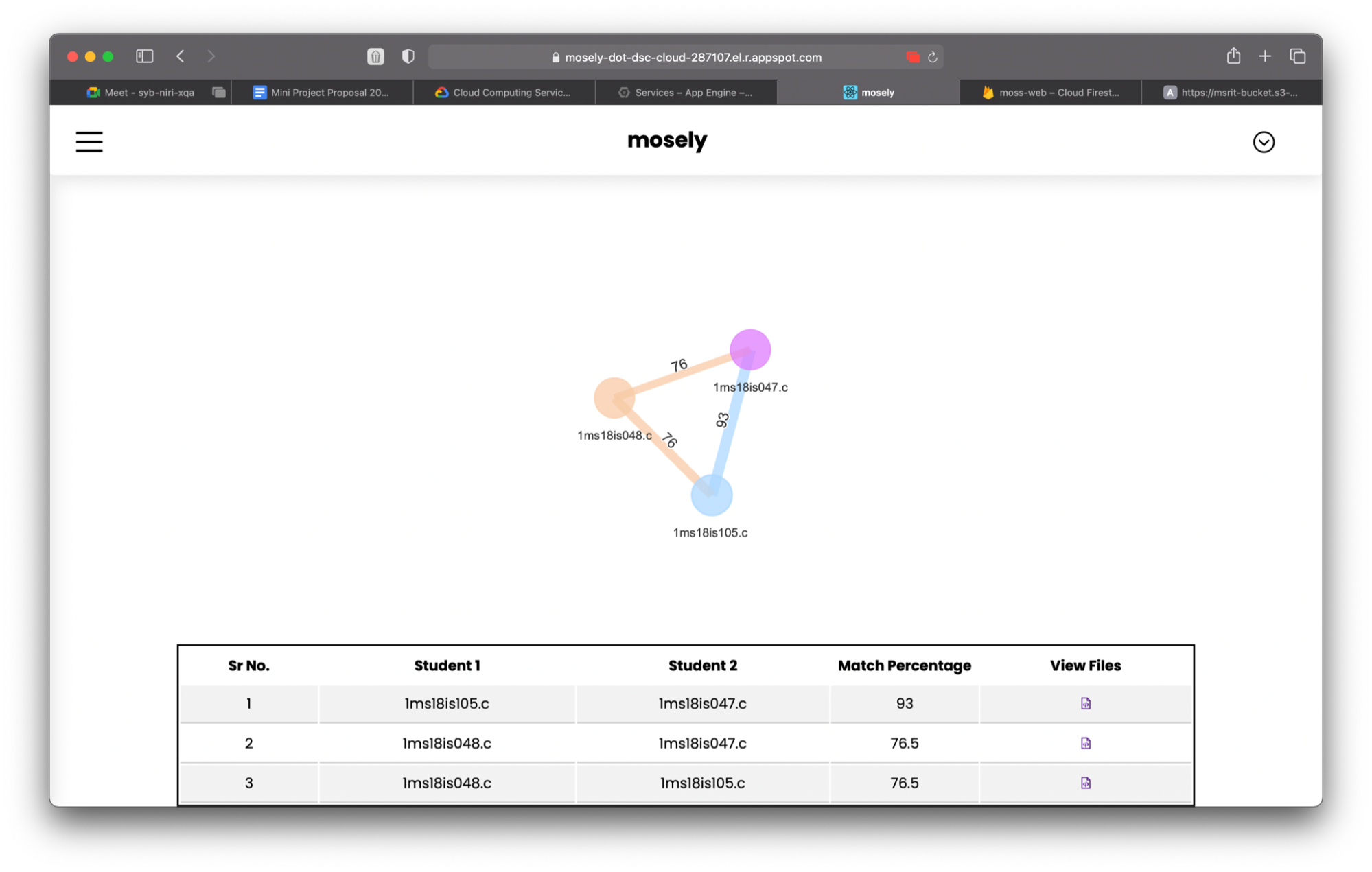 A Web Application built using FERN stack and MVC architecture for detecting plagiarism among students on submitting assignments by making using of Moss Stanford for ISE Department of Ramaiah Institute of Technology under the guidance of Dr. Mydhili K. Nair.