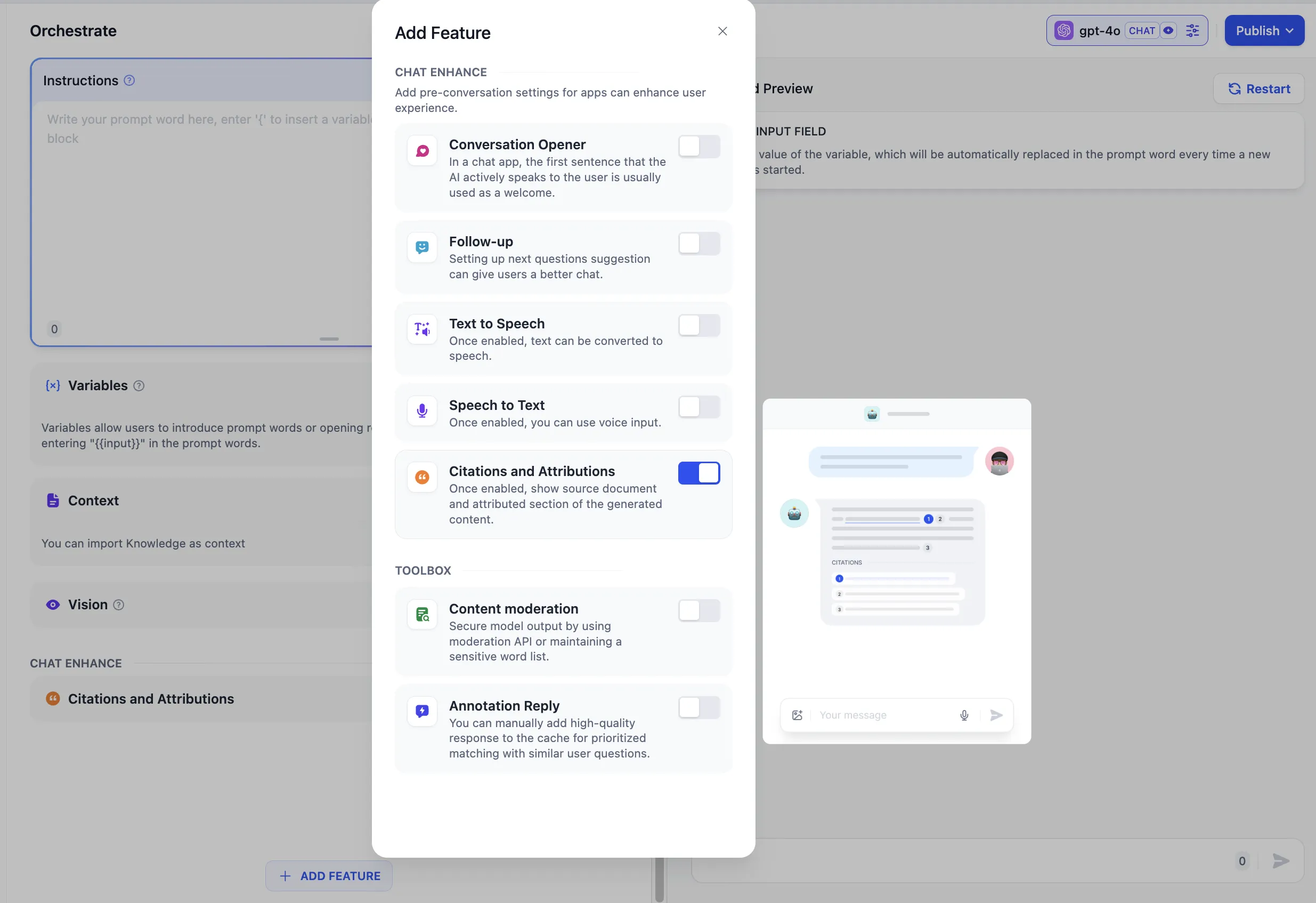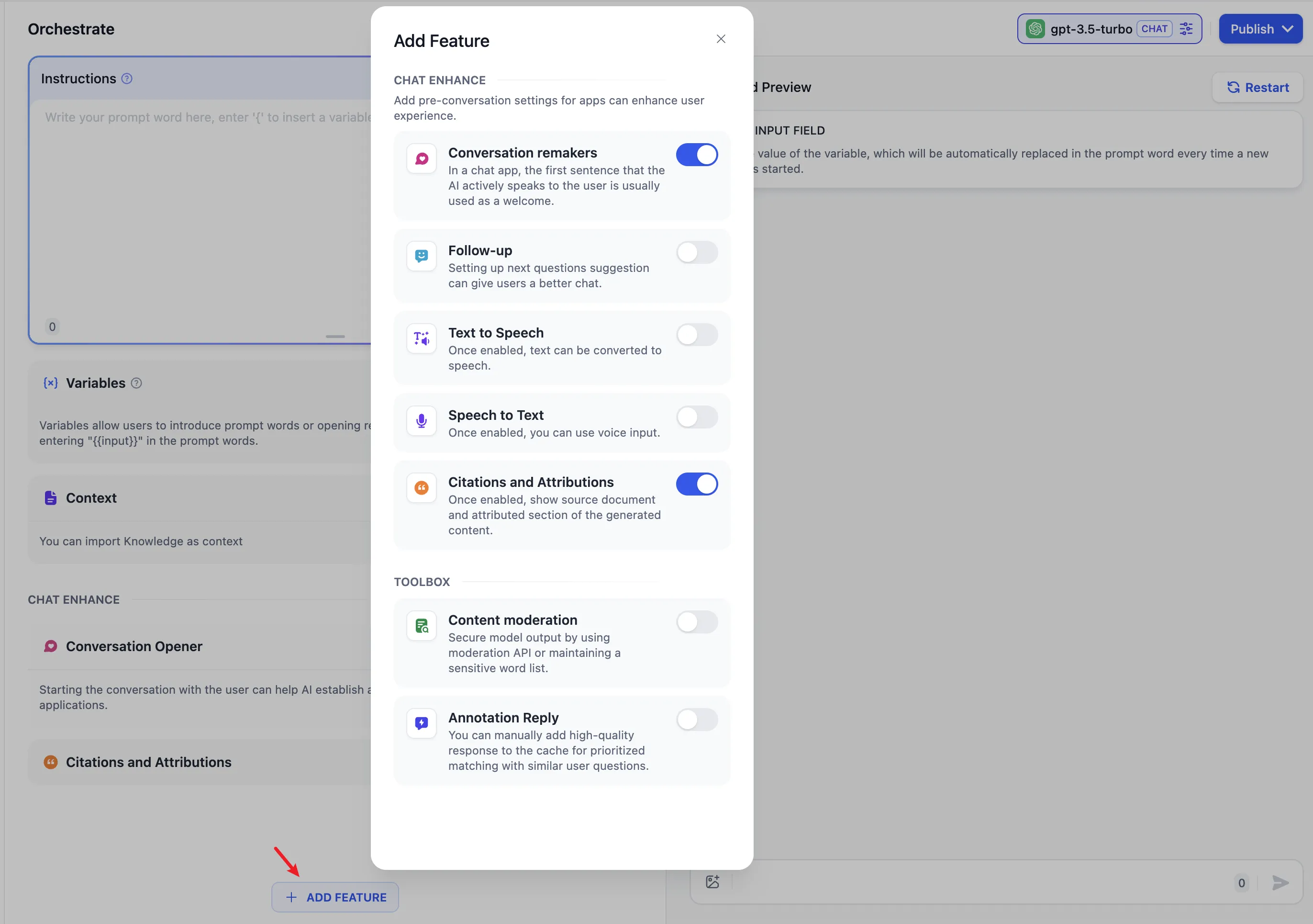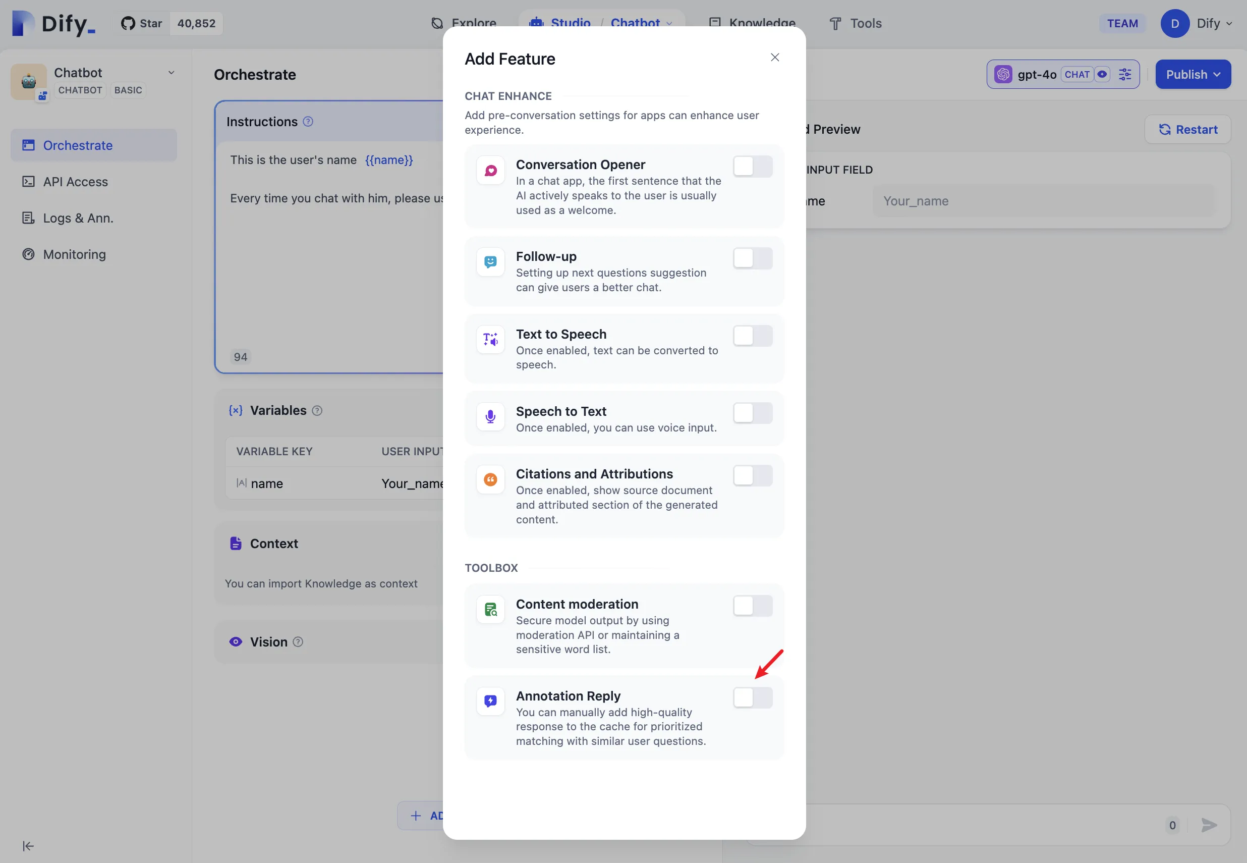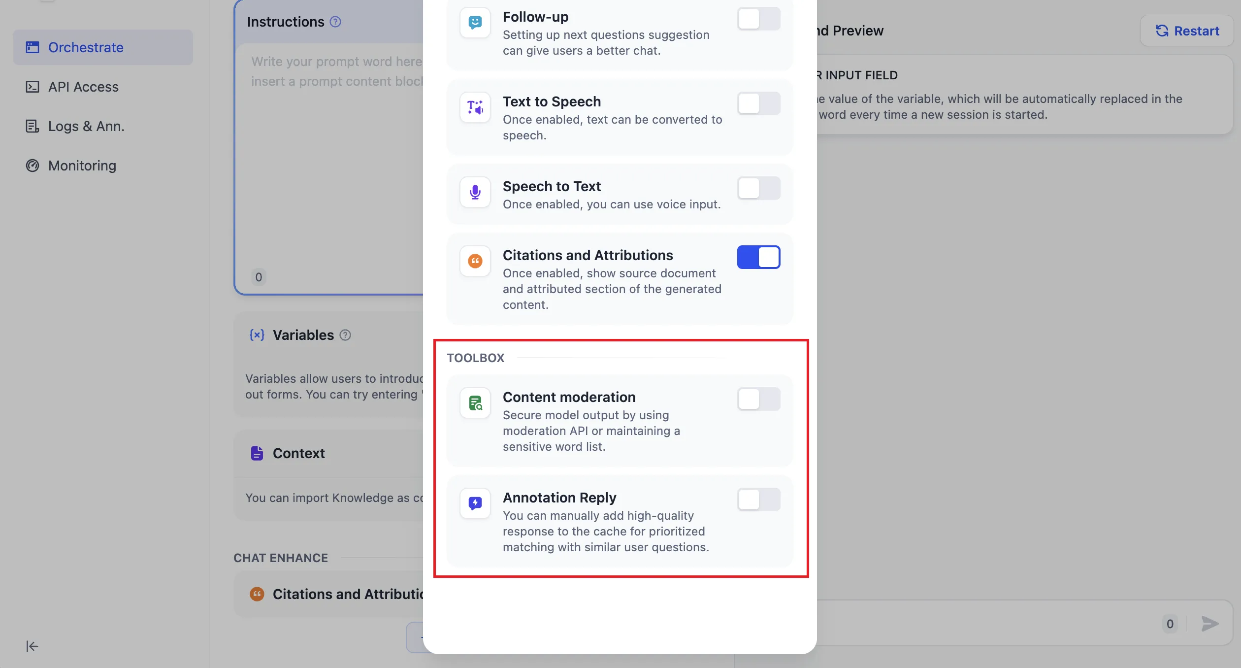 Enable the annotated replies switch by navigating to **“Orchestrate -> Add Features”**: