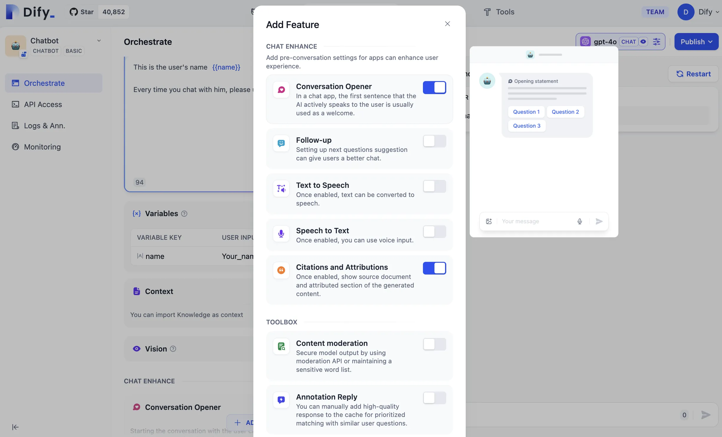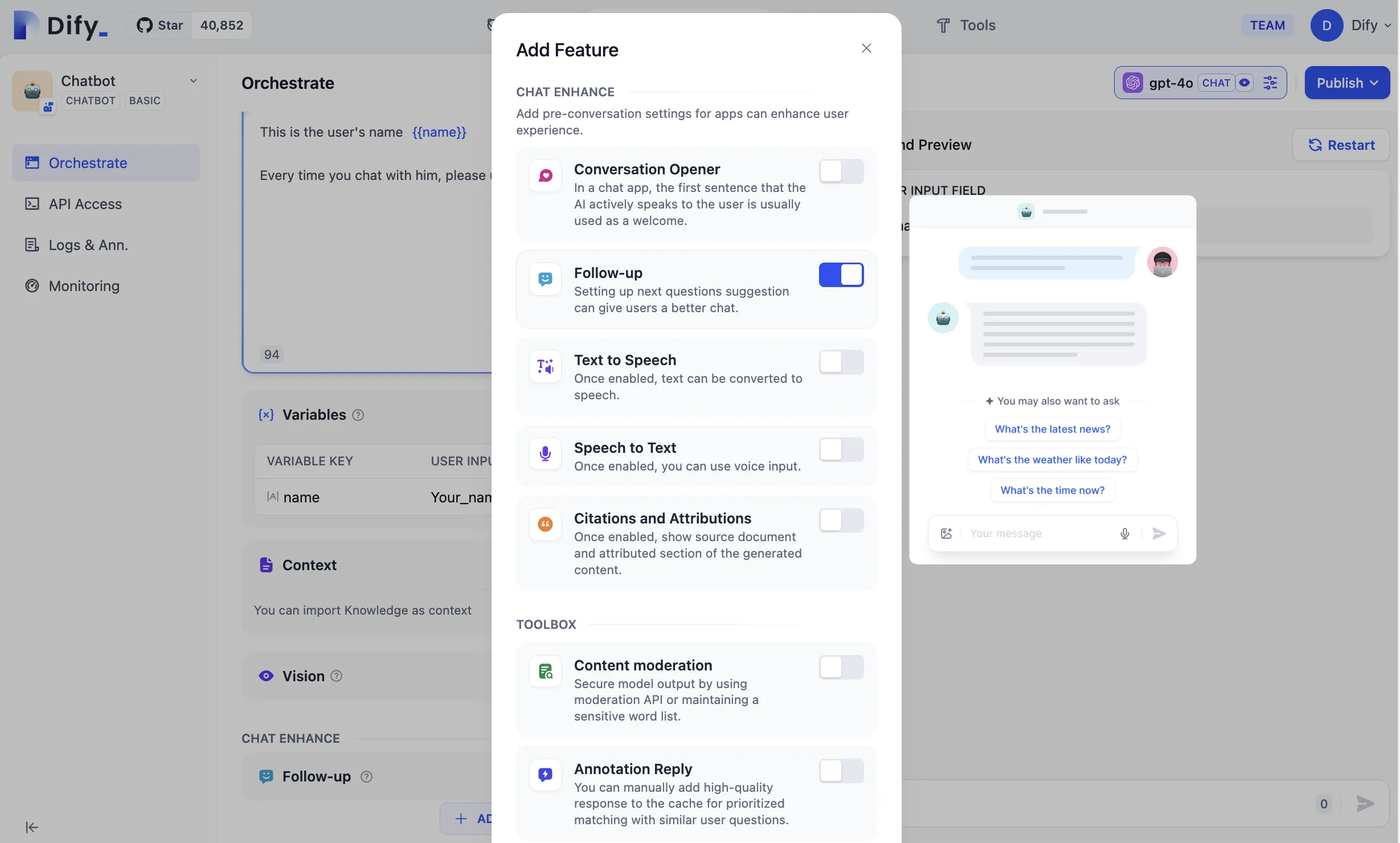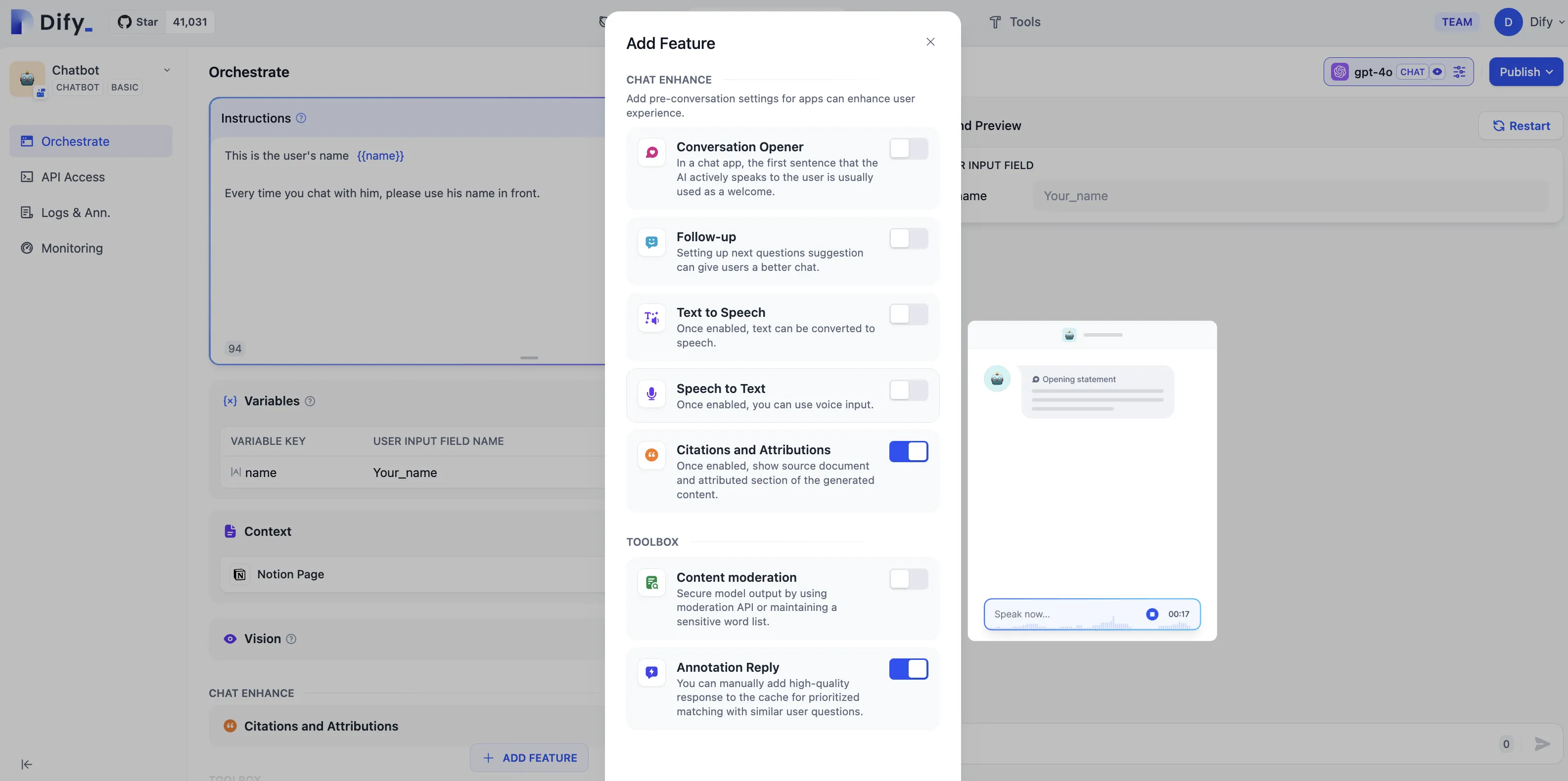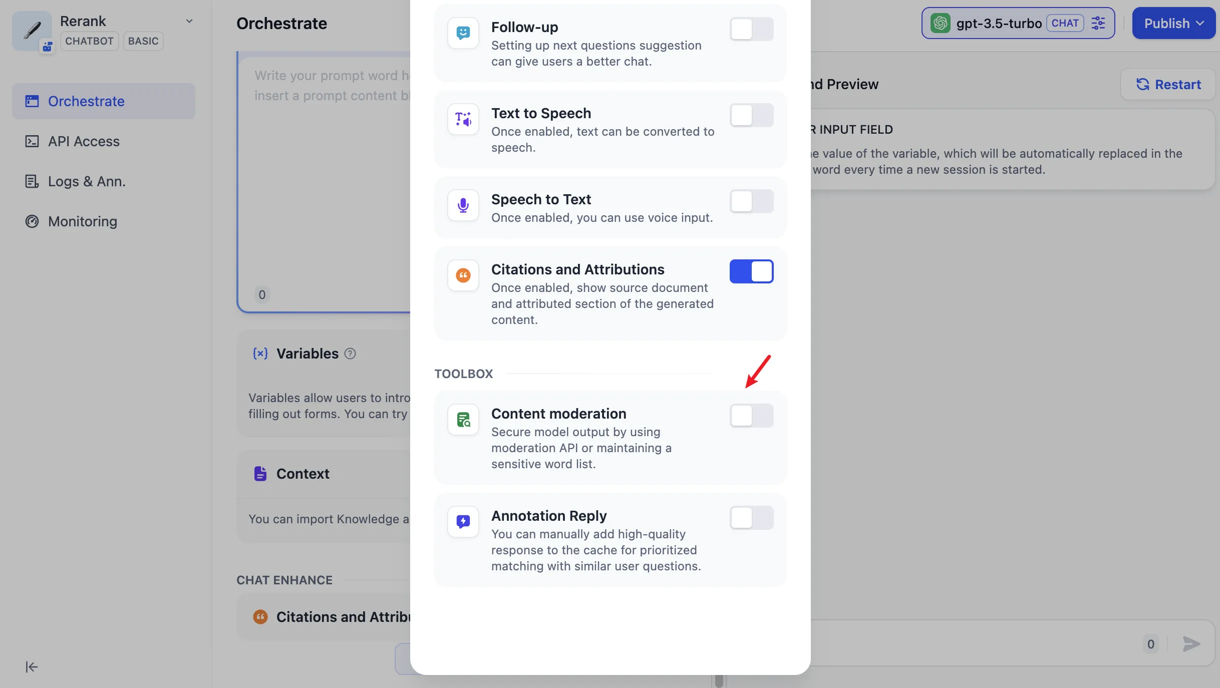 Enable the annotated replies switch by navigating to **“Orchestrate -> Add Features”**: