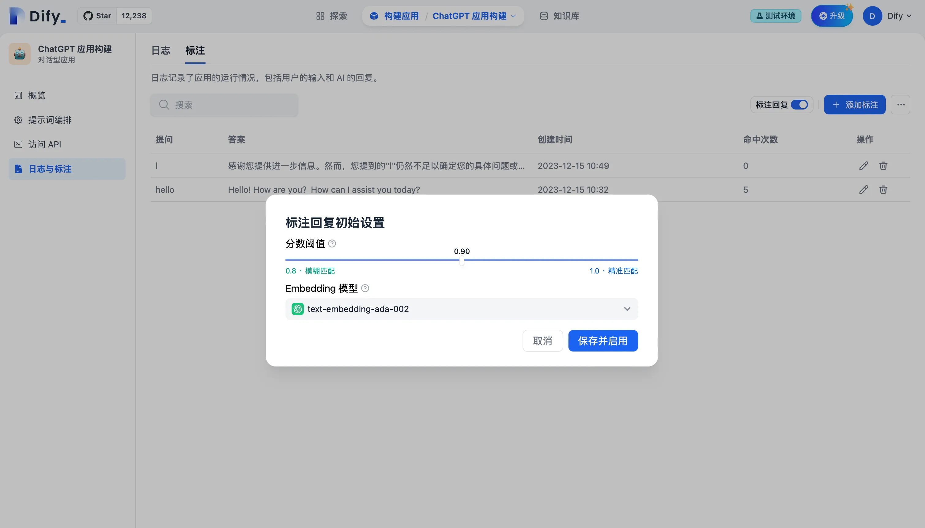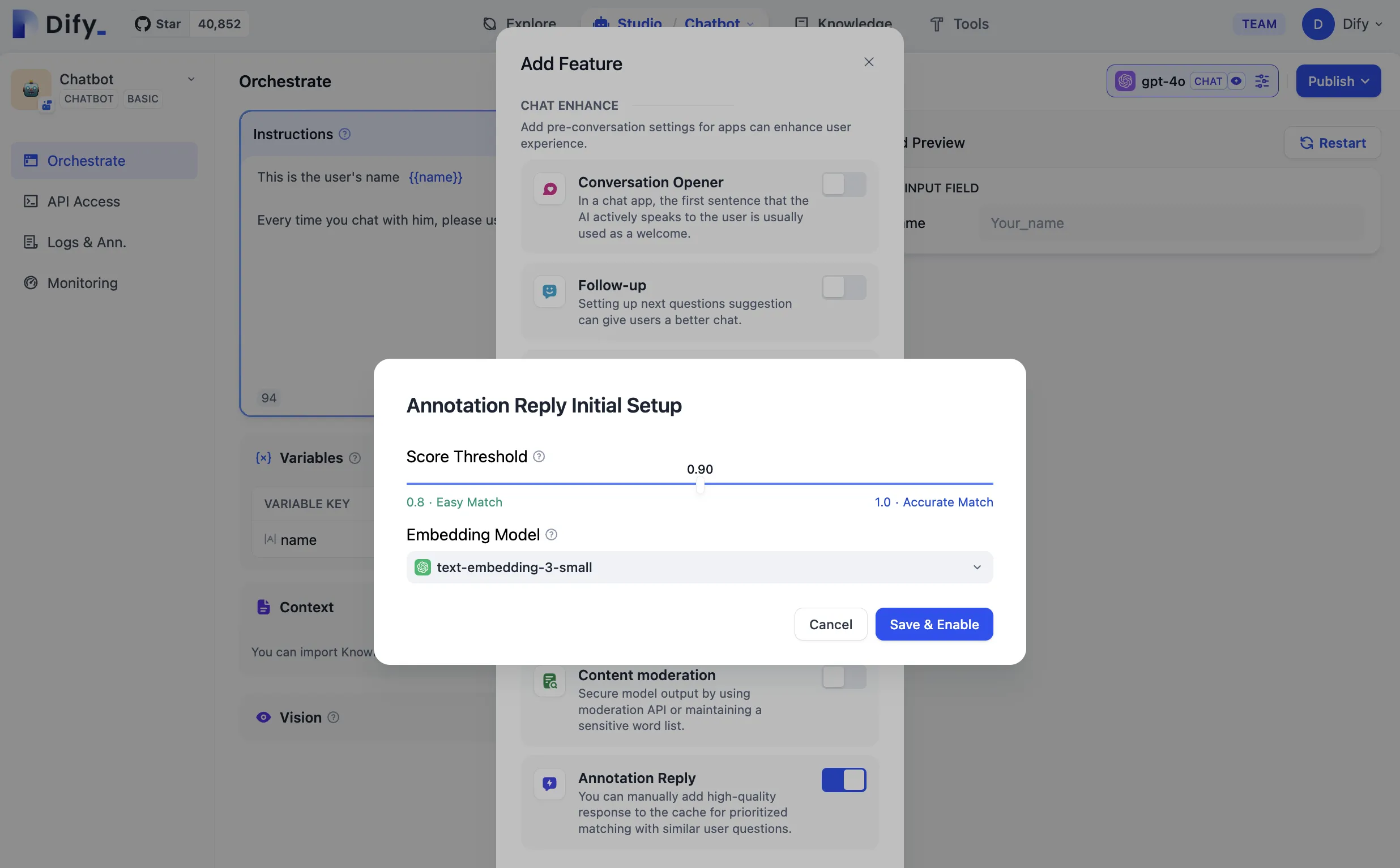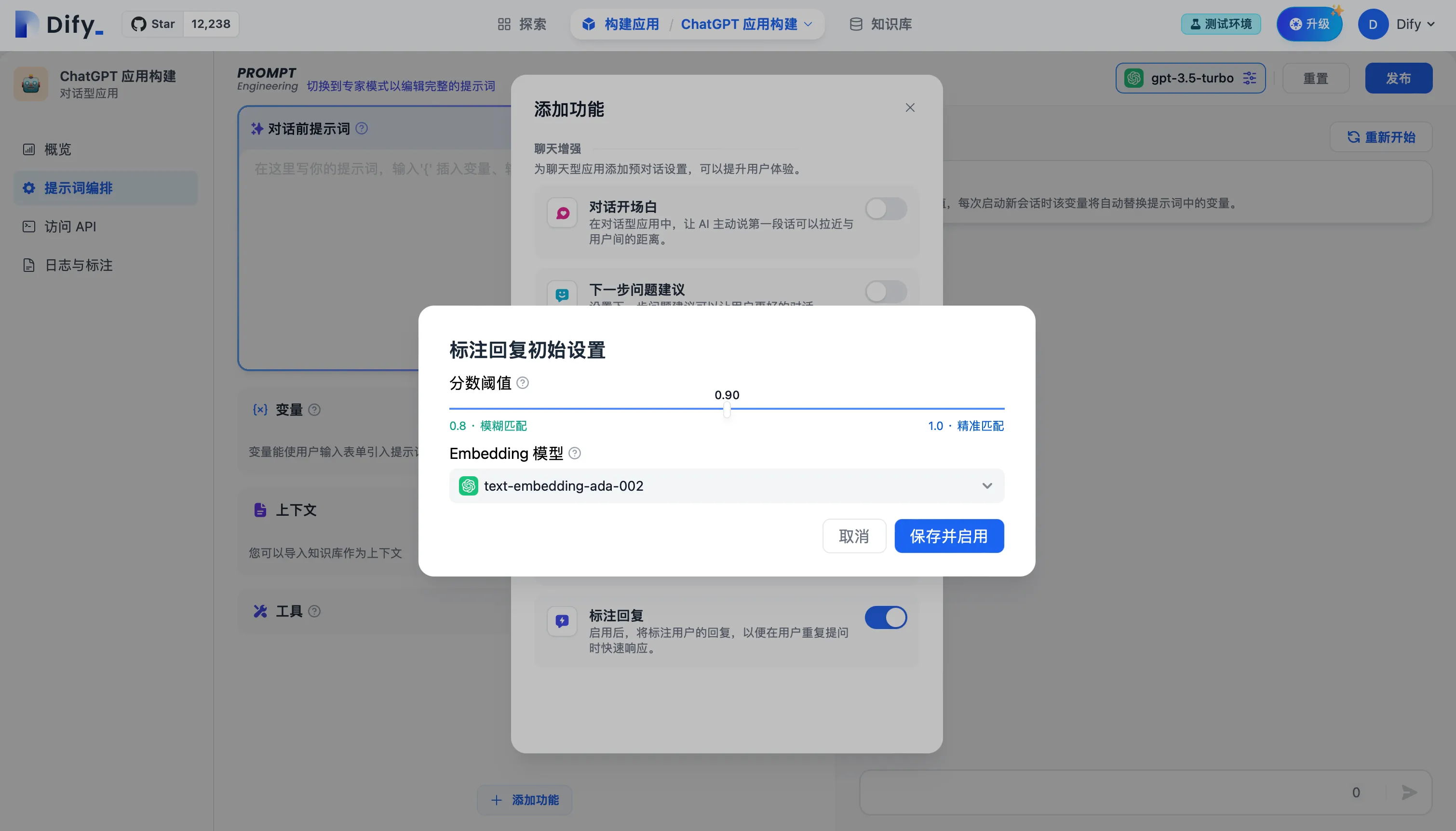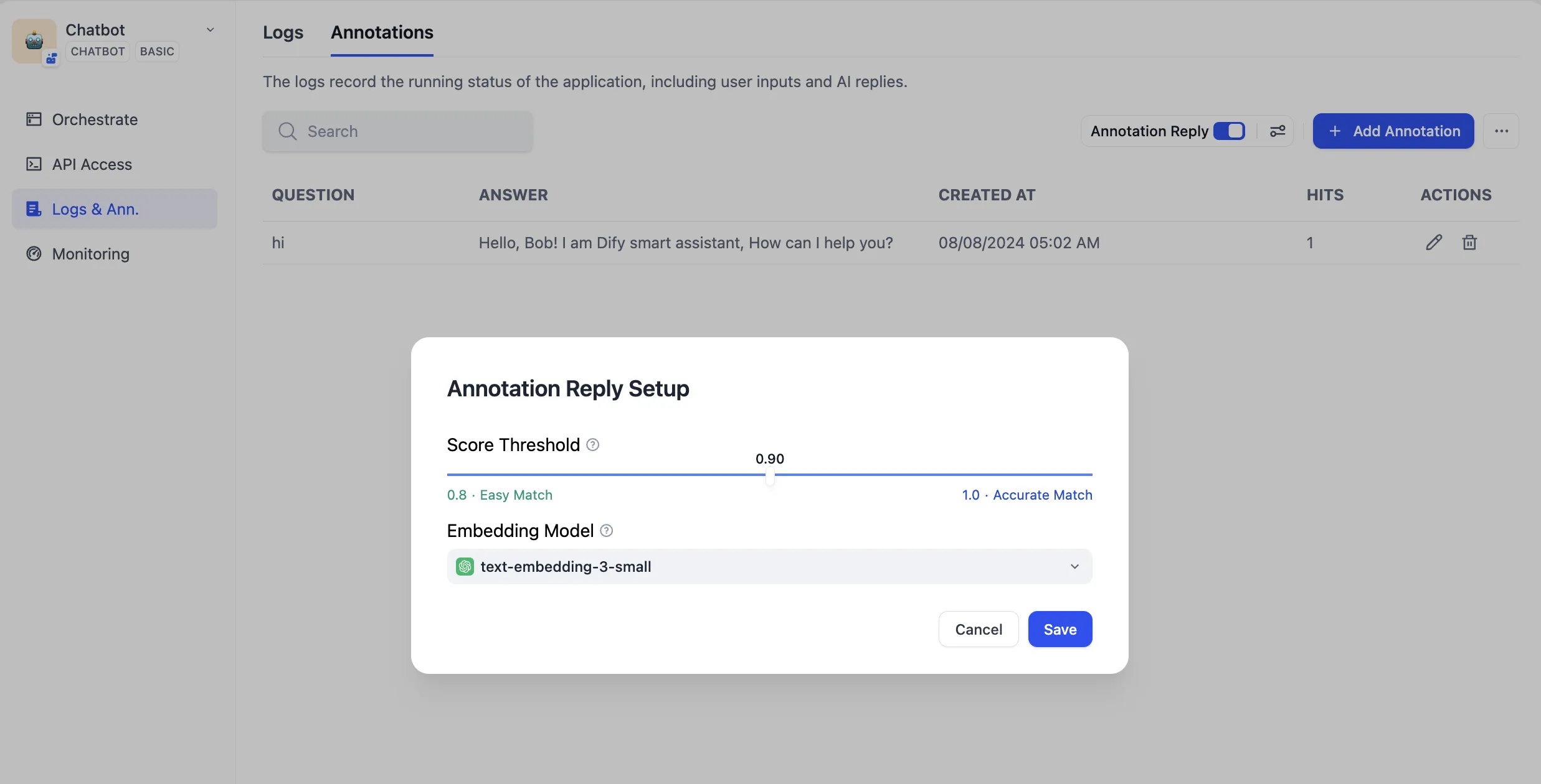 When enabling, you need to set the parameters for annotated replies, which include: Score Threshold and Embedding Model.