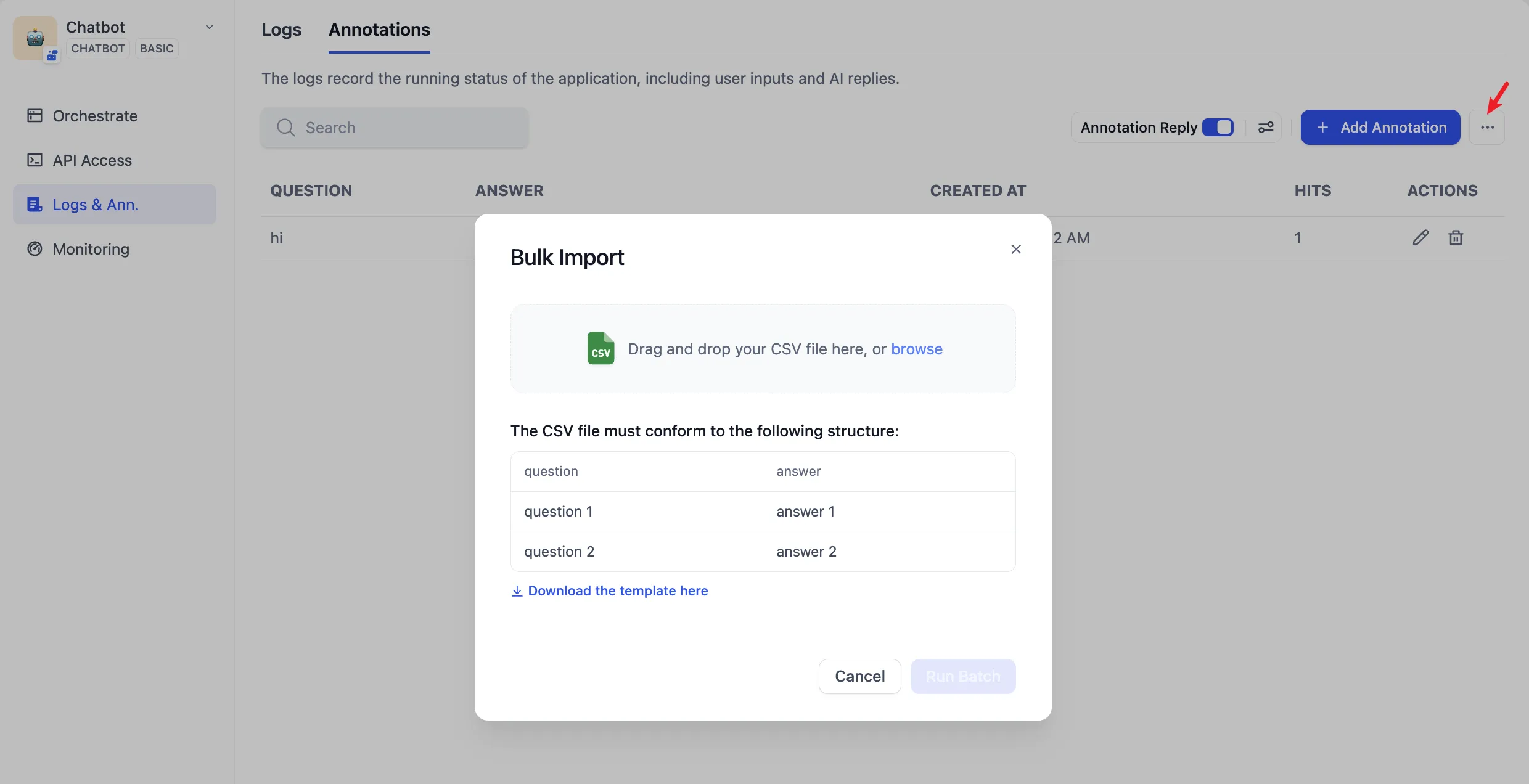 In the bulk import feature, you can download the annotation import template, edit the annotated Q\&A pairs according to the template format, and then import them in bulk.
