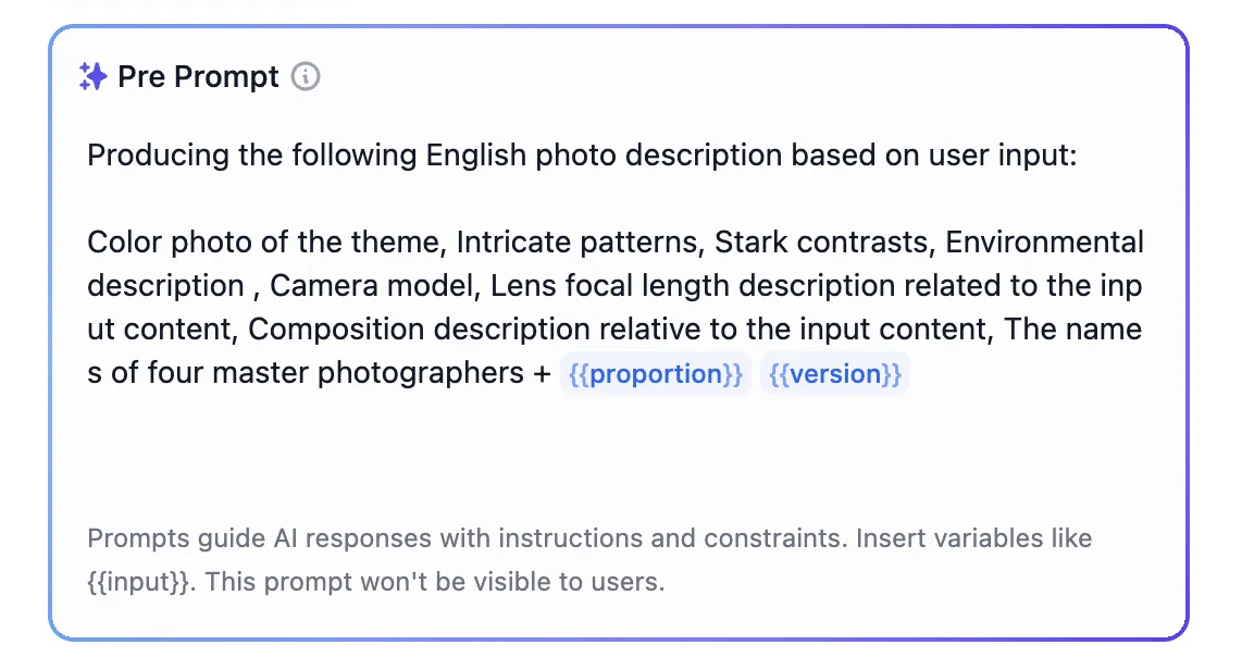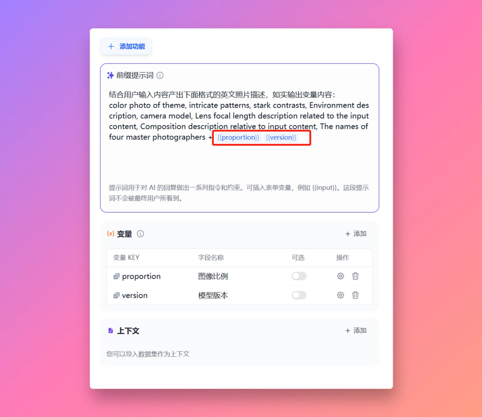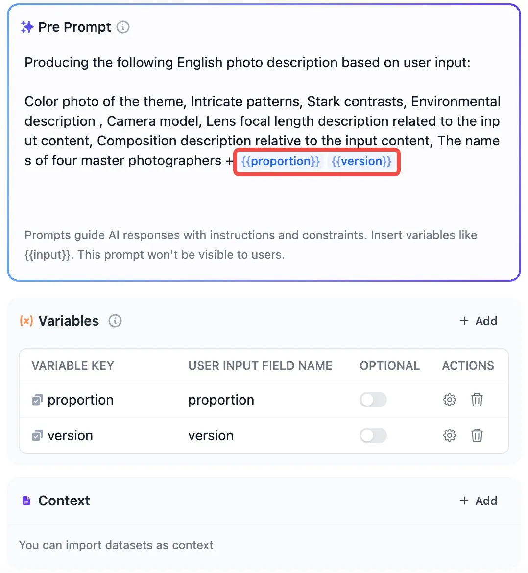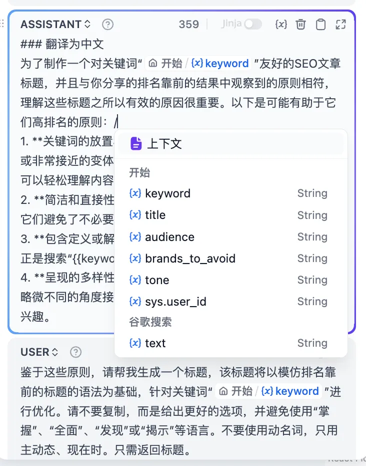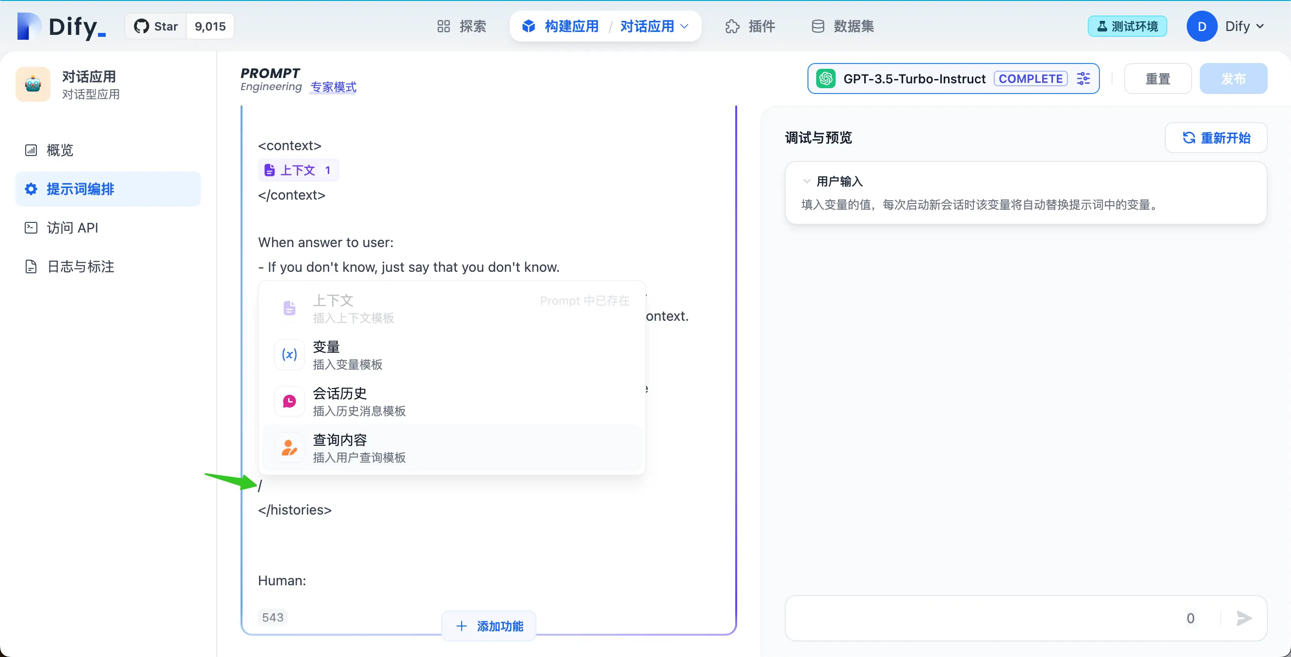 除“`变量`”以外的其他内容块不可重复插入。在不同应用和模型下,可插入的内容块会根据不同的提示词模板结构有所区别,`会话历史`、`查询内容` 仅在对话型应用的文本补全模型中可用。