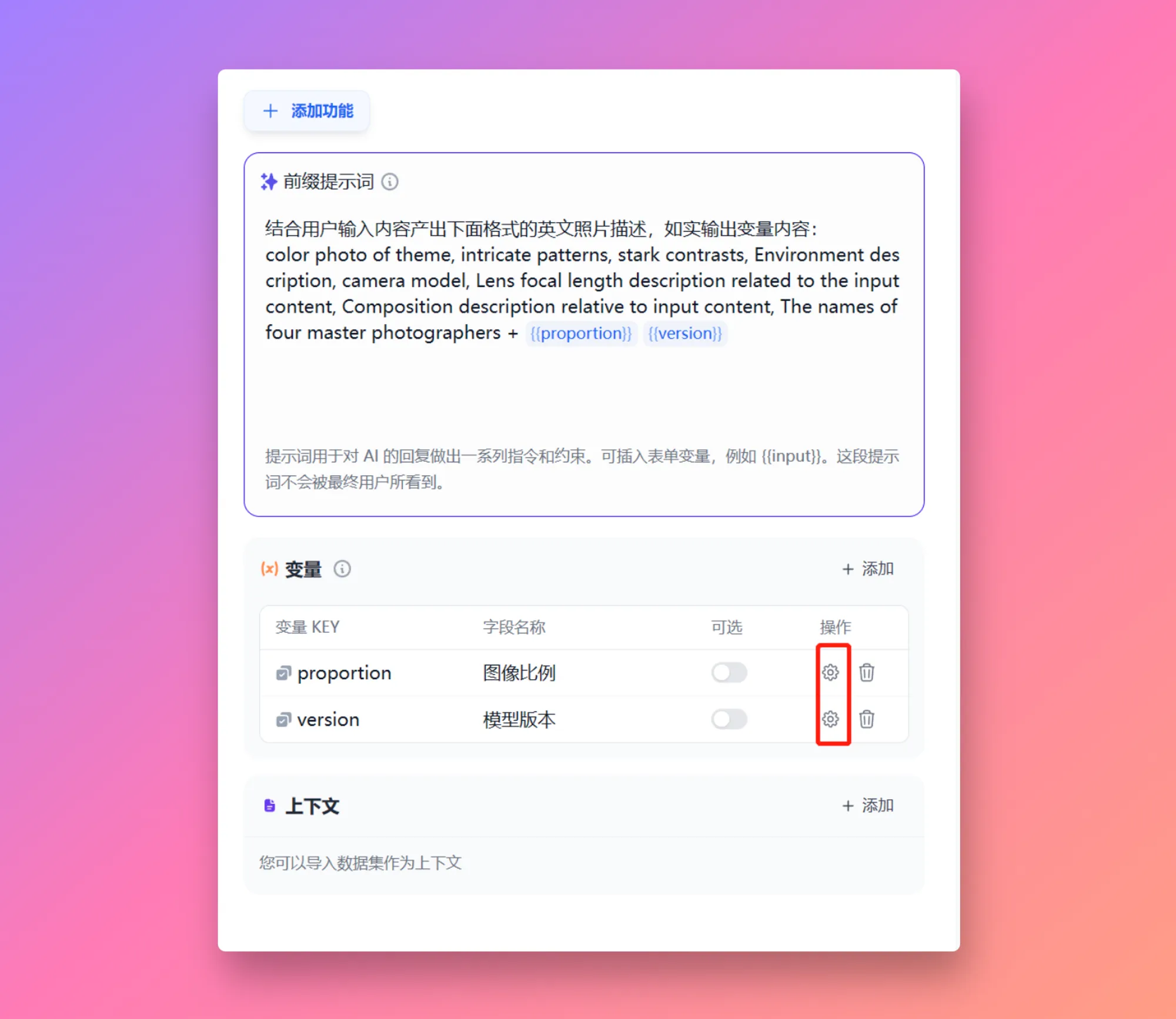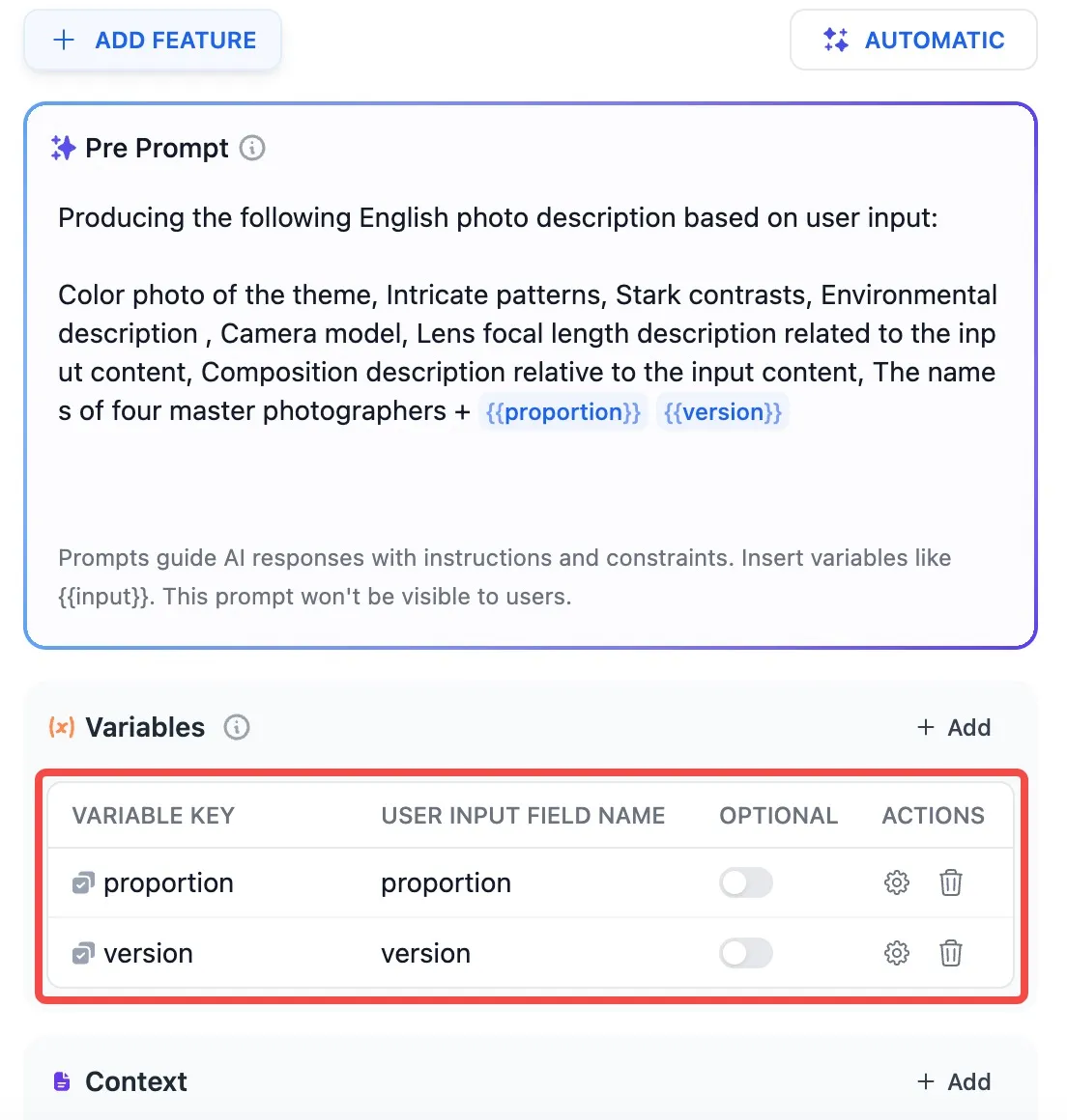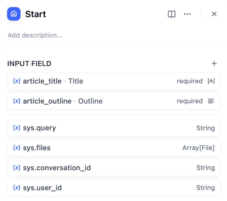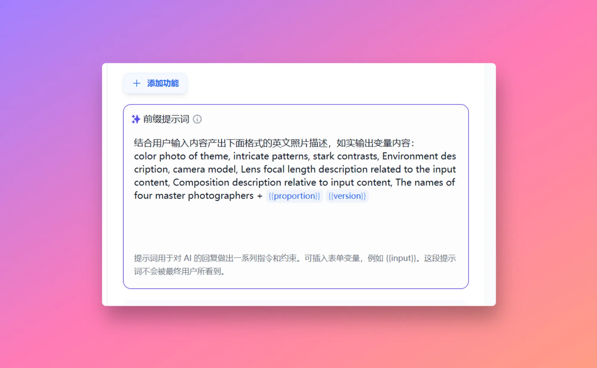 除“`变量`”以外的其他内容块不可重复插入。在不同应用和模型下,可插入的内容块会根据不同的提示词模板结构有所区别,`会话历史`、`查询内容` 仅在对话型应用的文本补全模型中可用。