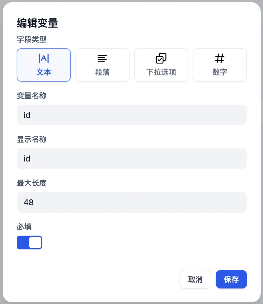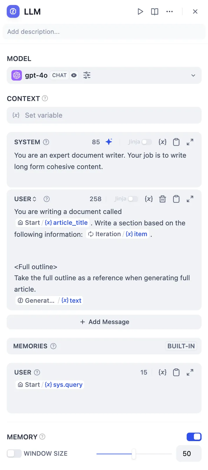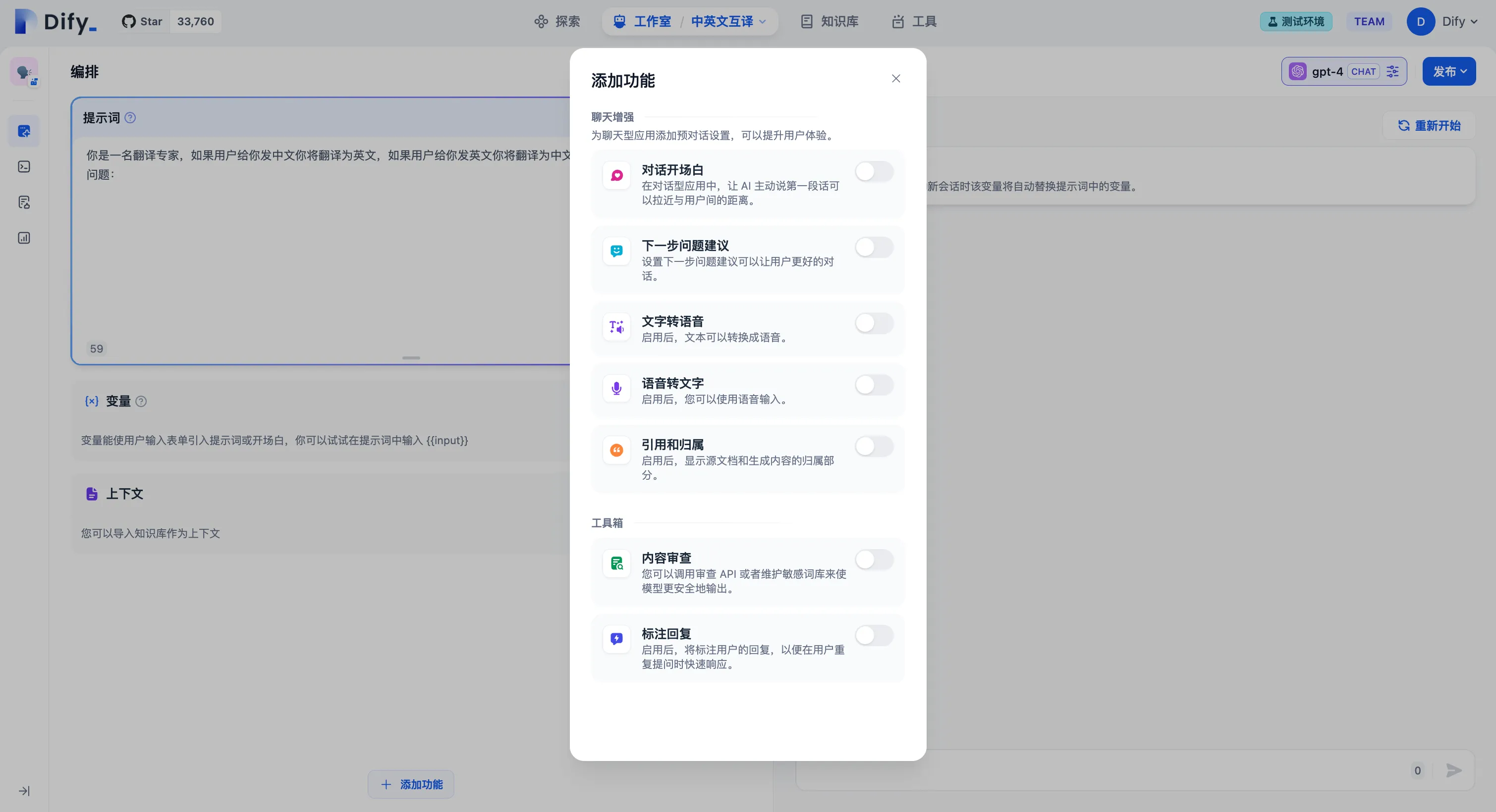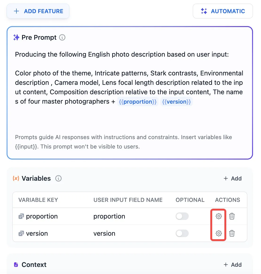 除“`变量`”以外的其他内容块不可重复插入。在不同应用和模型下,可插入的内容块会根据不同的提示词模板结构有所区别,`会话历史`、`查询内容` 仅在对话型应用的文本补全模型中可用。