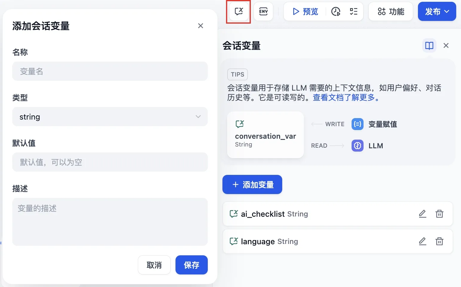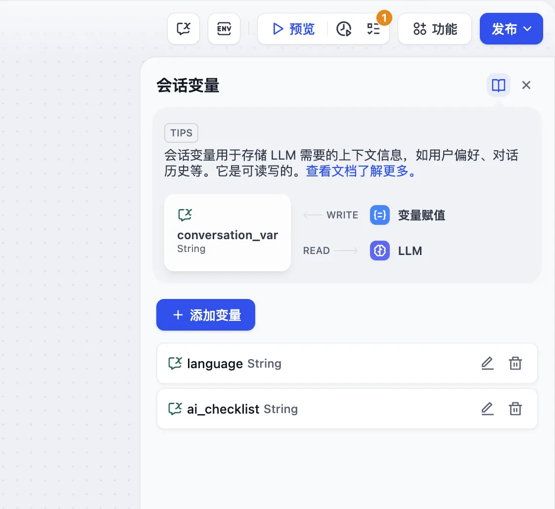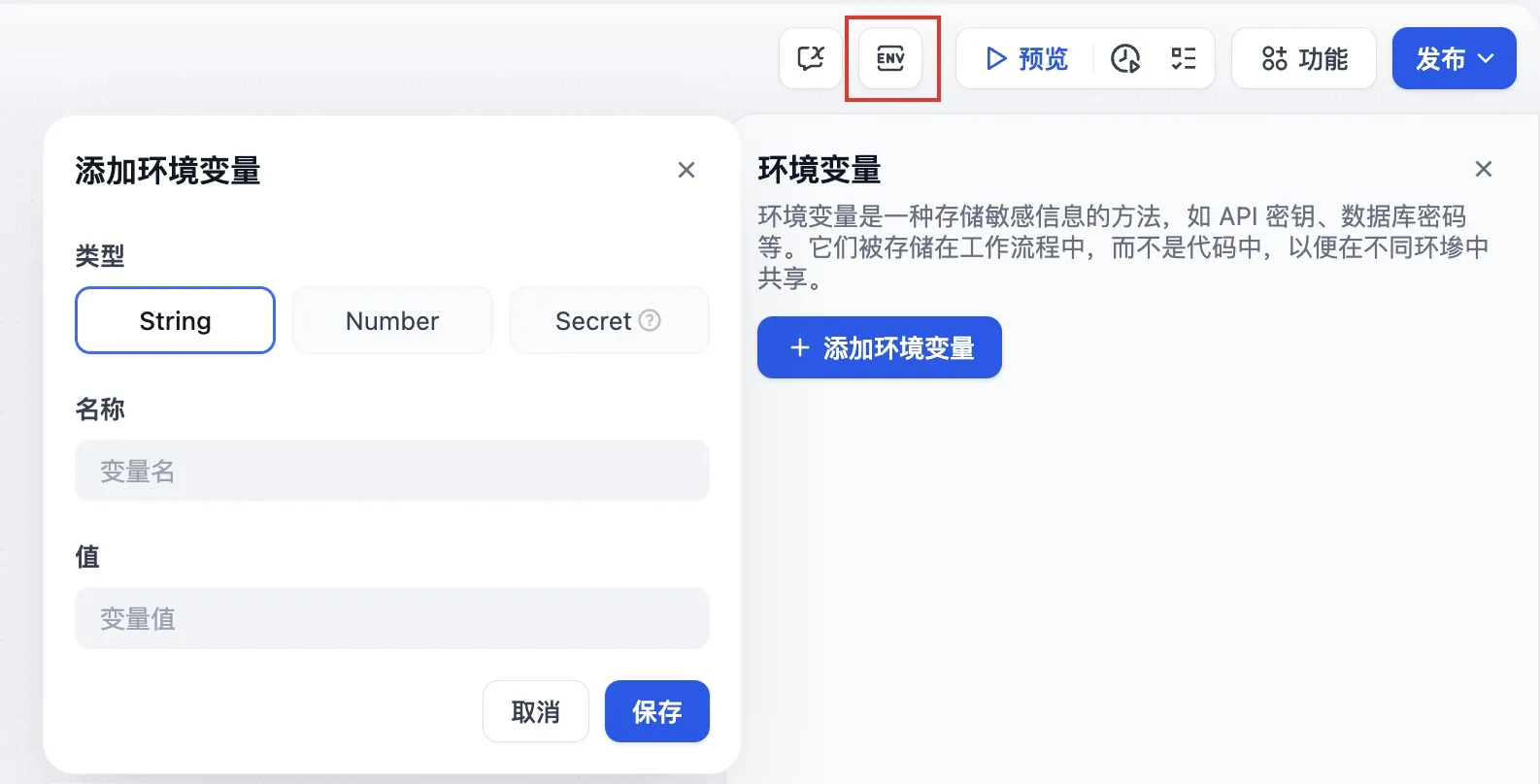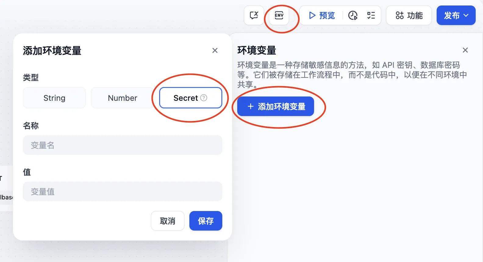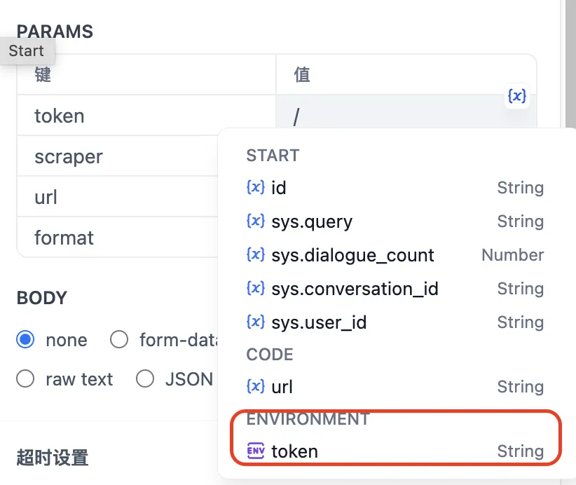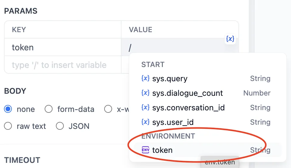 Importantly, it is best not to directly enter the token value as plain text for security reasons, as this is not a good practice. Actually, in the latest version of Dify, we can set token values in **`Environment Variables`**. Click `env` - `Add Variable` to set the token value, so plain text will not appear in the node.