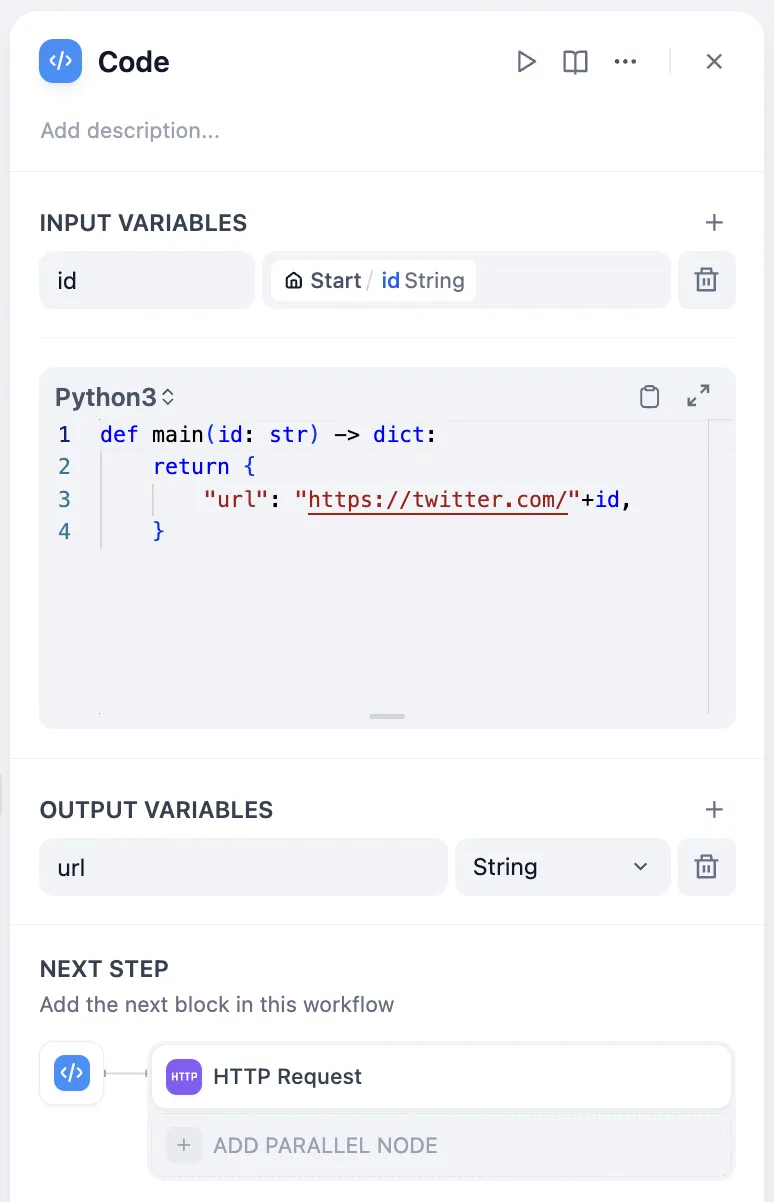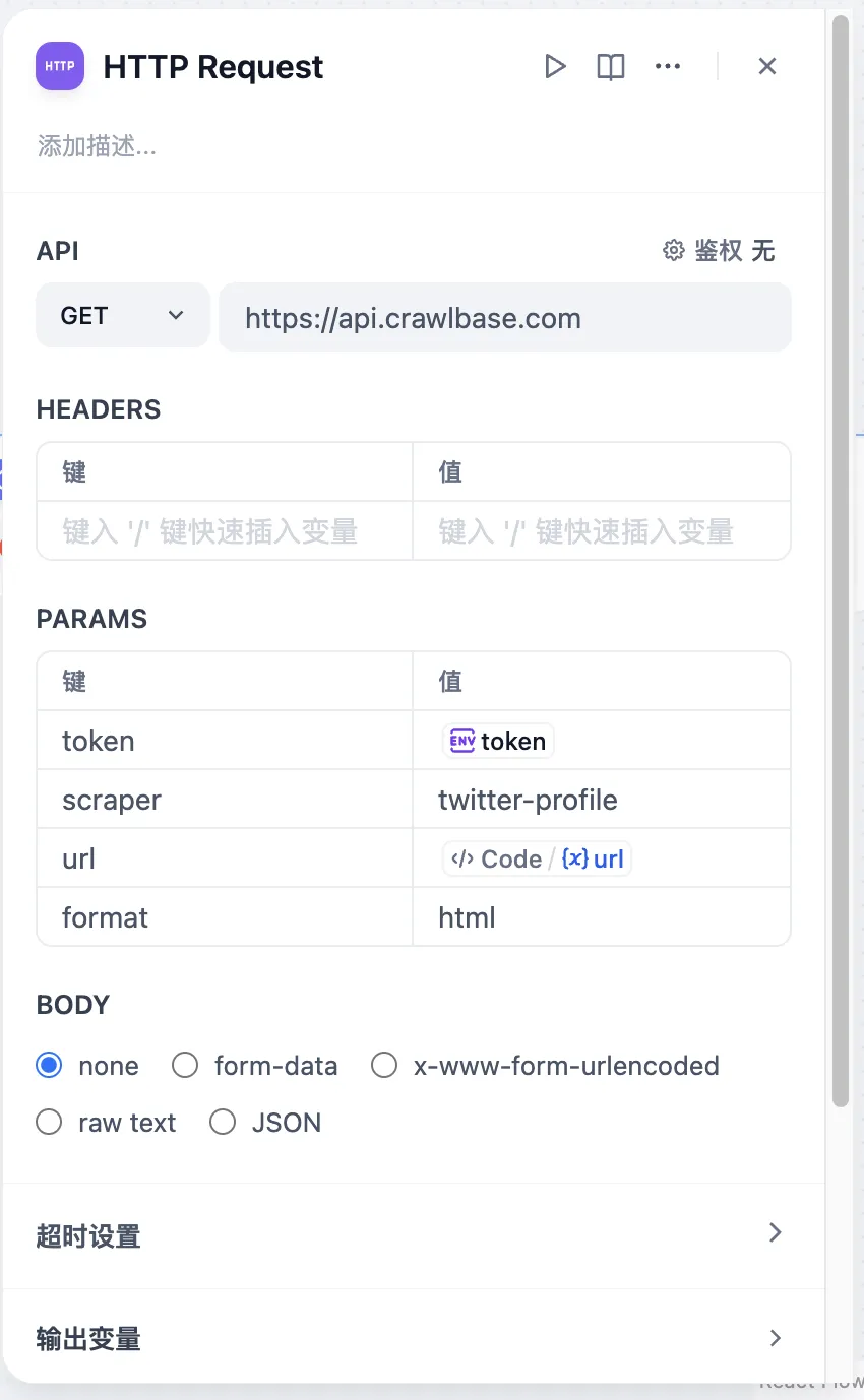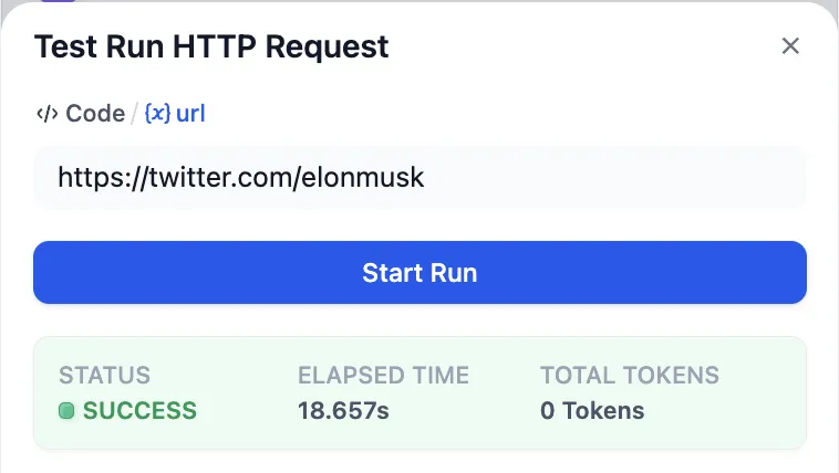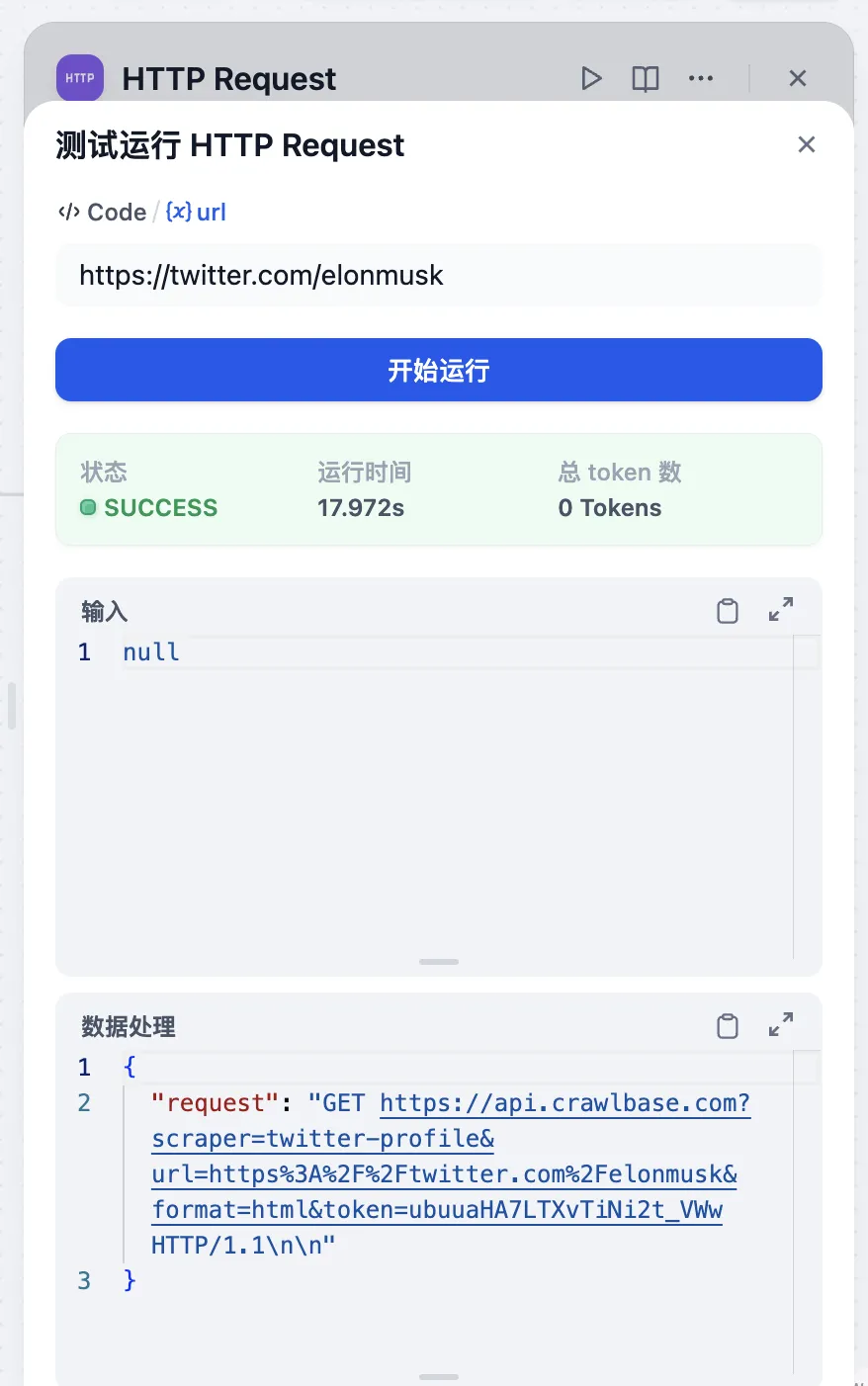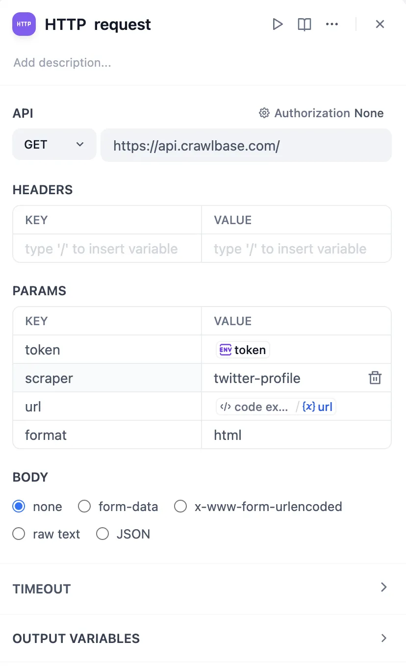 Based on the [Crawlbase docs](https://crawlbase.com/docs/crawling-api/scrapers/#twitter-profile), to scrape a Twitter user’s profile in http format, we need to complete HTTP request node in the following format: