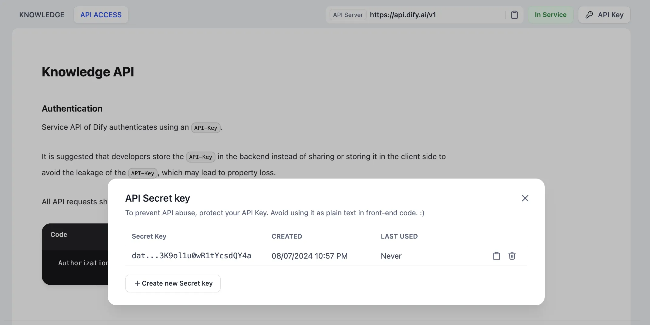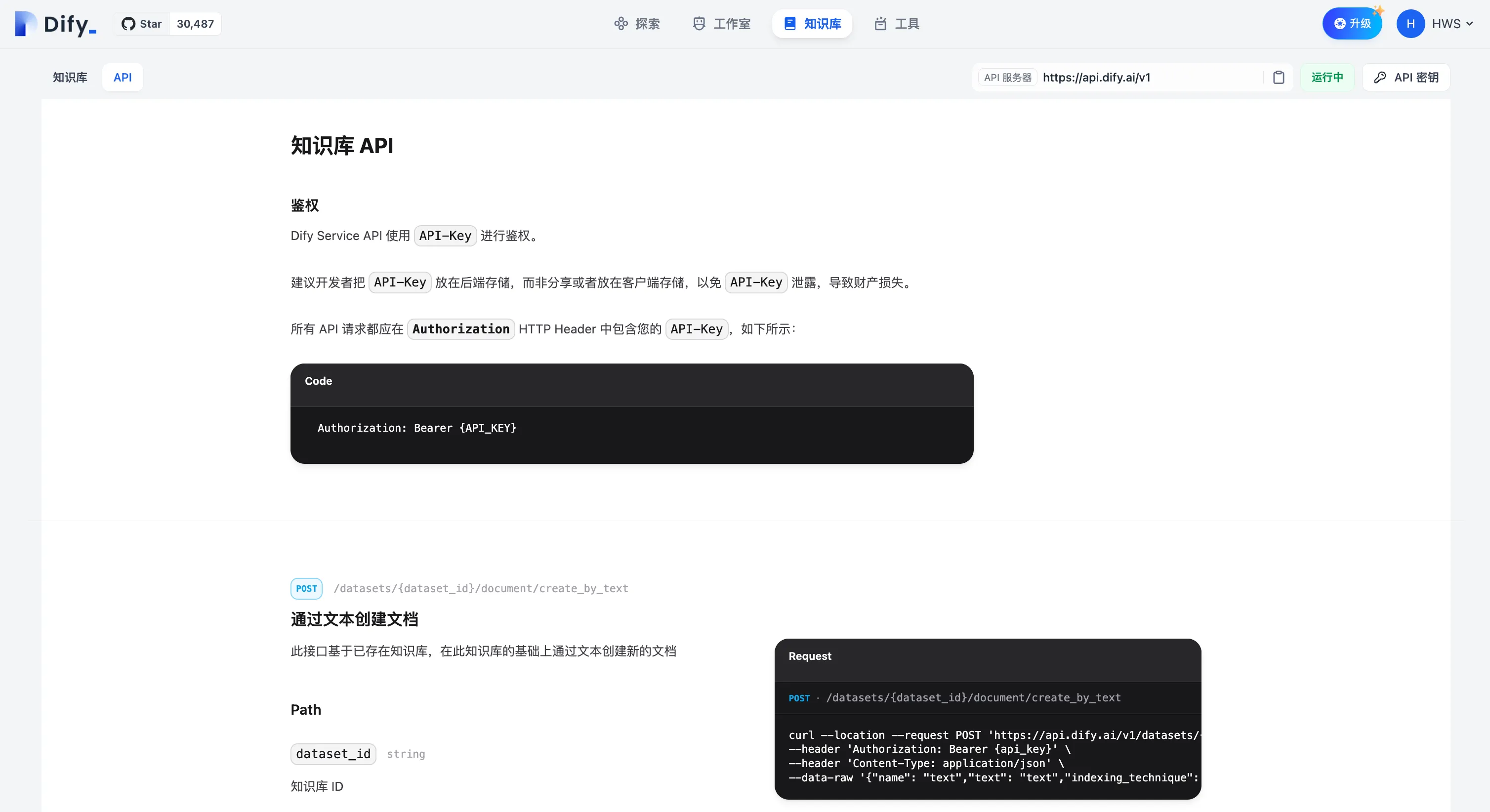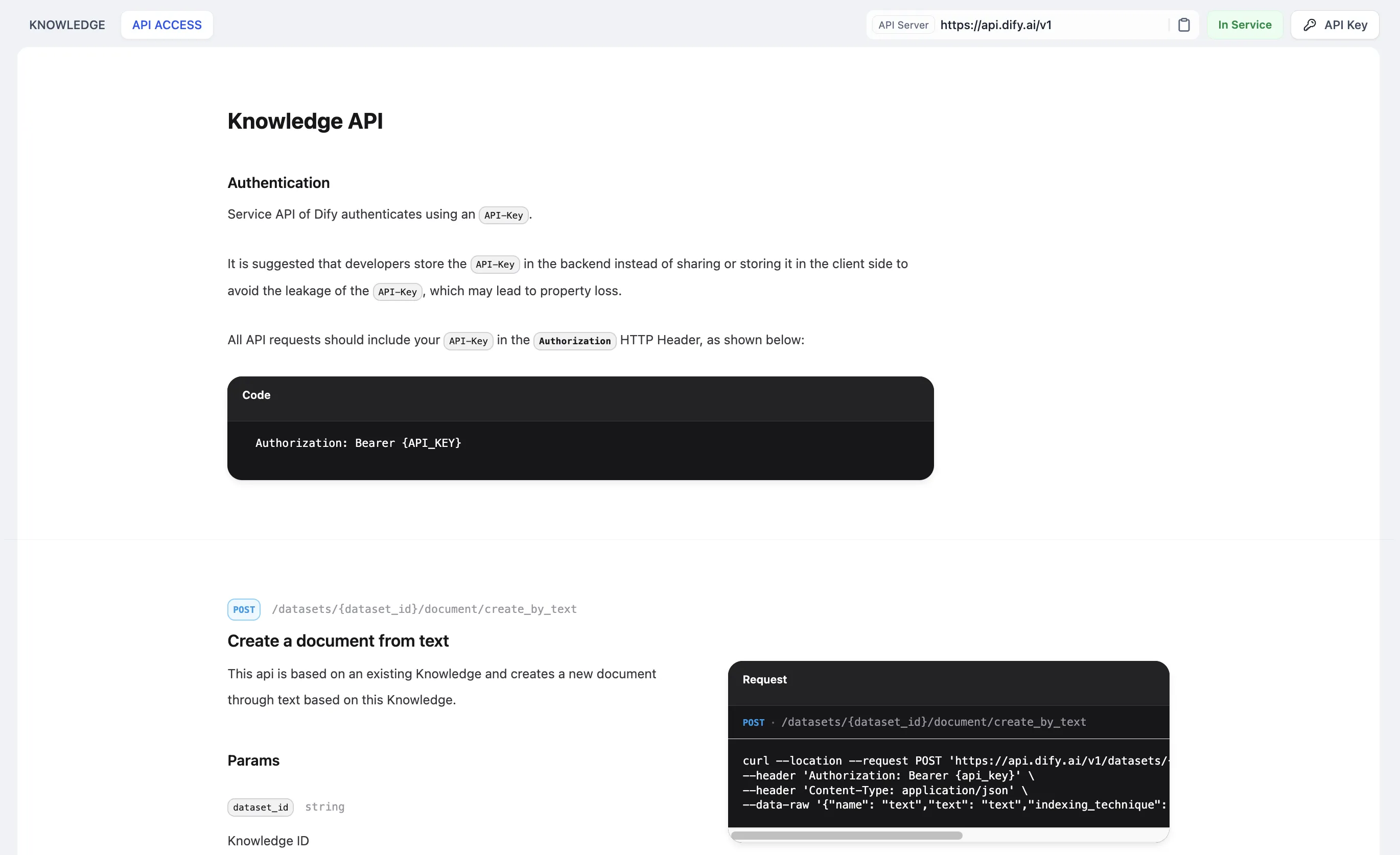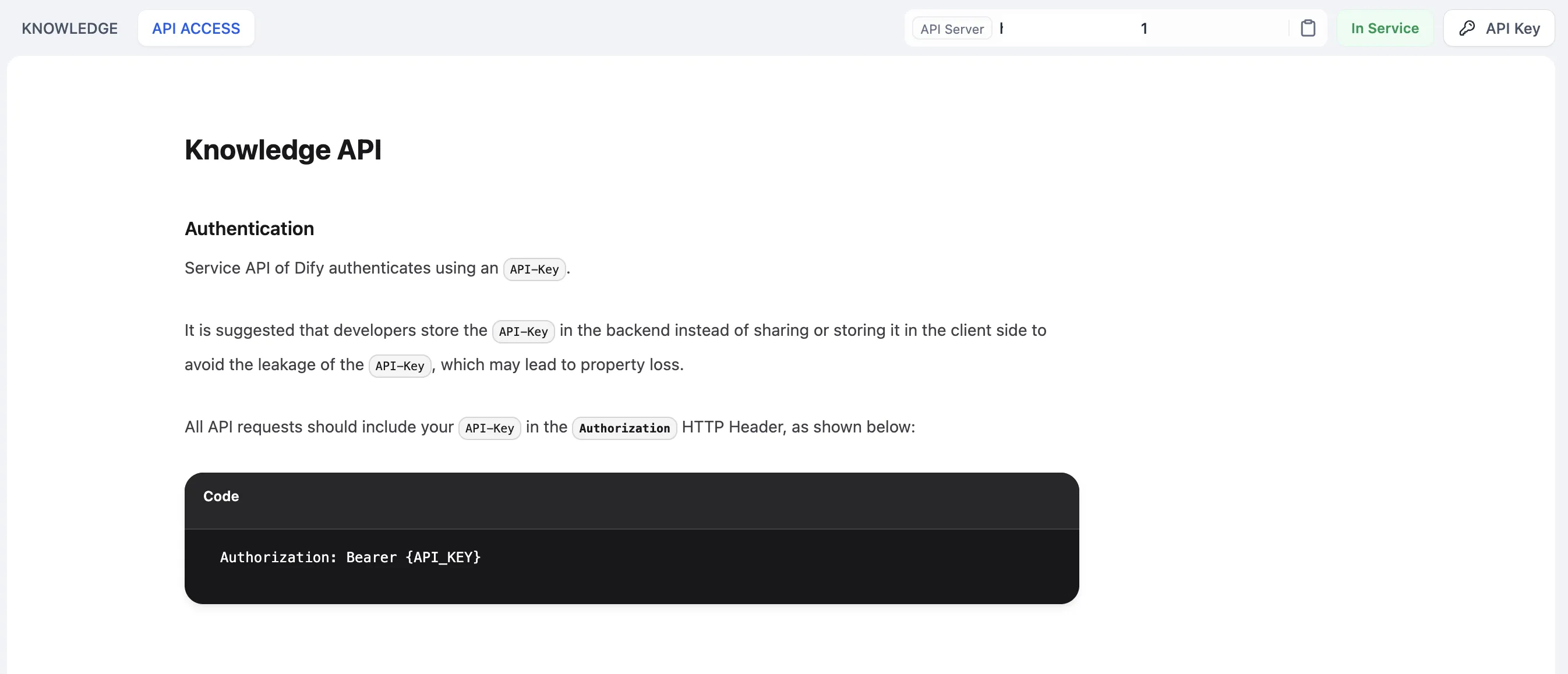 ナレッジページに移動し、左側のナビゲーションでAPIページに切り替えます。このページでは、difyが提供するAPIドキュメントを表示し、ナレッジAPIにアクセスするための認証情報を管理できます。