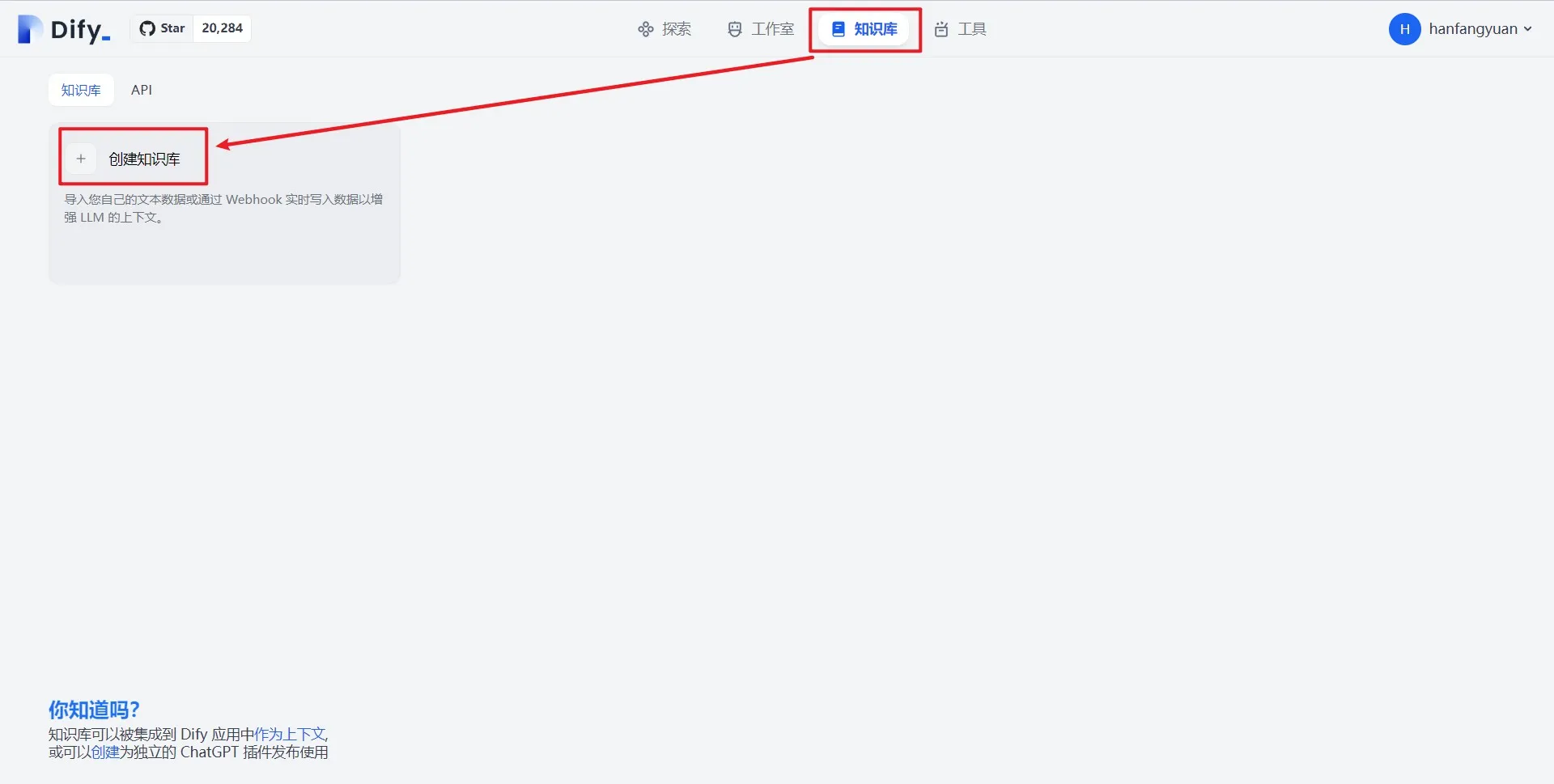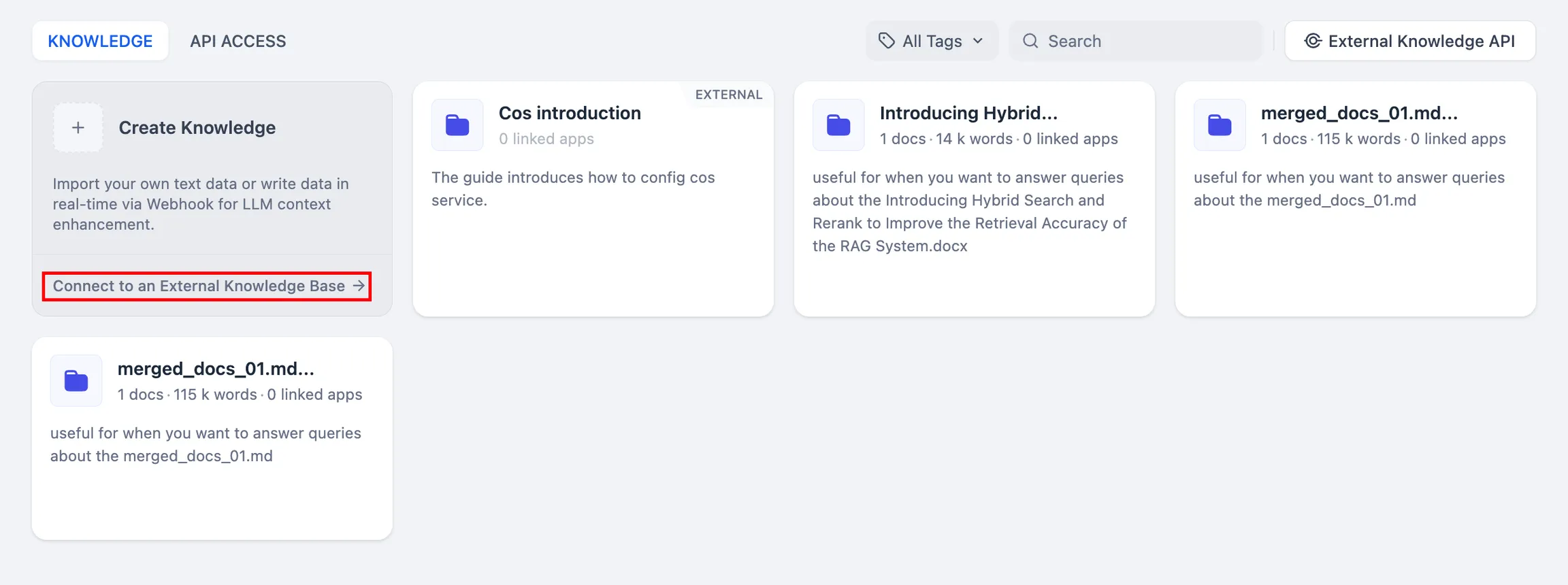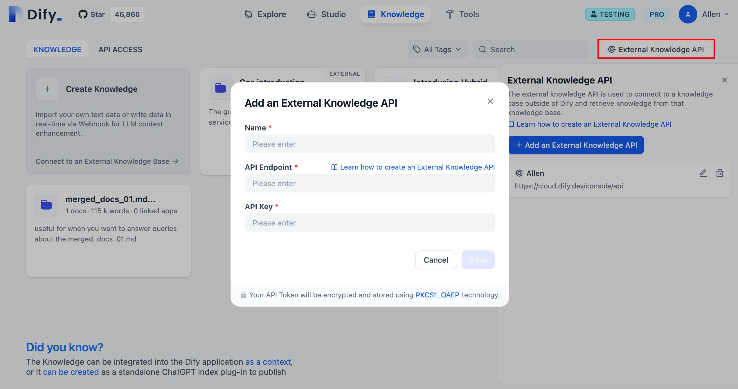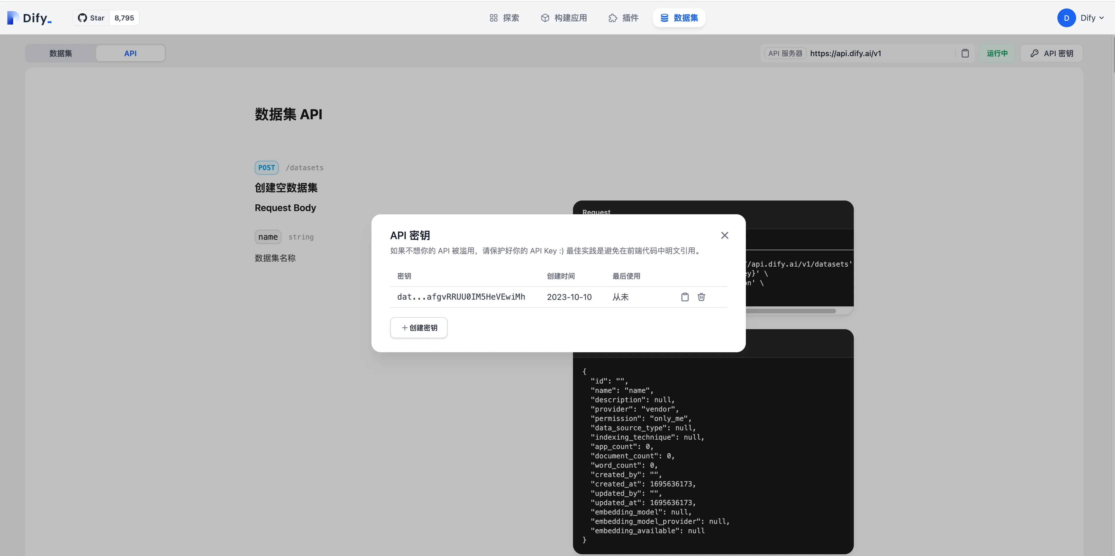 ナレッジページに移動し、左側のナビゲーションでAPIページに切り替えます。このページでは、difyが提供するAPIドキュメントを表示し、ナレッジAPIにアクセスするための認証情報を管理できます。
