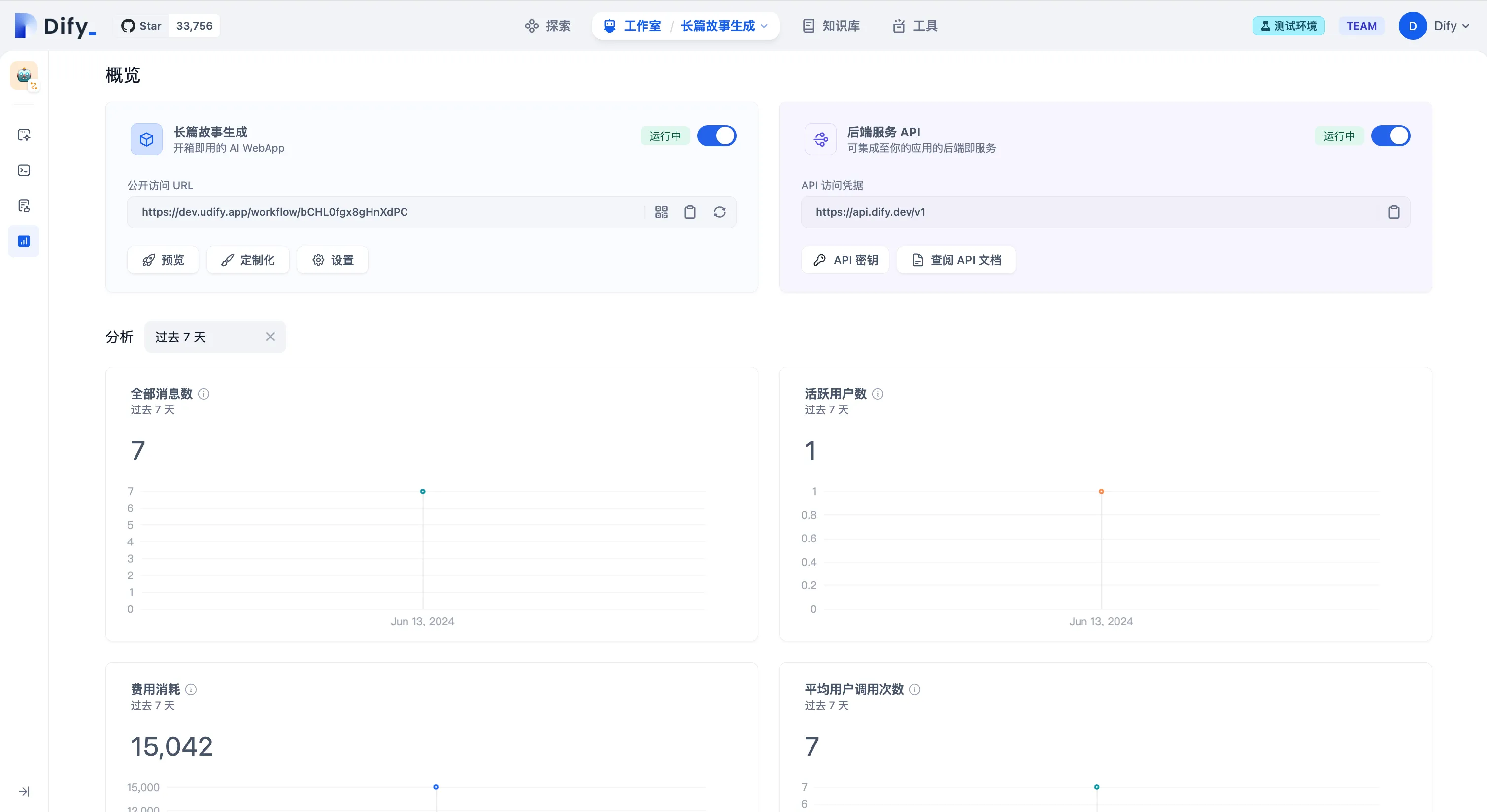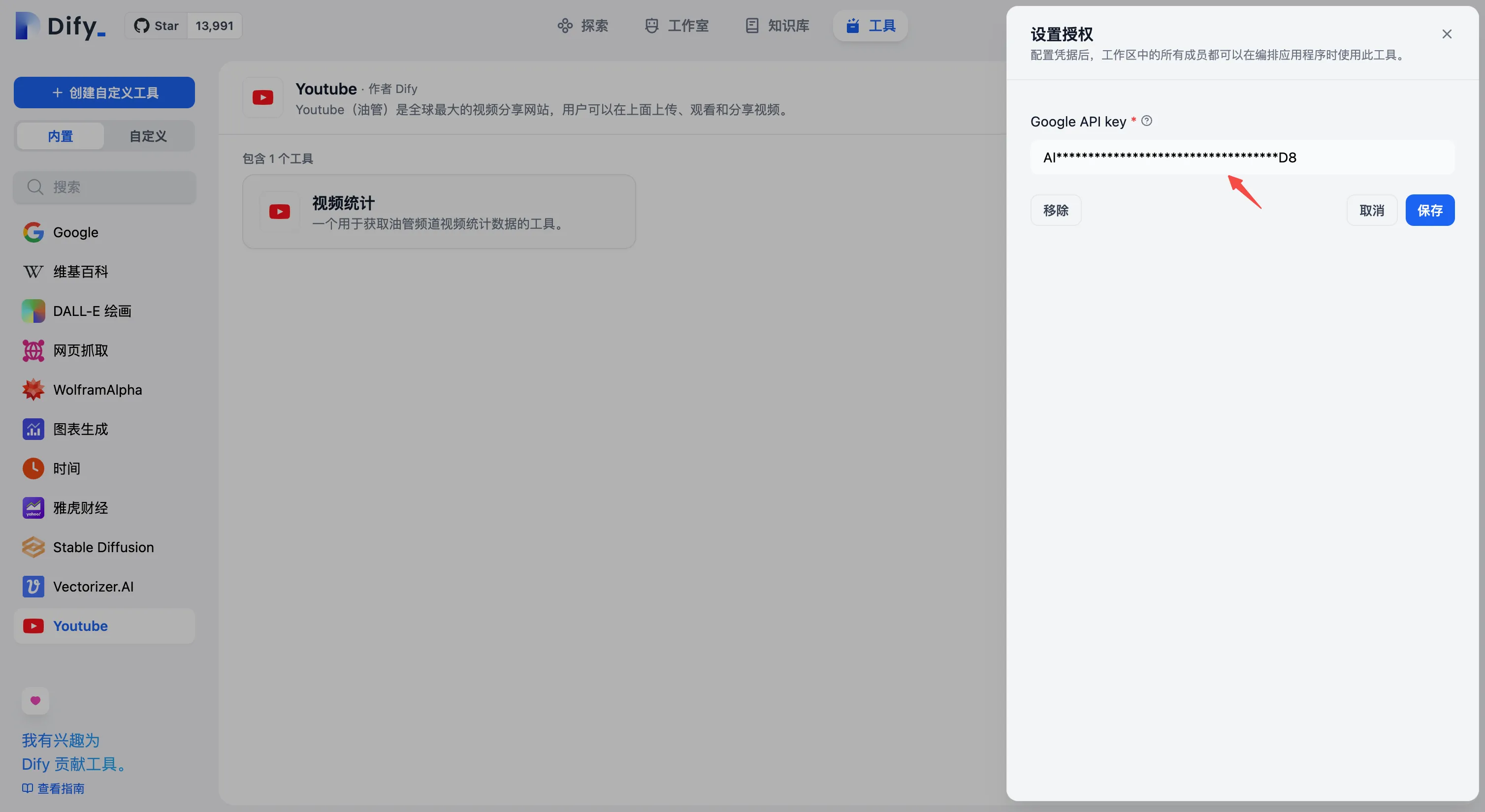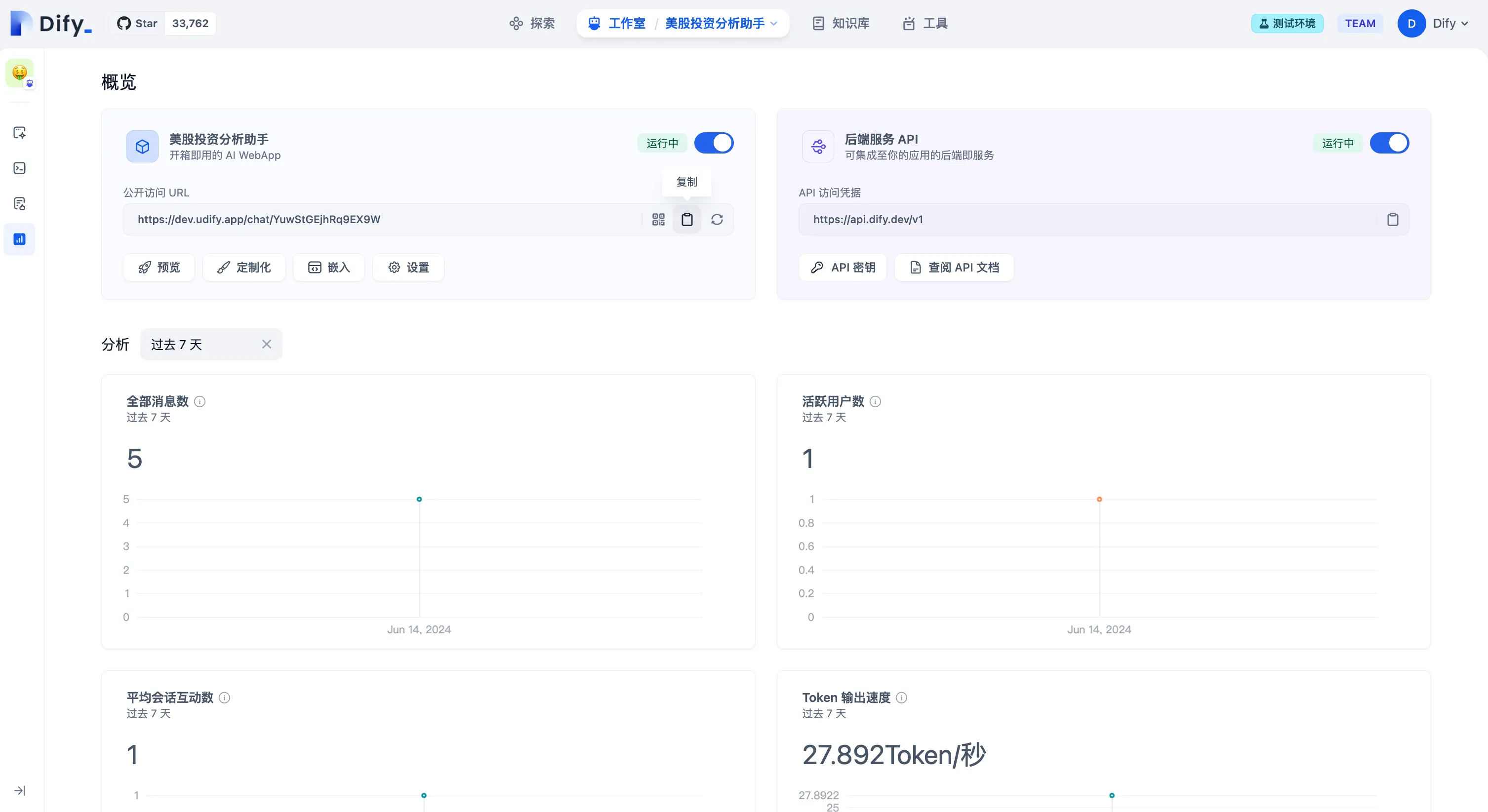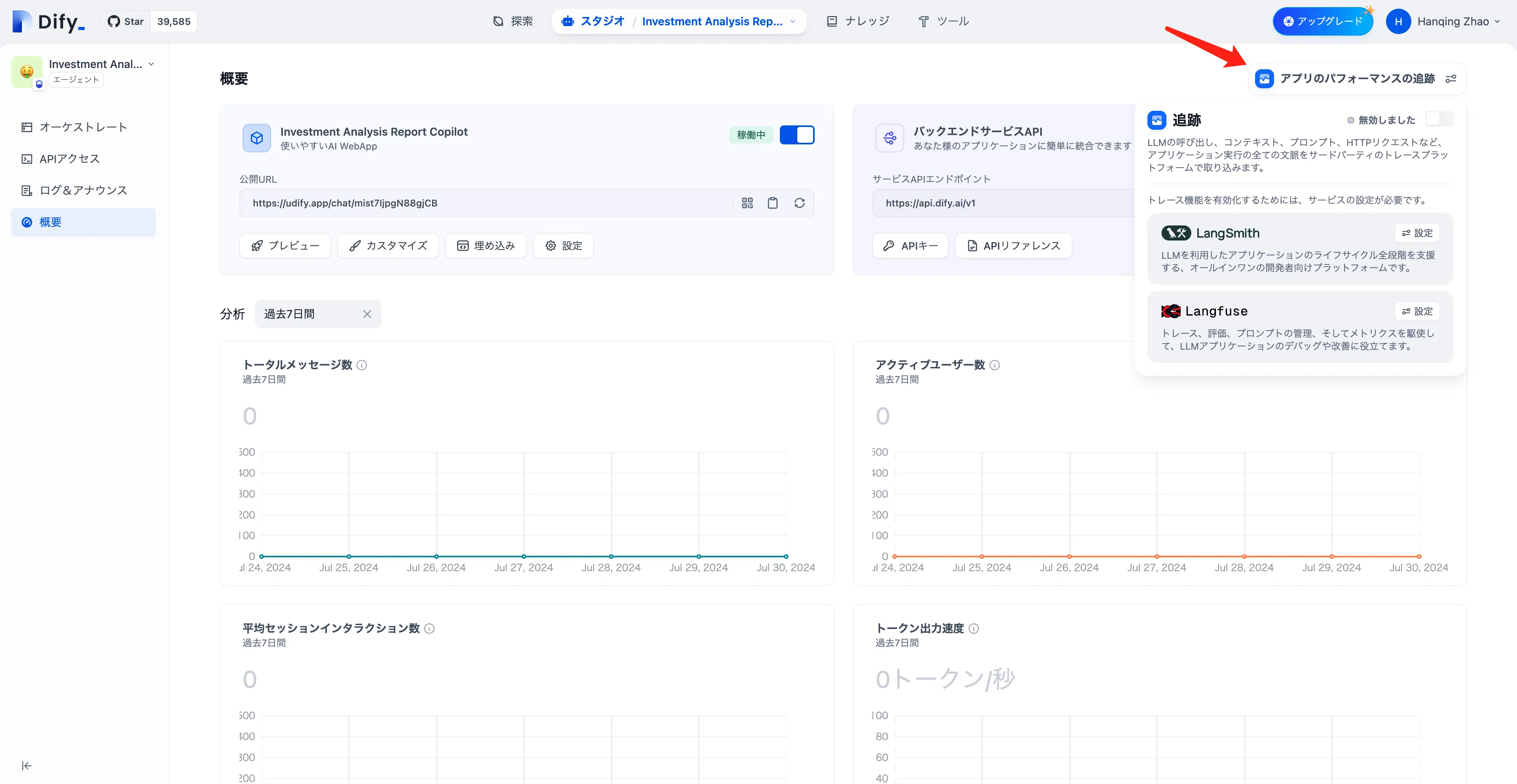ナレッジページに移動し、左側のナビゲーションでAPIページに切り替えます。このページでは、difyが提供するAPIドキュメントを表示し、ナレッジAPIにアクセスするための認証情報を管理できます。