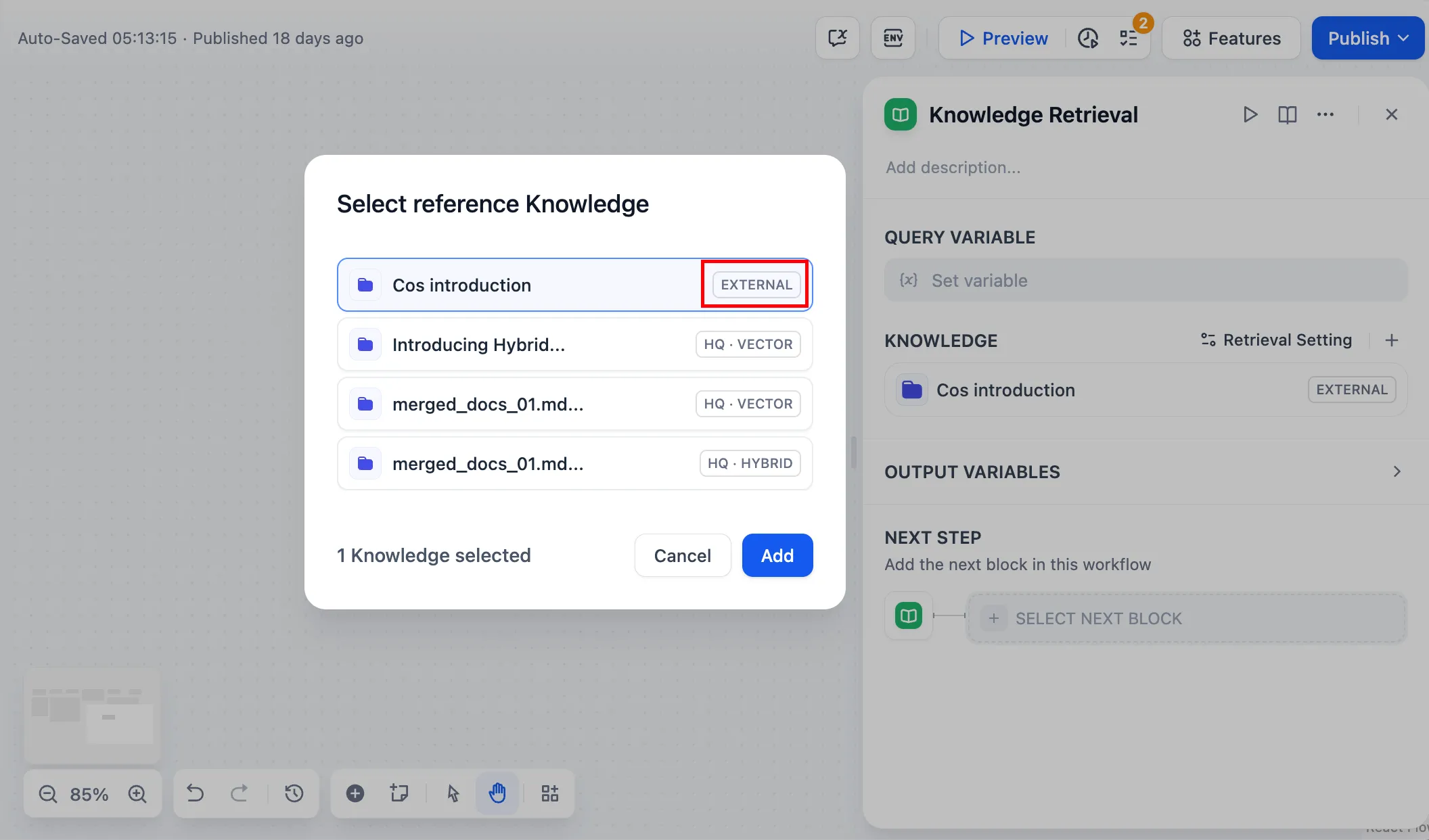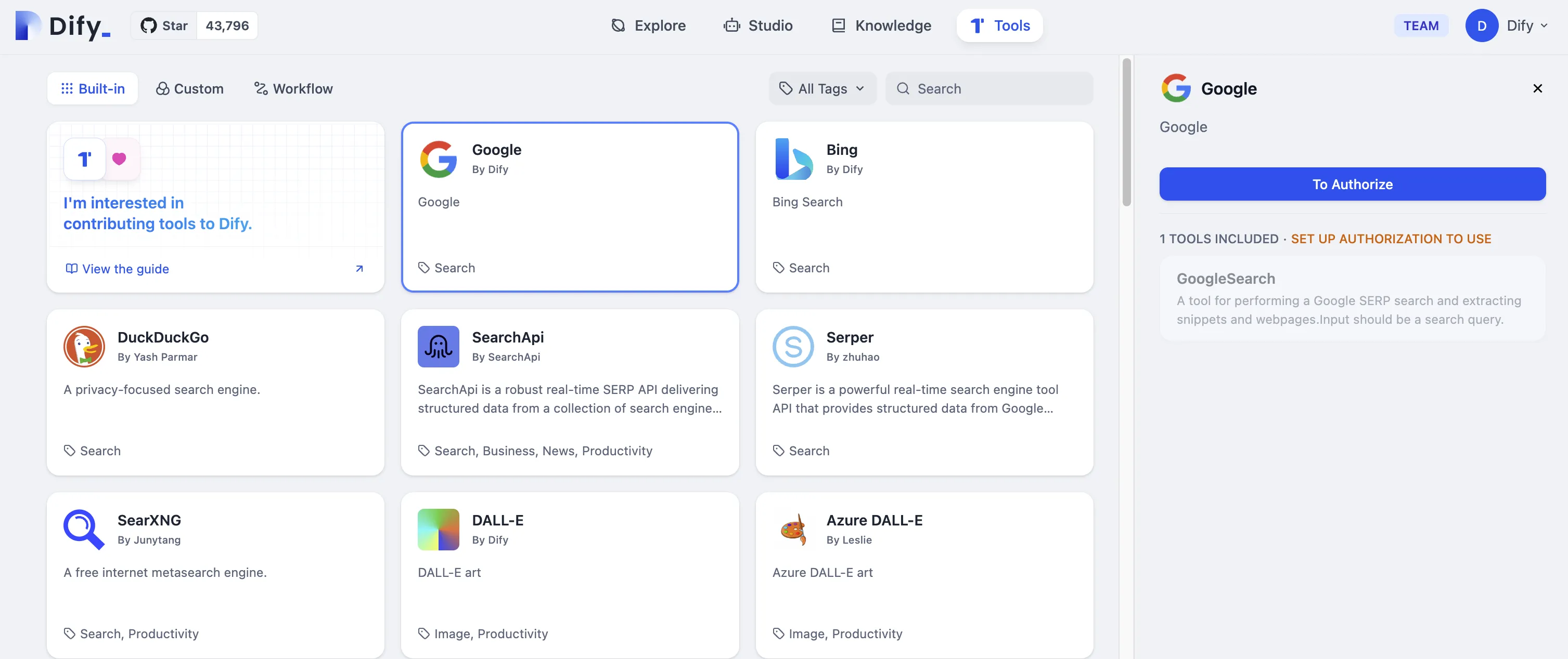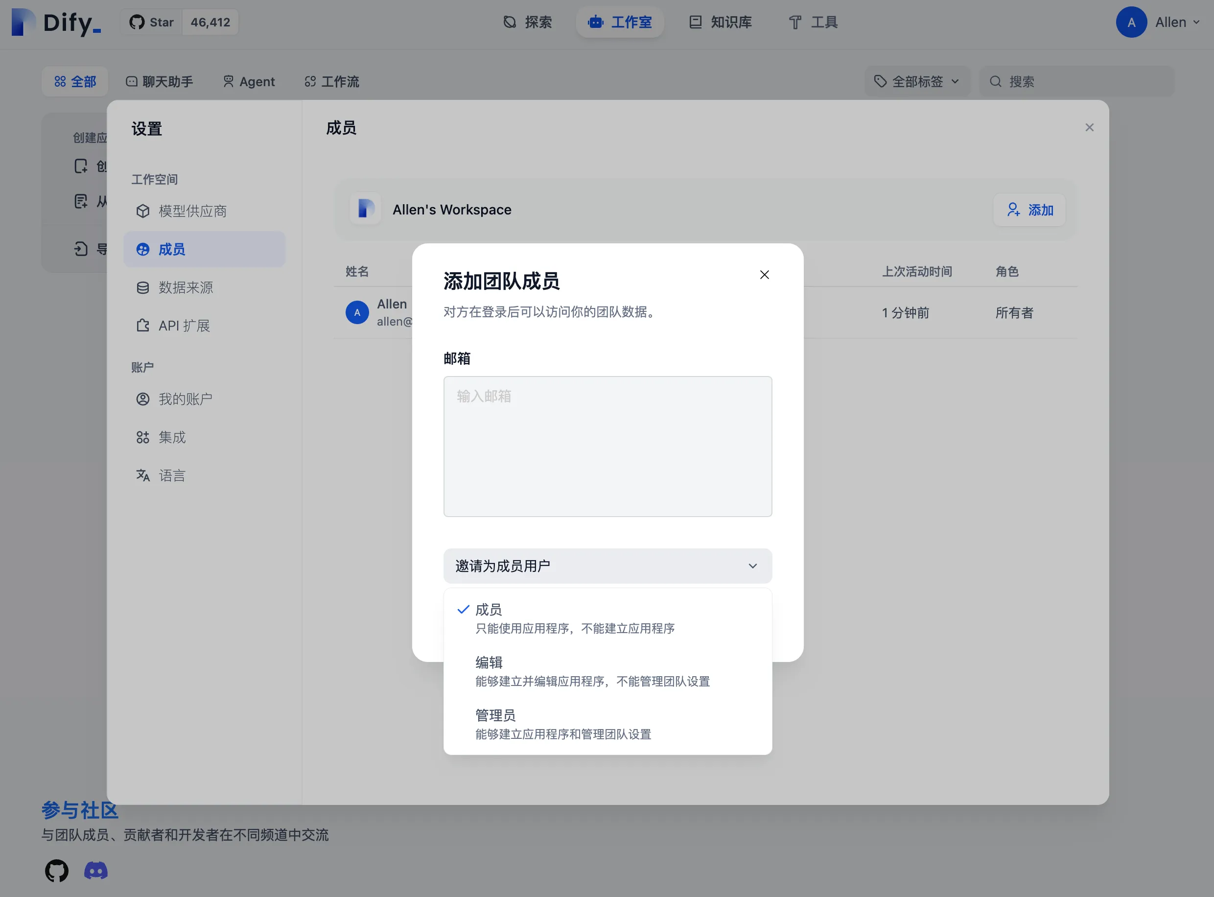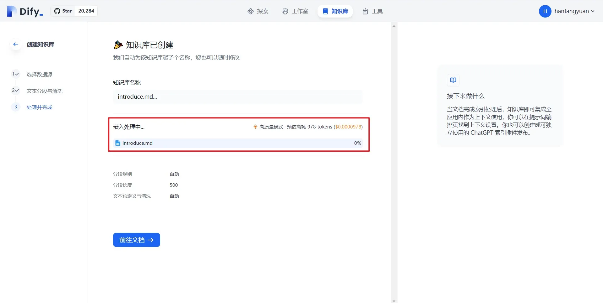 ナレッジページに移動し、左側のナビゲーションでAPIページに切り替えます。このページでは、difyが提供するAPIドキュメントを表示し、ナレッジAPIにアクセスするための認証情報を管理できます。