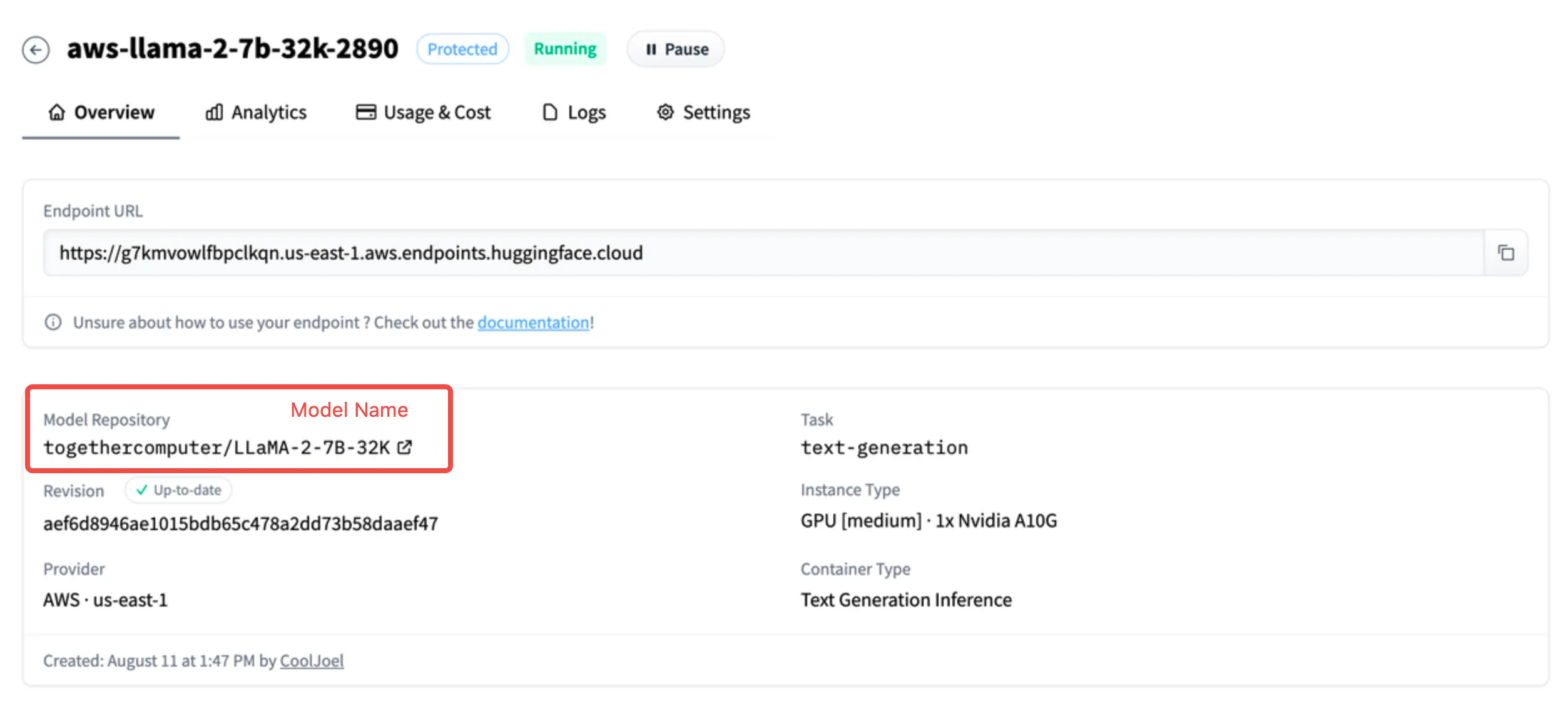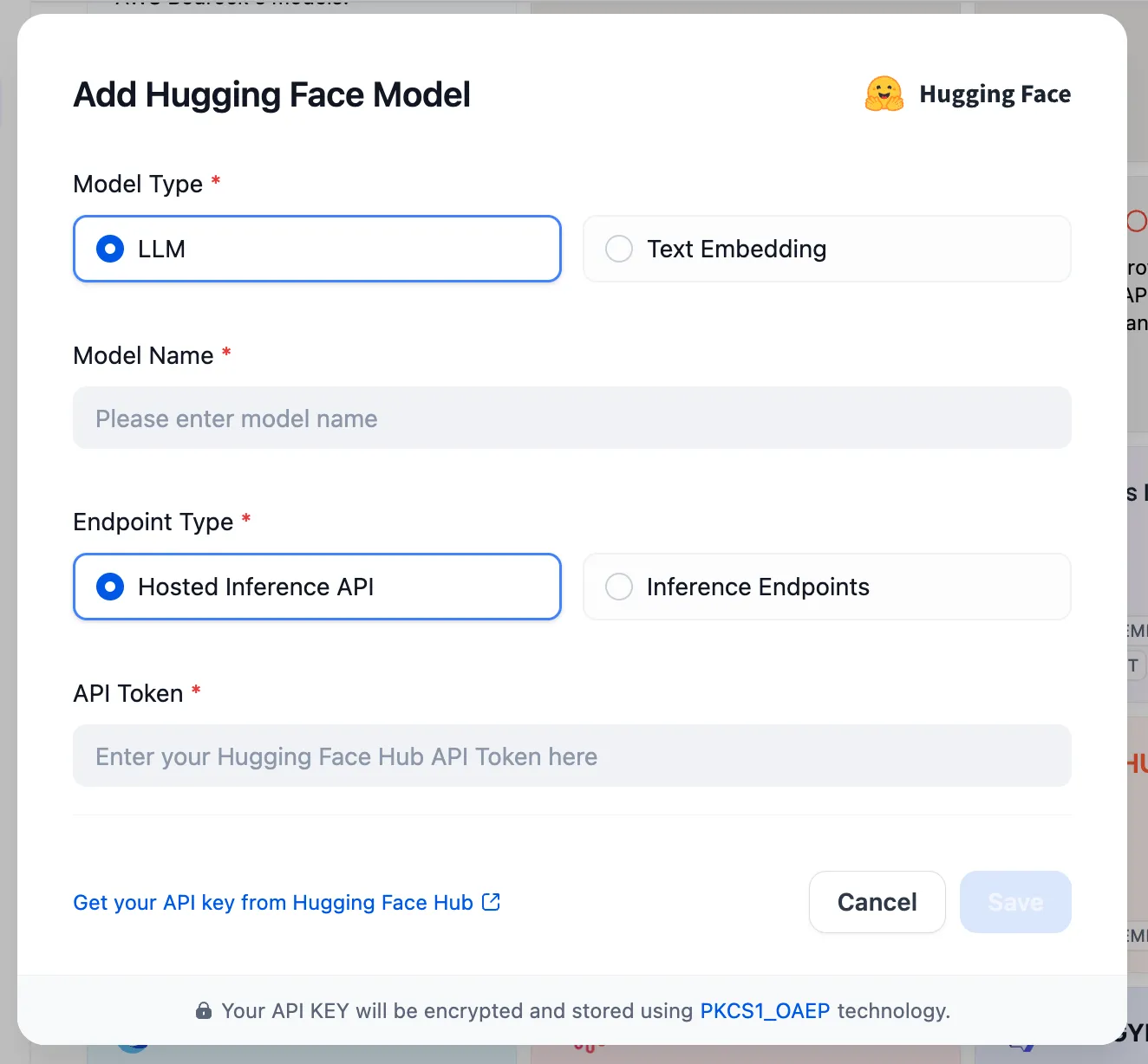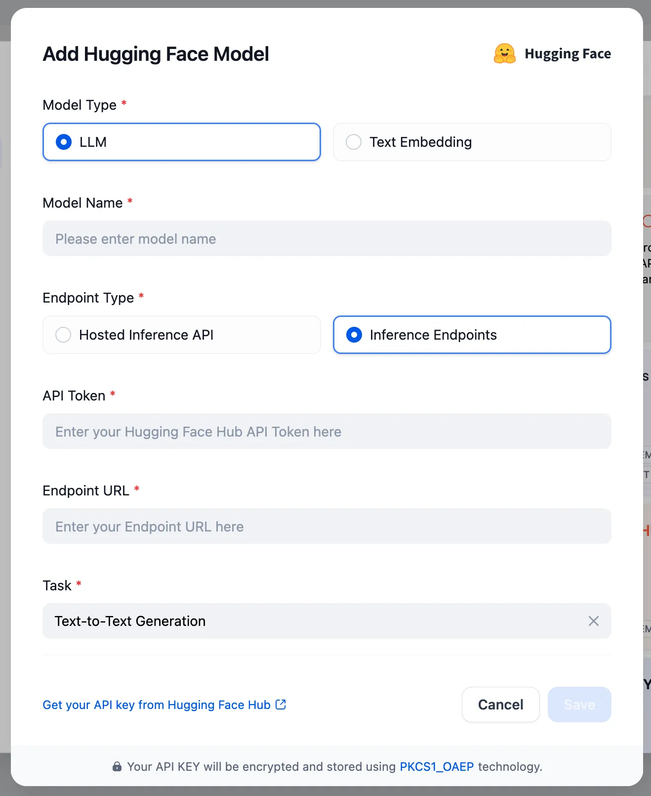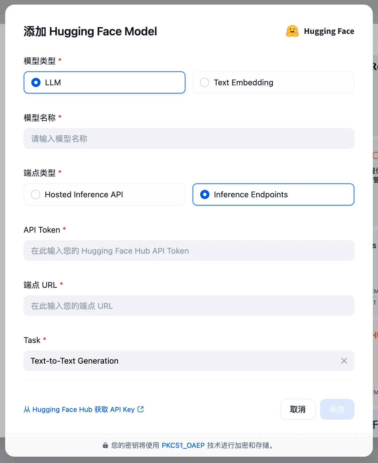 The API Token is the API Key set at the beginning of the article. `The name of the Text-Generation model can be arbitrary, but the name of the Embeddings model needs to be consistent with Hugging Face.` The Endpoint URL is the Endpoint URL obtained after the successful deployment of the model in the previous step.