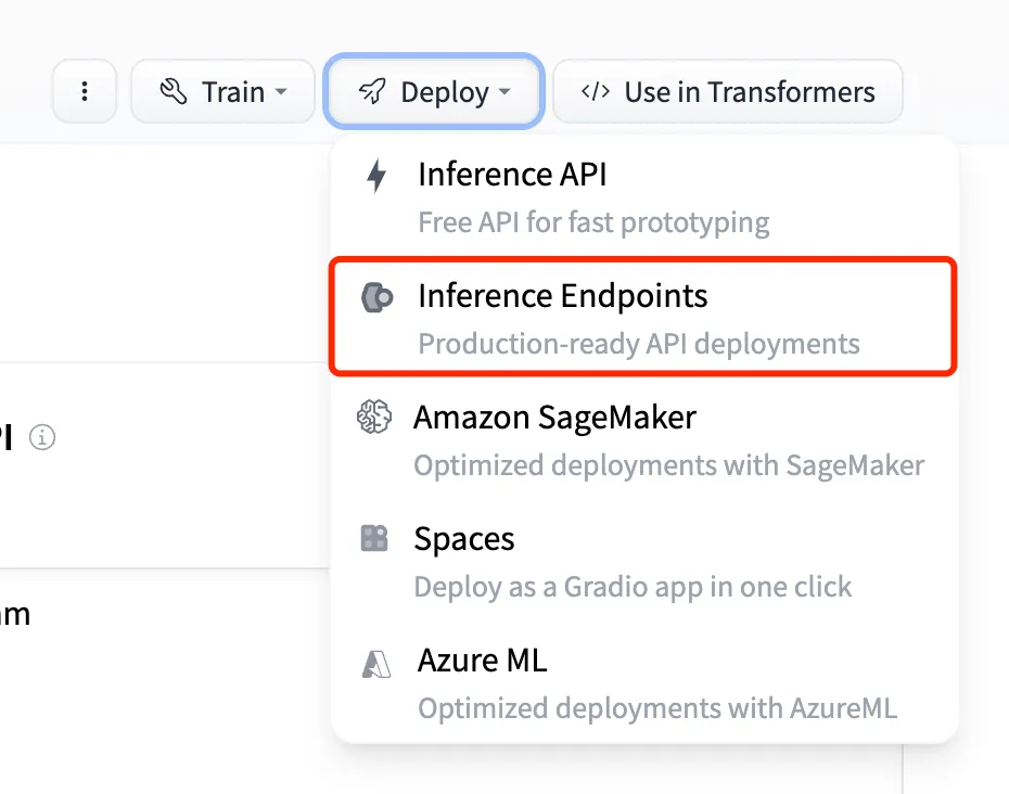 モデルの詳細ページの右側にある`Deploy`ボタンの下にInference EndpointsオプションがあるモデルのみがInference Endpointをサポートしています。以下の図のように表示されます:
