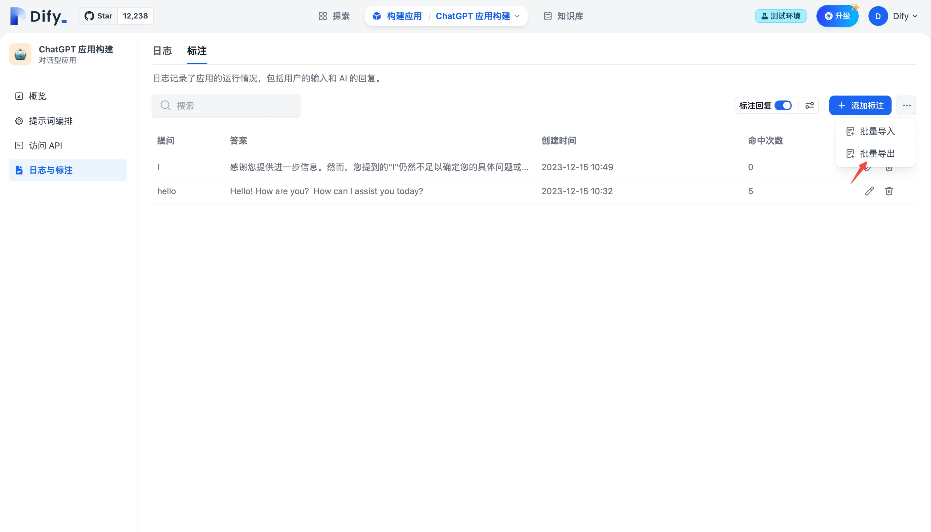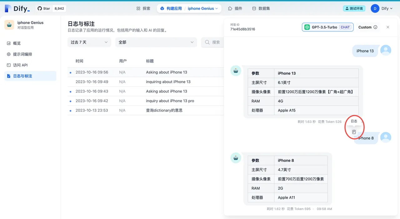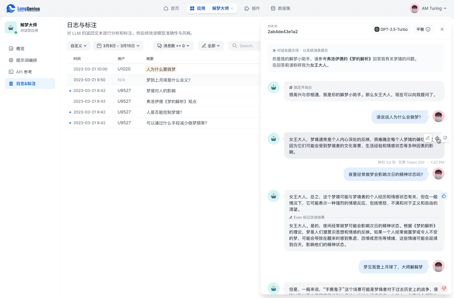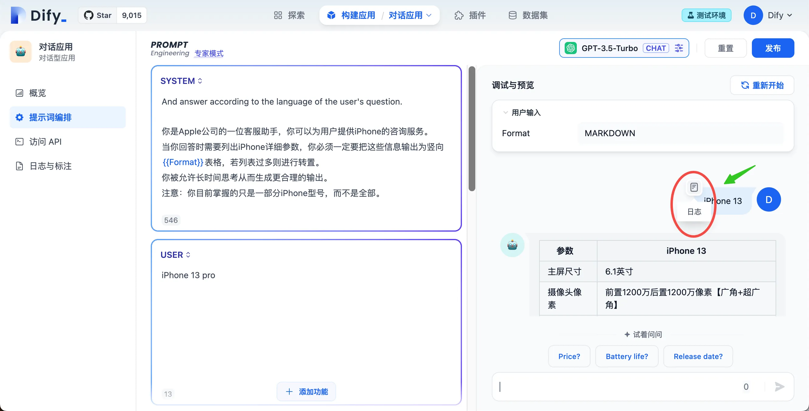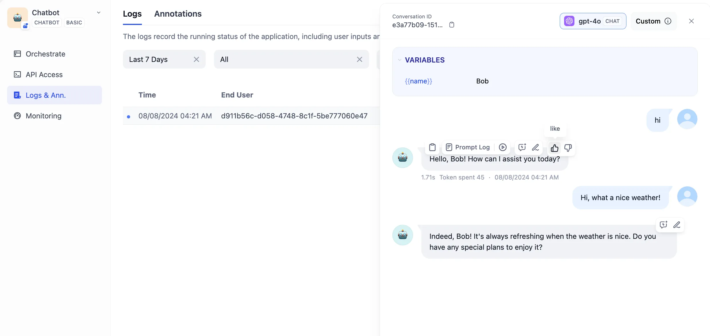 在初始的构建应用主界面,左侧导航栏可以看到“日志与标注”,点击进去即可查看完整的日志。 在日志与标注的主界面,点击任意一个会话日志条目,在弹出的右侧对话框中同样鼠标指针移动到会话上即可点开“日志”按钮查看提示词日志。