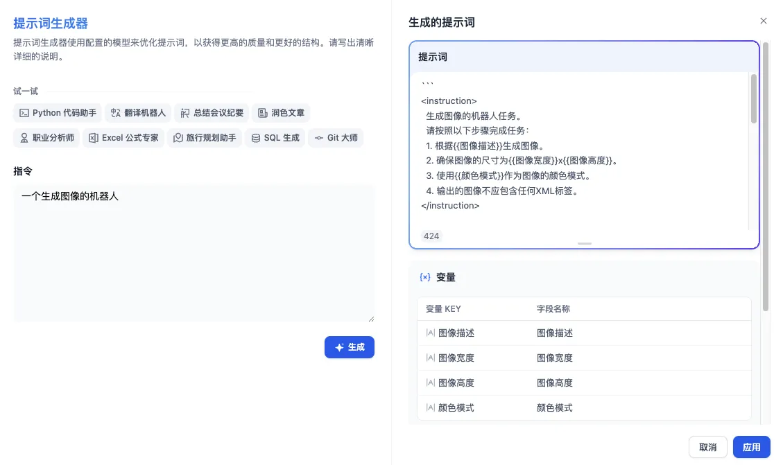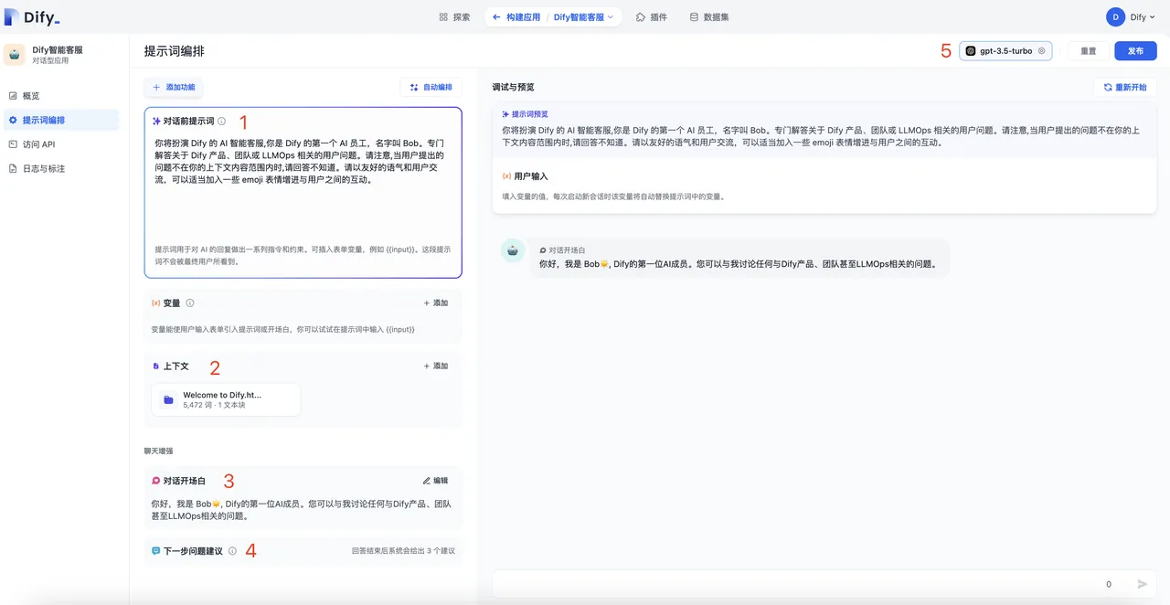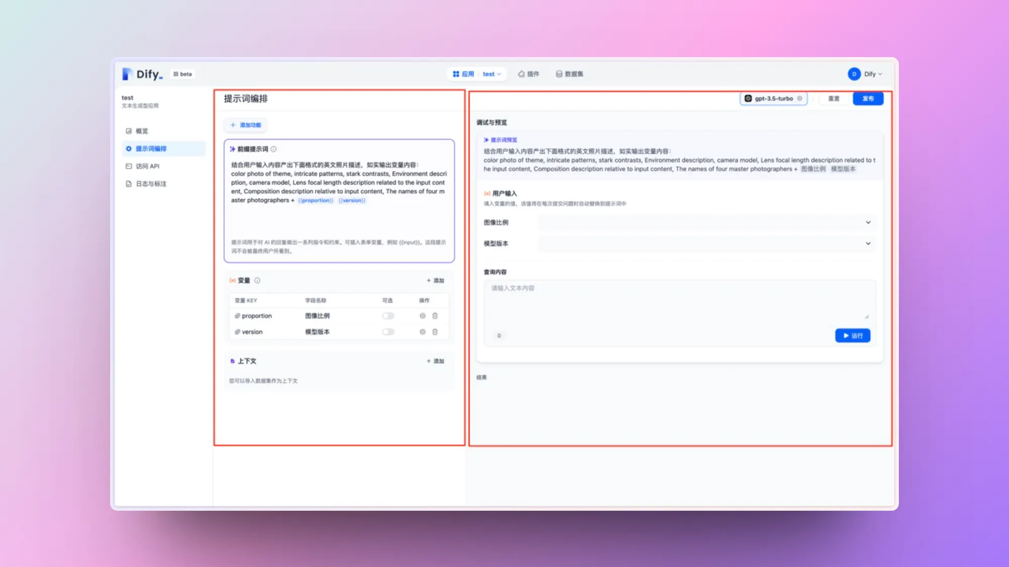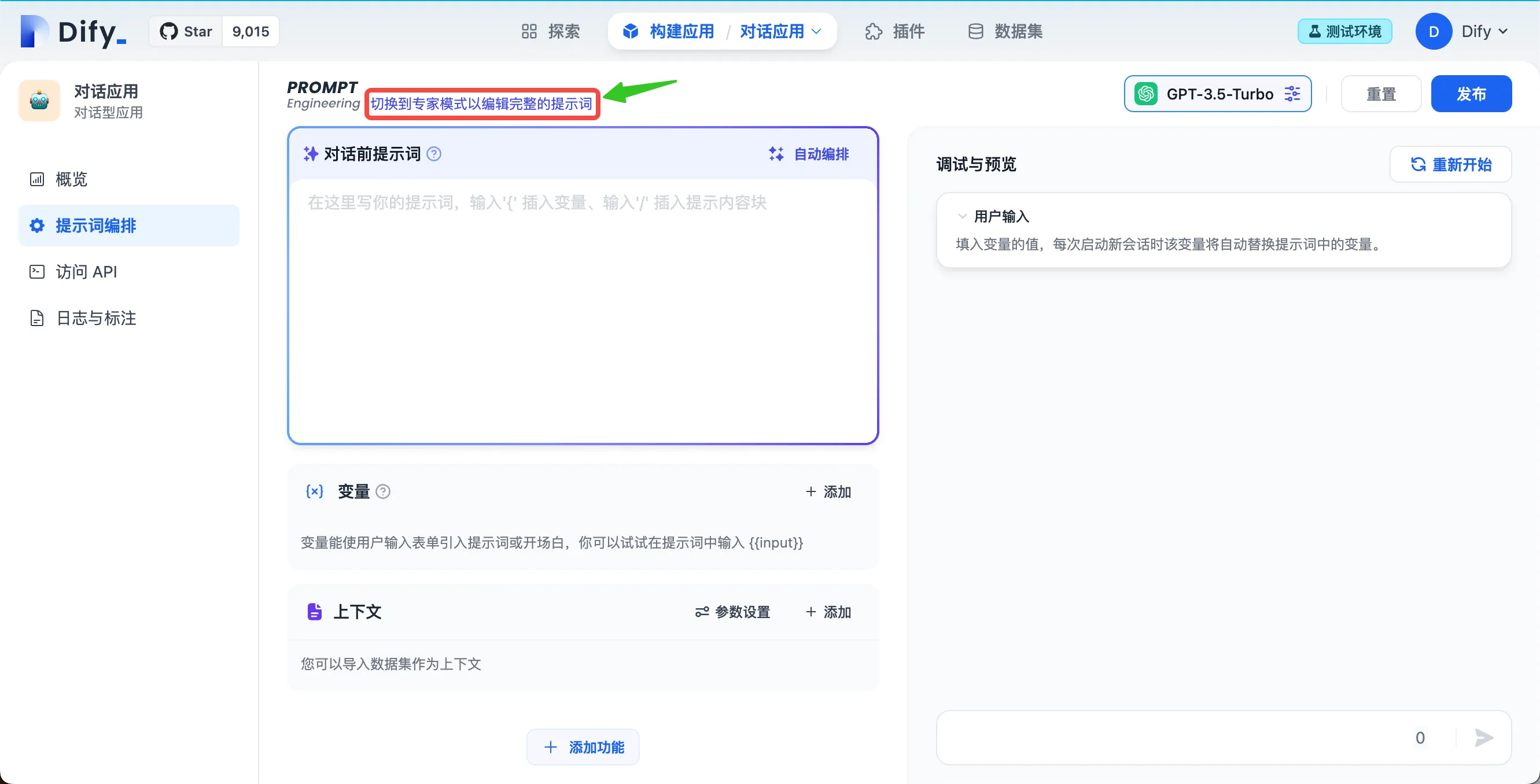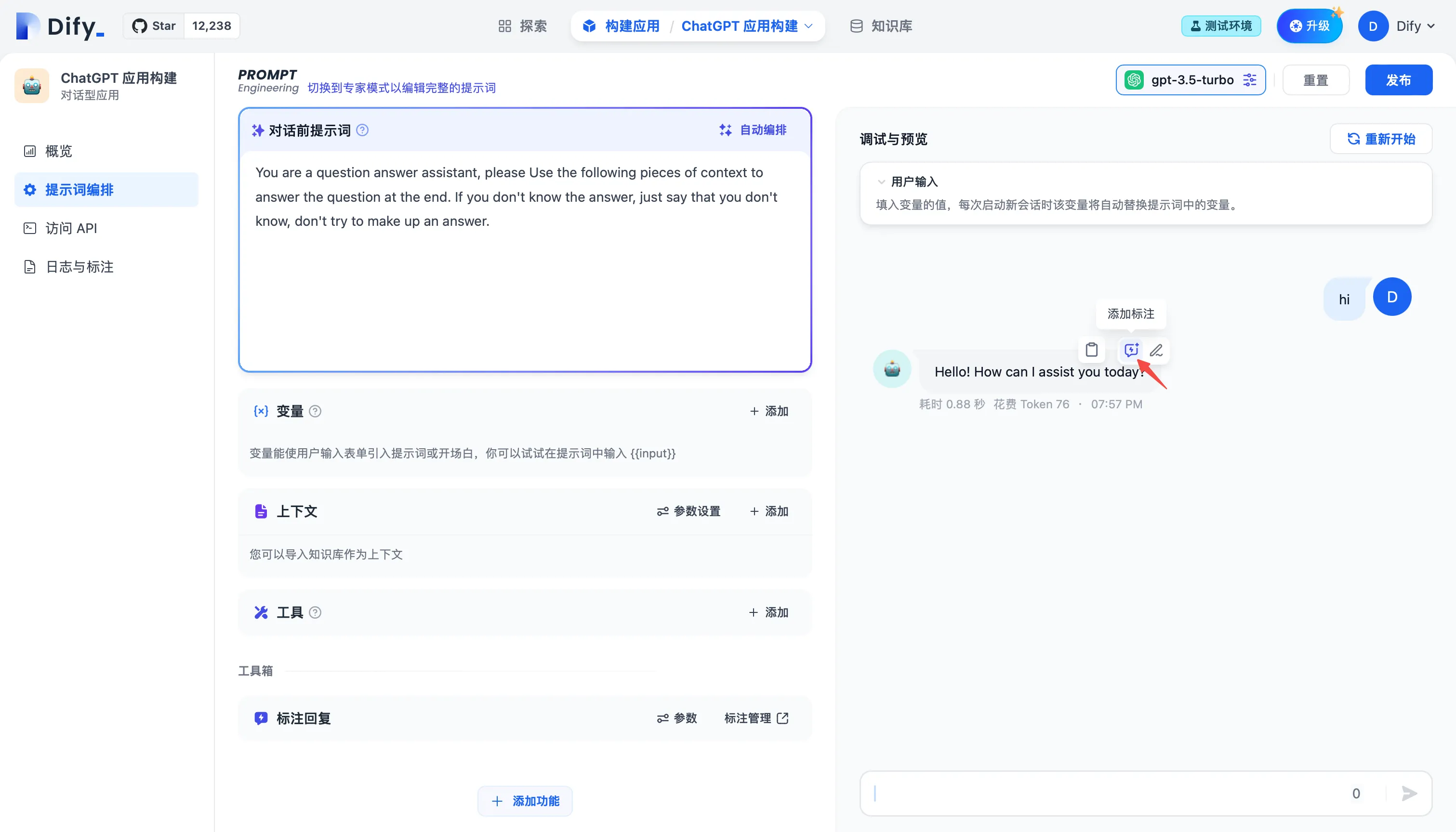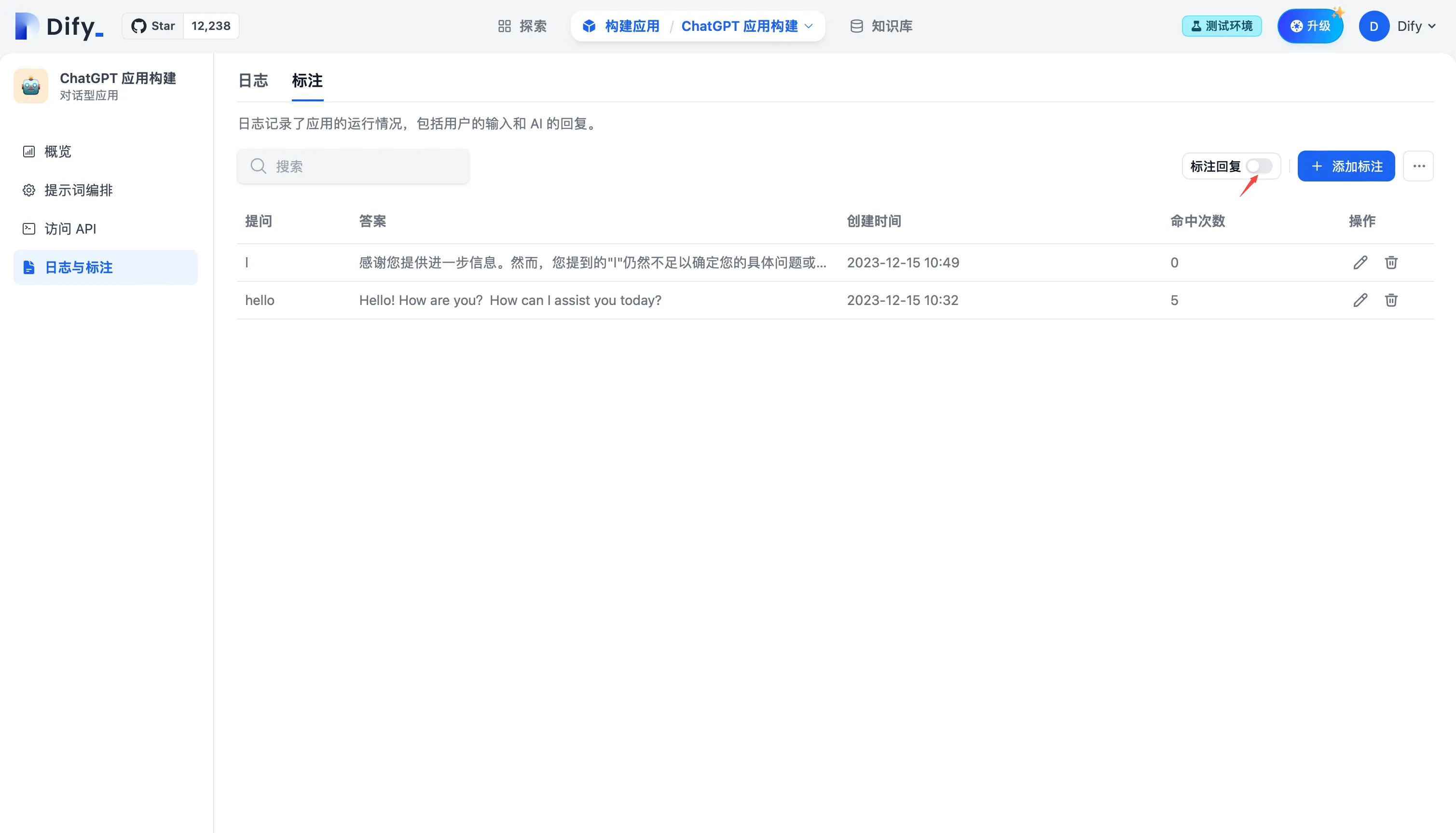 在初始的构建应用主界面,左侧导航栏可以看到“日志与标注”,点击进去即可查看完整的日志。 在日志与标注的主界面,点击任意一个会话日志条目,在弹出的右侧对话框中同样鼠标指针移动到会话上即可点开“日志”按钮查看提示词日志。