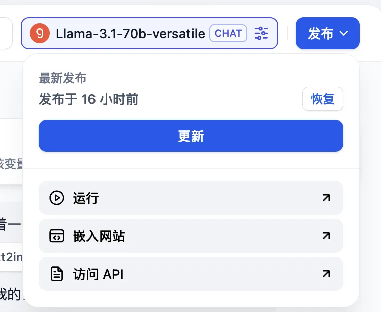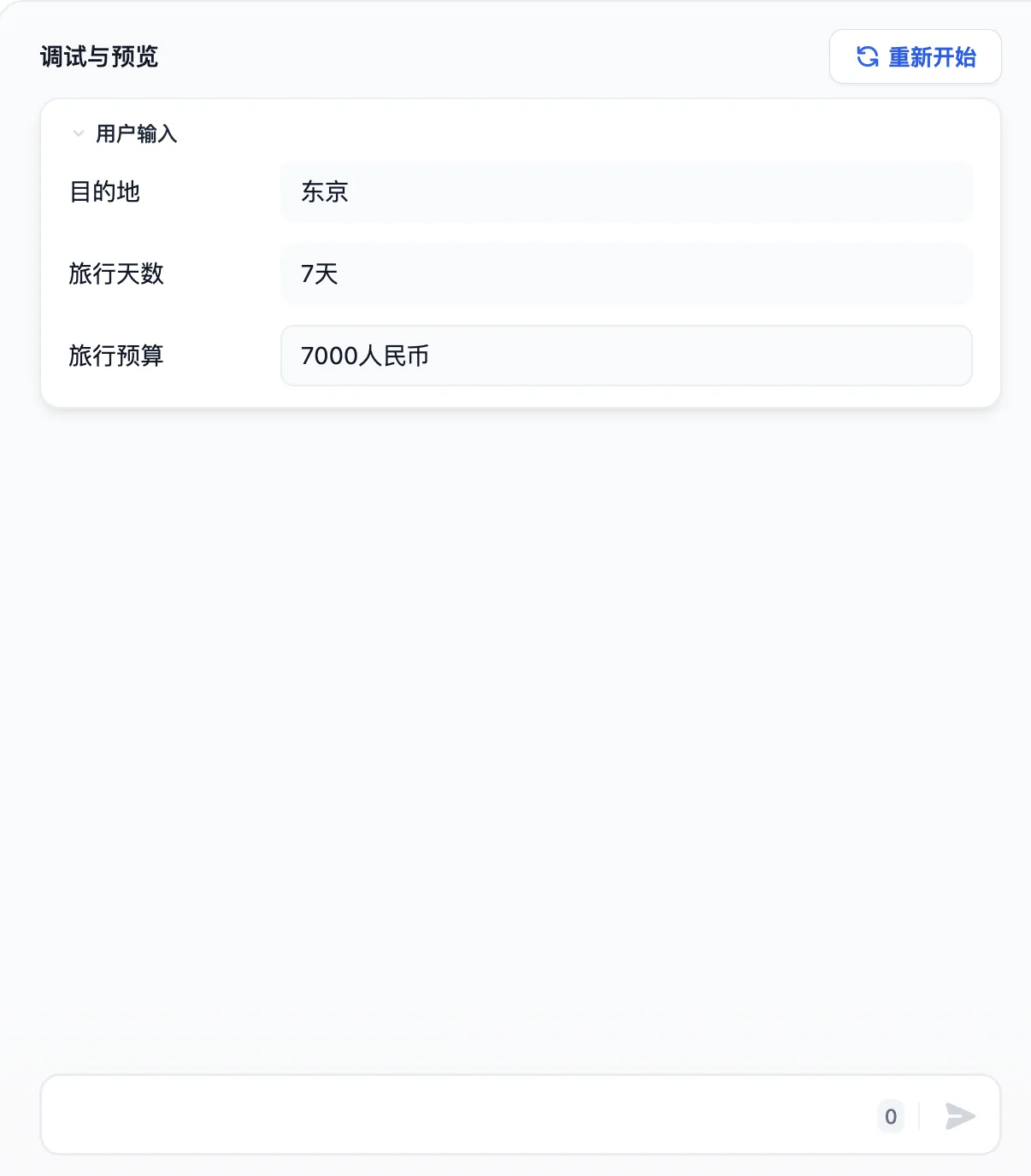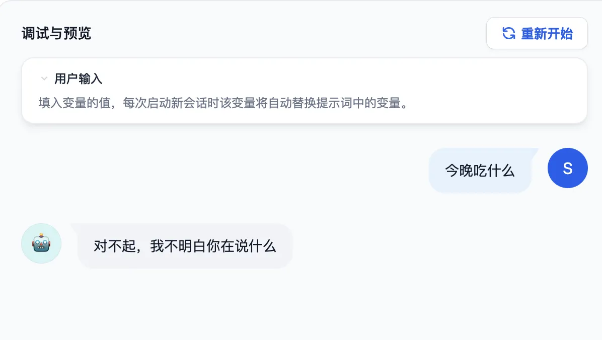 在调试预览界面,用户与 AI 产生对话之后,将鼠标指针移动到任意的用户会话,即可在左上角看到“日志”标志按钮,点击即可查看提示词日志。