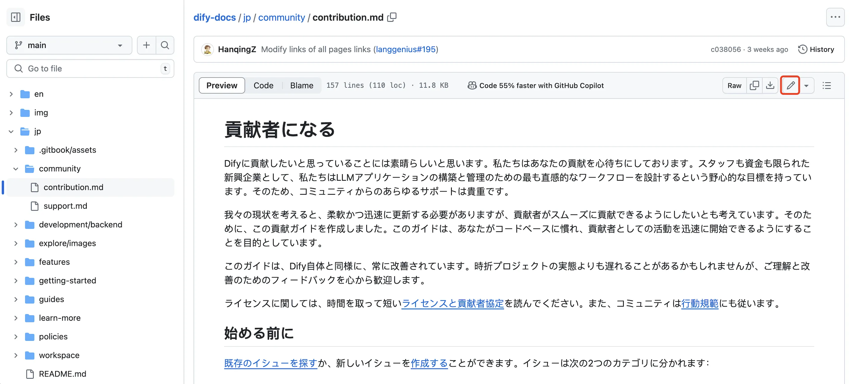 ドキュメントを読んでいる際に内容の誤りを見つけたり、一部を修正したい場合は、文書ページの右側にある目次内の **“Github に編集”** ボタンをクリックしてください。これにより、GitHub のオンラインエディターを使用してファイルを修正できます。その後、修正内容を簡潔に説明した pull request を作成してください。タイトルは `Fix: Update xxx` の形式を使用してください。リクエストを受け取った後、レビューを行い、問題がなければ修正をマージします。