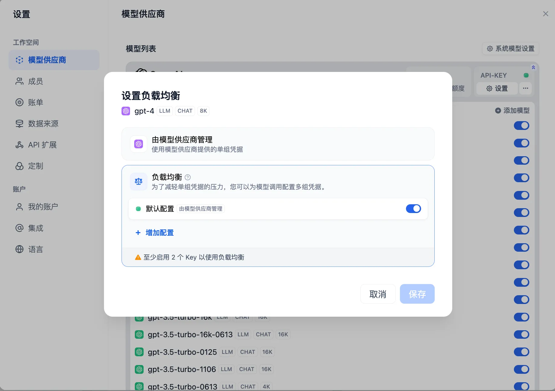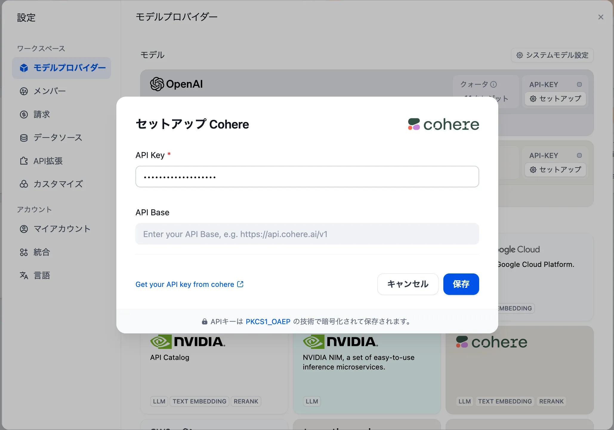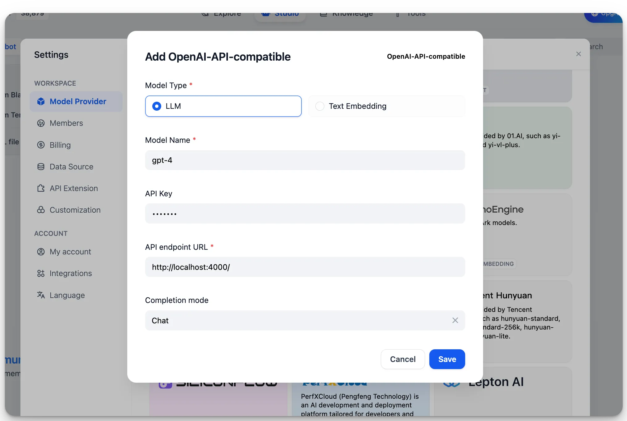 `設定 > モデルプロバイダー > OpenAI-API互換` で、以下を入力してください: