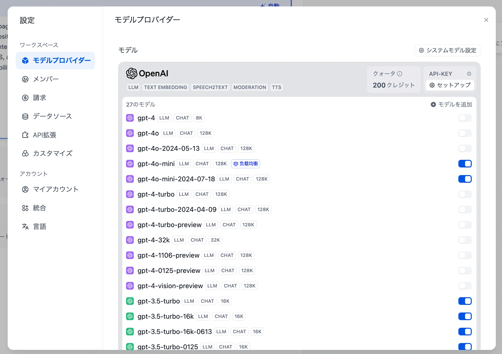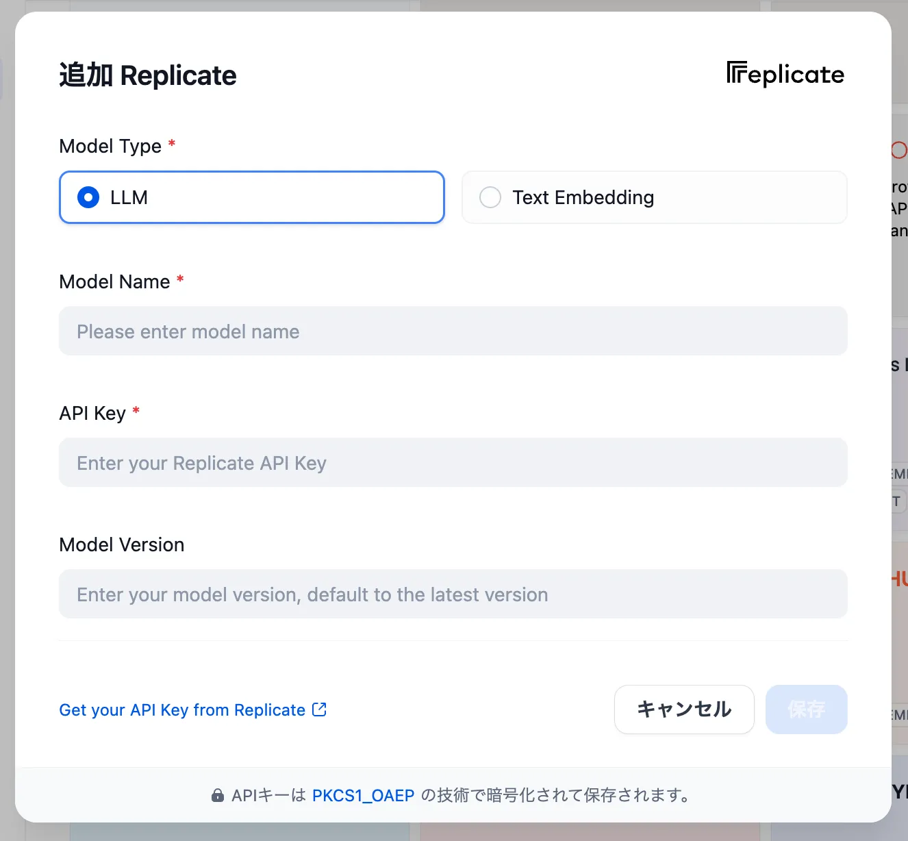 4. Difyの`設定 > モデルプロバイダ > Replicate`にてモデルを追加します。