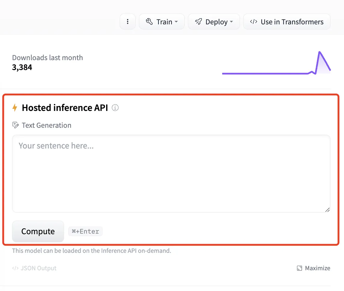 モデルの詳細ページの右側にHosted Inference APIのセクションがあるモデルのみがHosted Inference APIをサポートしています。以下の図のように表示されます: