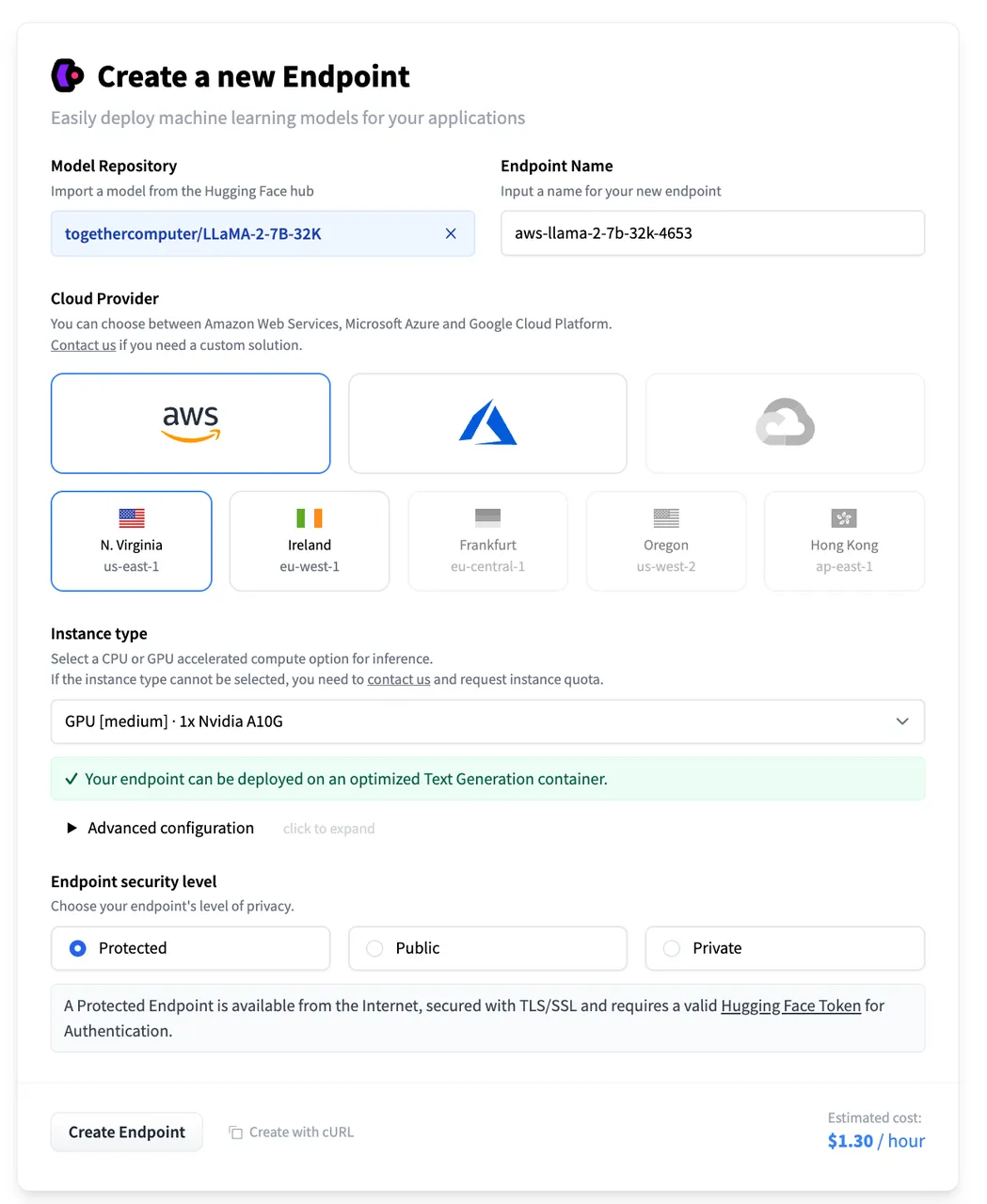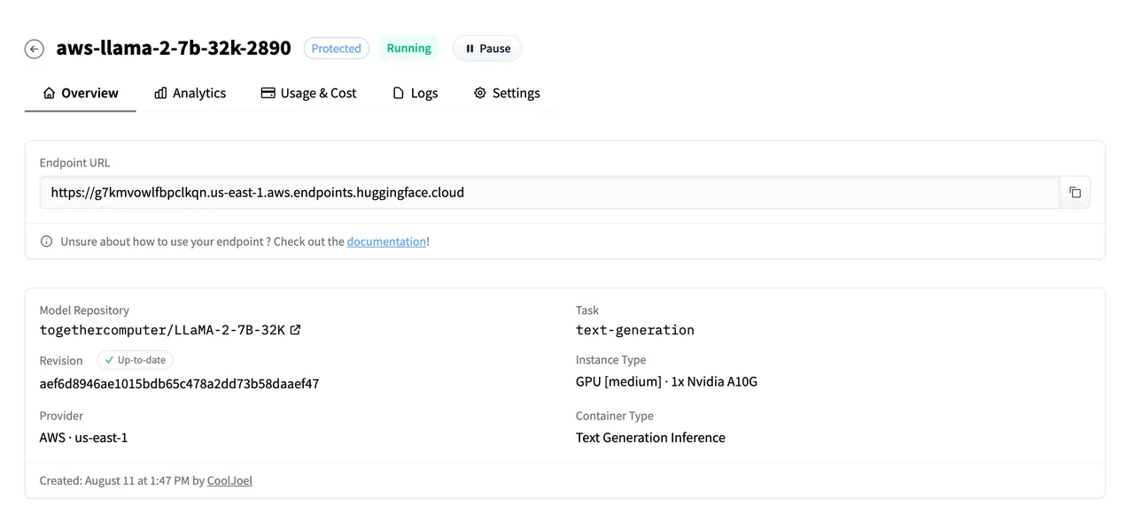モデルのデプロイボタンをクリックし、Inference Endpointオプションを選択します。以前にクレジットカードを登録していない場合は、カードの登録が必要です。手順に従って進めてください。カードを登録した後、以下の画面が表示されます:必要に応じて設定を変更し、左下のCreate EndpointボタンをクリックしてInference Endpointを作成します。