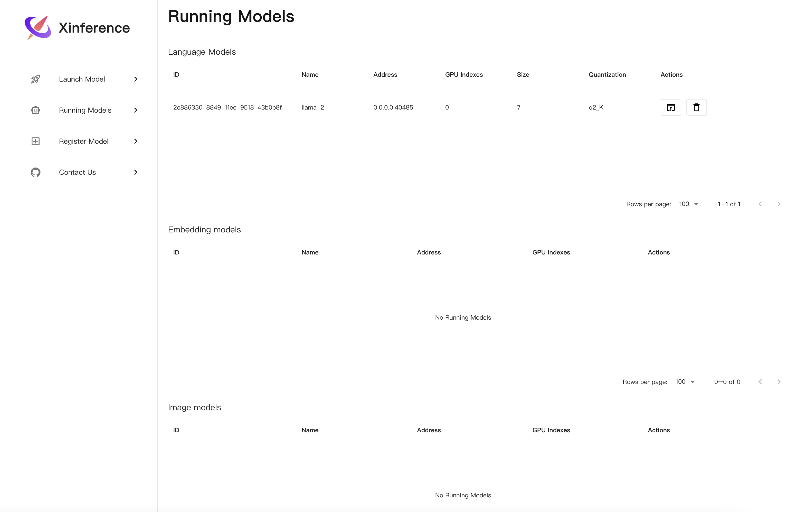 `http://127.0.0.1:9997`にアクセスし、デプロイするモデルとその仕様を選択します。以下の図を参照してください: