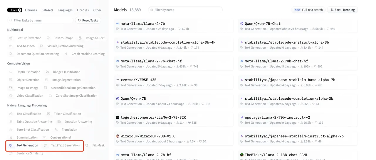 3. Select a model to enter the [Hugging Face model list page](https://huggingface.co/models?pipeline\_tag=text-generation\&sort=trending).