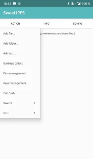 • It uses the java-ipfs-api (not the kotlin-ipfs-api used by IPFSDroid) for other actions