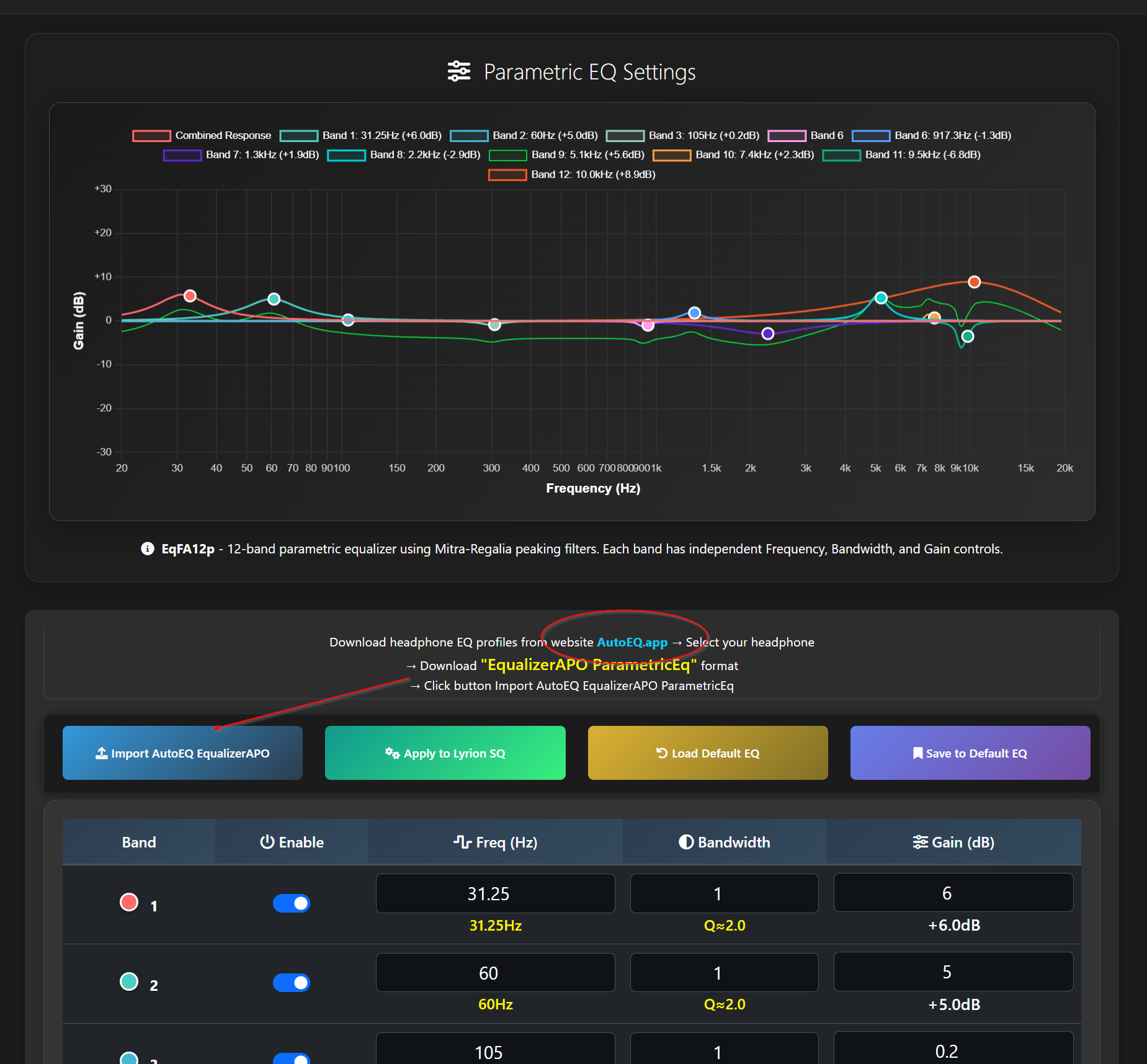 - Parametric EQfa12: Adjust EQ parameters for your headphones or audio system.