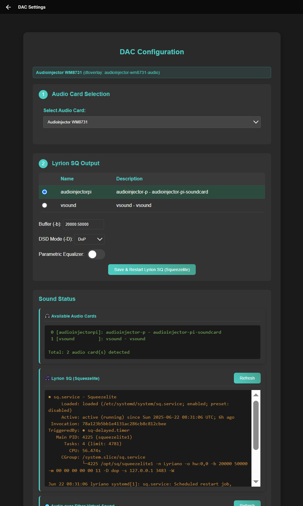 User Note: You need to select the "Eqfa12p" output from the Config menu for Squeezelite to use. You can switch between Squeezelite outputs to compare sound changes instantly without restarting the Pi.