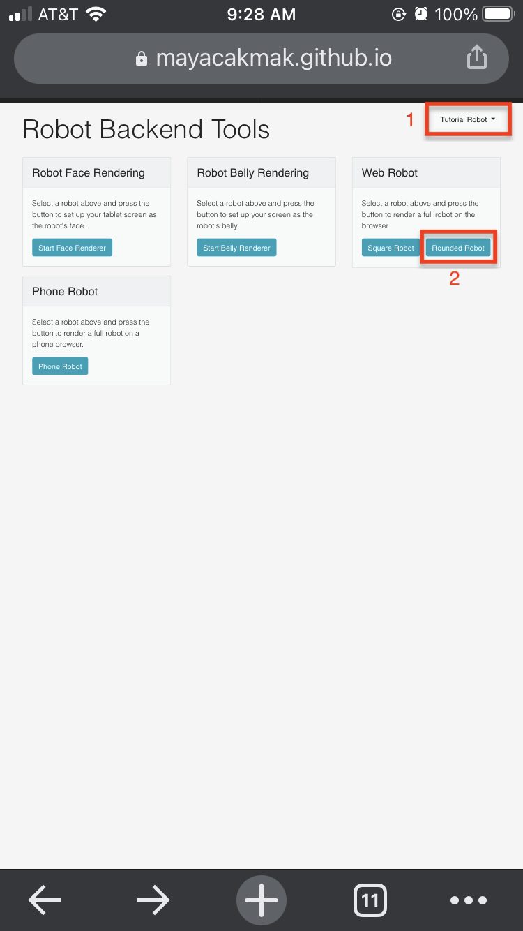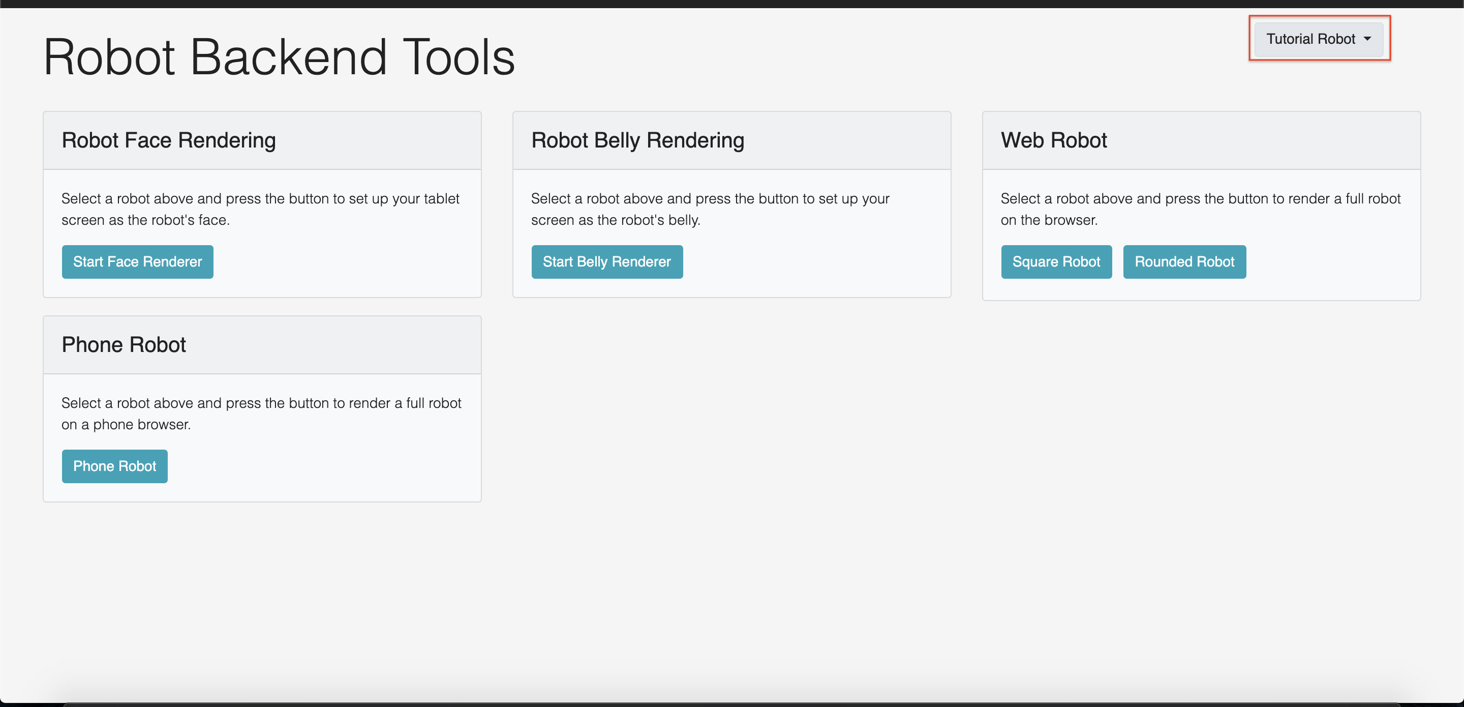 Open the robot back-end tools on a Chrome browser. From the top-right dropdown menu select the robot ID you would like to start. In this example, we use the 'Tutorial Robot' ID.
