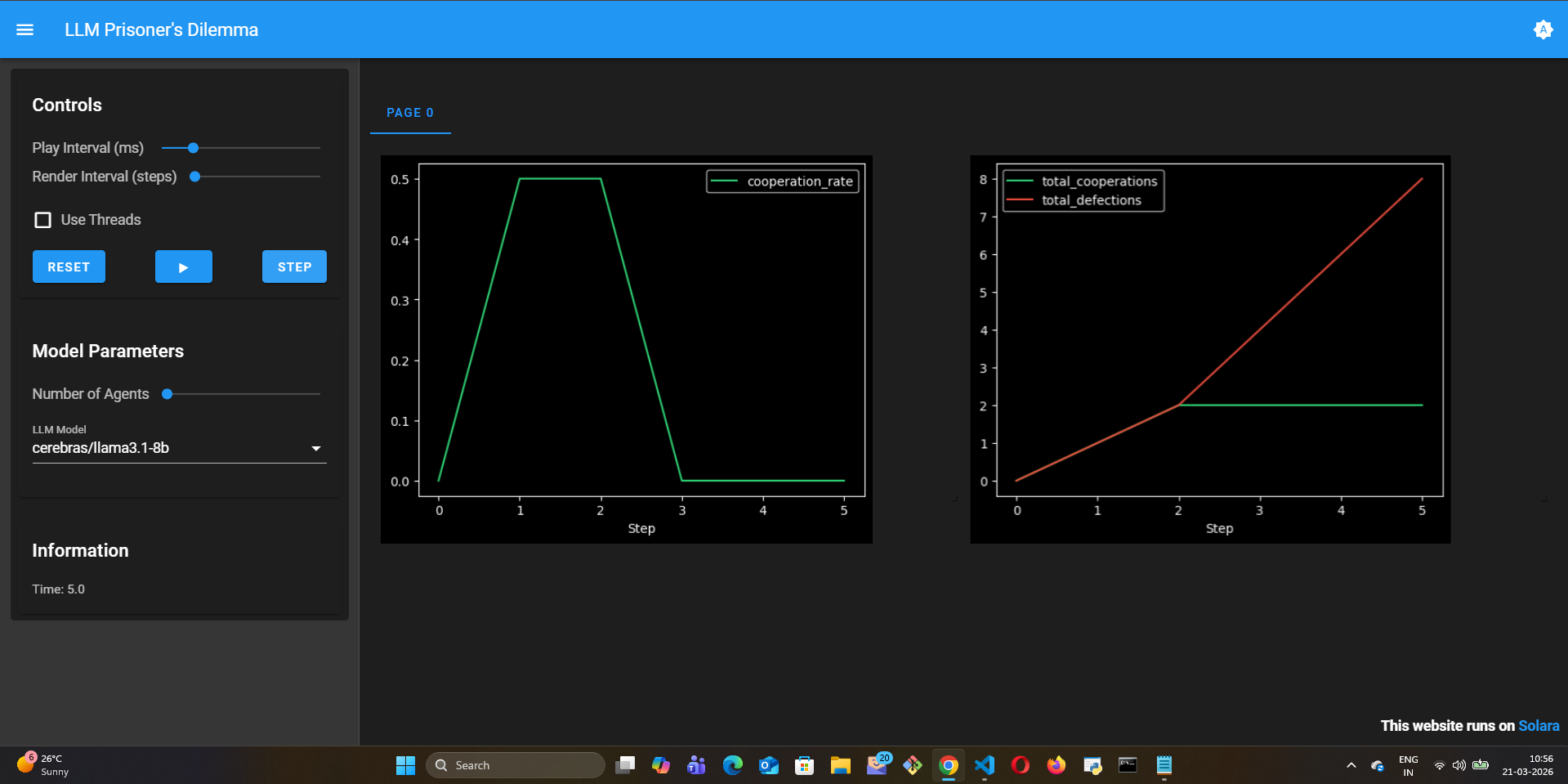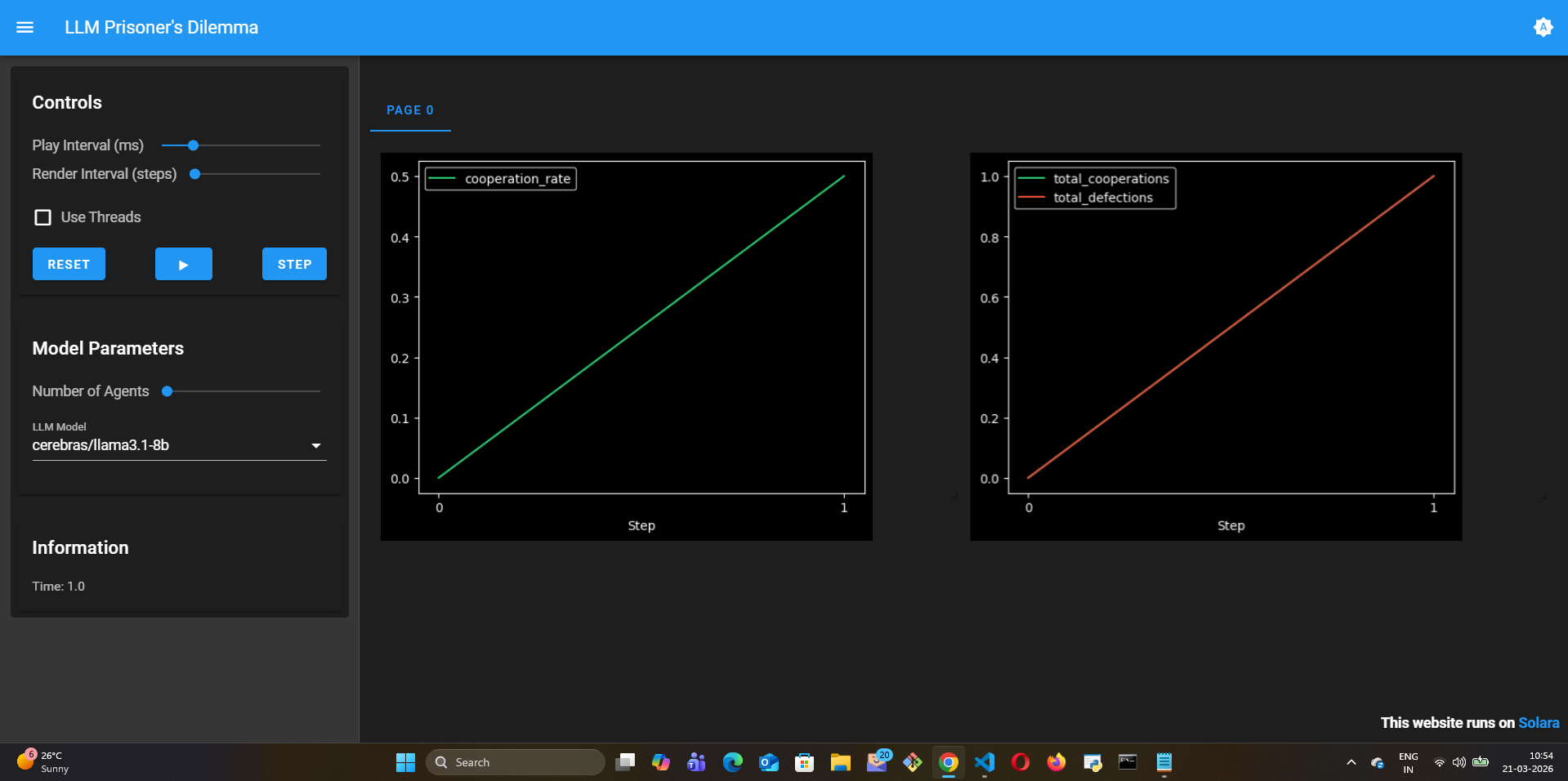 Hi @abhinavk0220, Thank you for this impressive contribution! Moving the Prisoner's Dilemma from rigid, rule-based strategies to LLM-driven Chain-of-Thought reasoning is a fantastic showcase for the I've run the model locally, reviewed the code, and evaluated it strictly against the Mesa Examples #390 Review Guidelines. Here are my notes: Does it belong?Absolutely. It is well-scoped, doesn't unnecessarily overlap with existing examples, and perfectly demonstrates the emergent social dynamics (trust, betrayal, forgiveness) that happen when agents have memory and reasoning capabilities. Is it correct and current?The model visualizes correctly, but there are two critical vulnerabilities that need to be addressed to ensure both scientific correctness and UI stability.