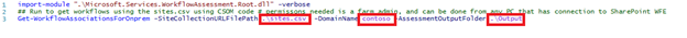b. After the correct values are supplied for SiteCollectionURLFilePath, DomainName and -AssessmentOutputFolder, run the Get-WorkflowAssociationsForOnprem commandlet.