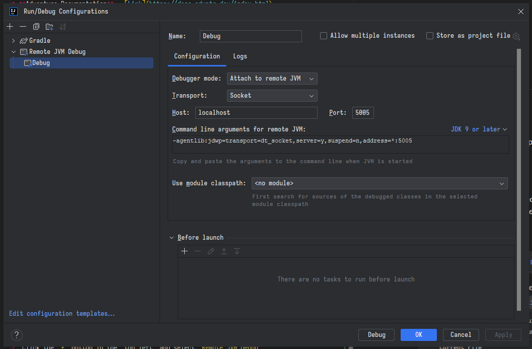 The Development Server listens for Debuggers on port 5005.