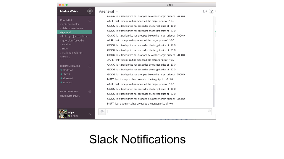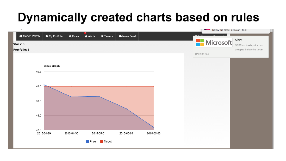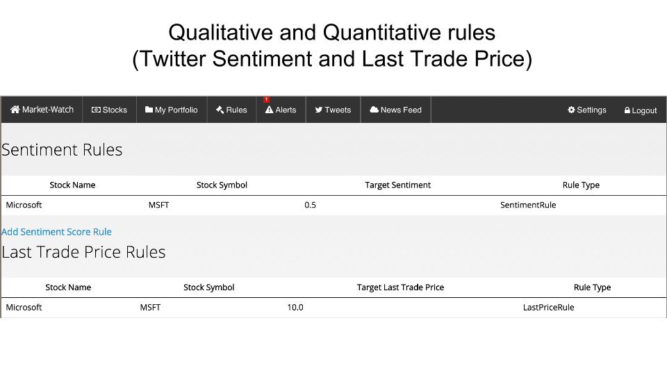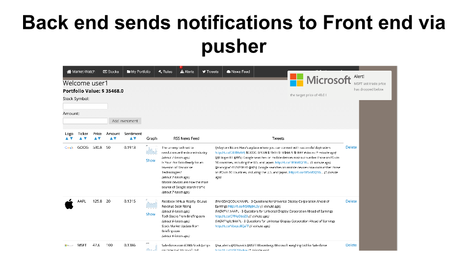 What's happening in the financial markets? Monitor your portfolio and get real time alerts on quantitative data(last trade price) and qualitative data through twitter sentiment analysis.
