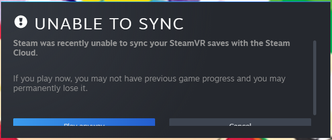 I've been getting this pop up every time I boot steamvr that's been happening for the past two weeks, I've spent days searching online for solutions and toggling steam cloud on/off along with trying to manipulate what's getting uploaded to my cloud but it just will not go away. Any ideas anyone? Link below is a pic of the pop up