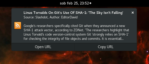 Verification of RSS source availability in Settings widgetRework of Settings widgetNotifications for new articlesMark articles read / unread- Categories for RSS Feeds