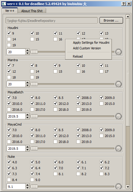 启动时先使用单独做的dlp package去找到所有的plugins们的版本号,然后显示在界面上,此时可以勾选/取消显示的版本们,滑条默认最大到最后一个版本+10,但是spinbox输入框没有限制,可以随便设),右键菜单可以写设置到配置文件里