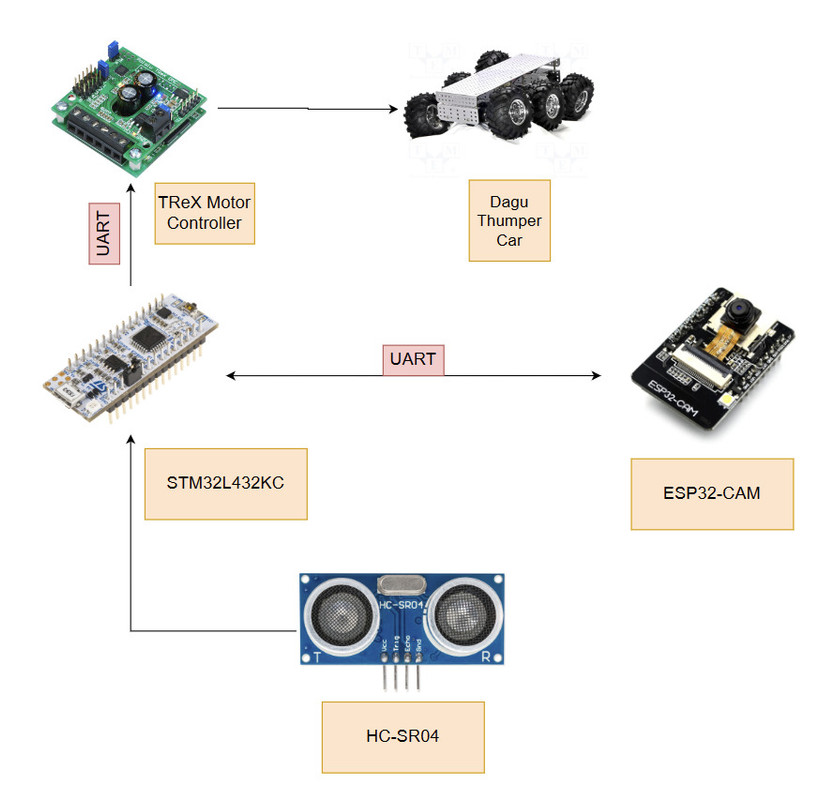 | STM32L432KC Microcontroller | It is the main controller of the system. It receives the image from the ESP32 CAM and processes it to detect the lines. Also communicates with the ultrasonic sensor to detect objects infront of the car and stop it. | ![]() |