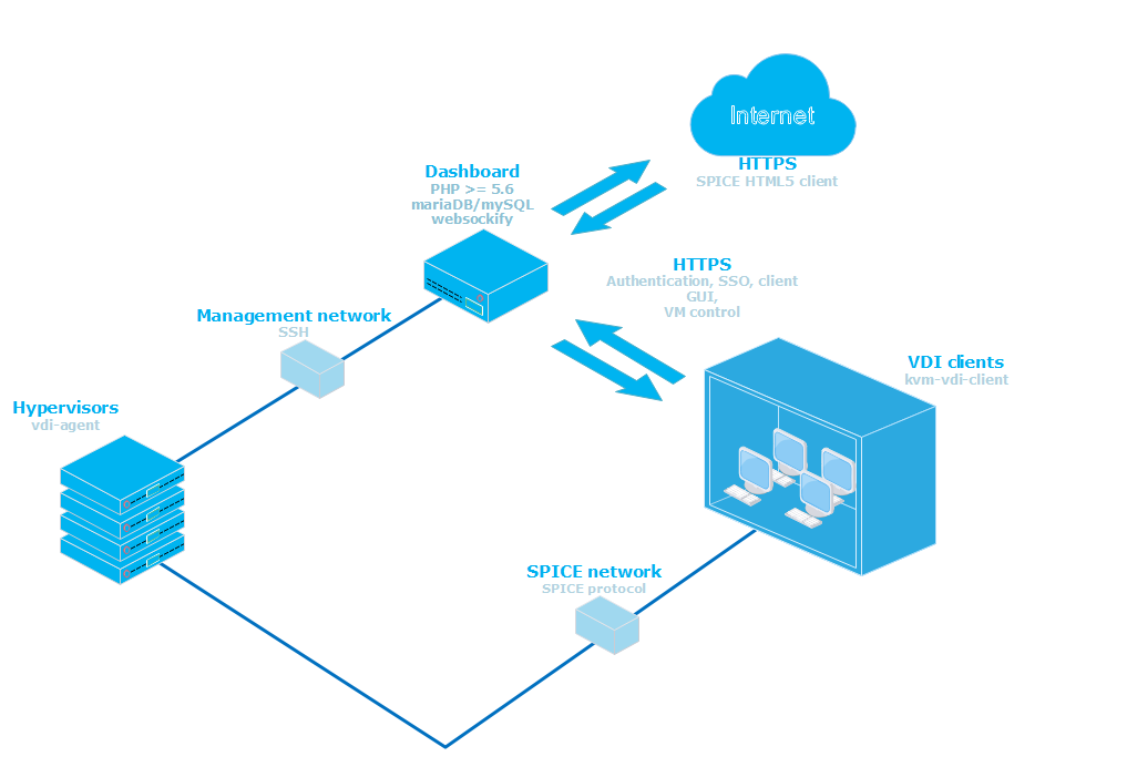 Project uses qemu-kvm virtualization and provides VMs to thin client via SPICE protocol. Additionally dashboard can provide thin client with a RDP session of remote machine, or a VM from vmWare Horizon VDI pool (if used). - These options are optional and are designed as a quick failover solution when KVM hypervisors are not available (maintenance etc.).
