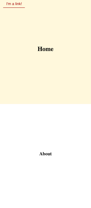 <About>component should return a<div>with an id ofabout. To match the screenshot, the div should contain an<h2>element with the text "About." However, as long as it has an id ofabout, it will pass the test!