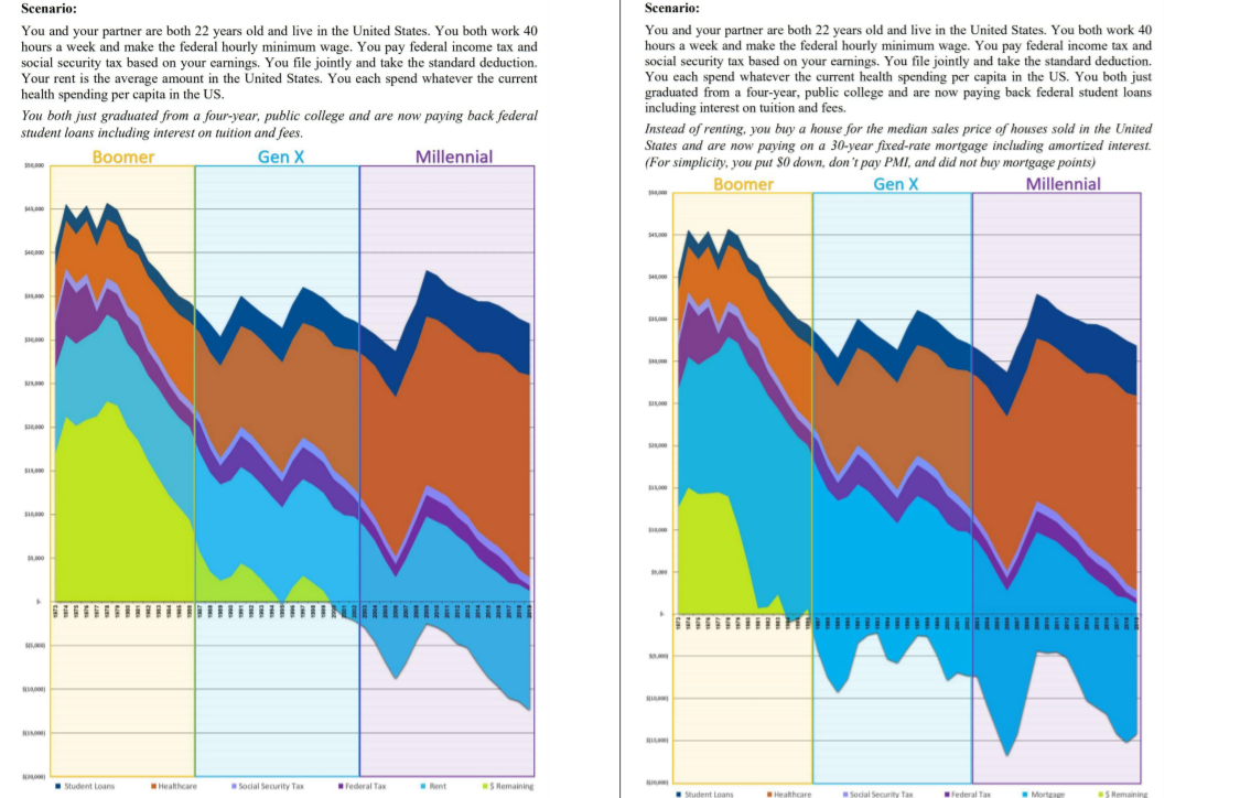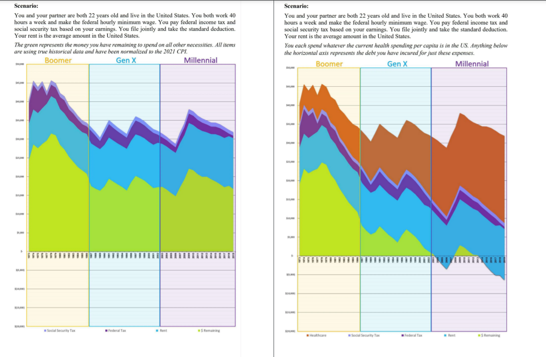The essential takeaway is that a few generations ago, someone born at the time could have made minimum wage, paid for health insurance, provided for a house house and still had money left over at the end of the month. Unfortunately, many people who experienced this reality are law makers and policy enforcers, who are unable to grasp the magnitude by which the cost of living has increased, leading to the delibatitng wealth disparity observed in modern America that disturbingly continues. I would say this visualization could use more descriptive captioninig to explain the implications of the chart, as my deductions required a considerable amount of additional research.