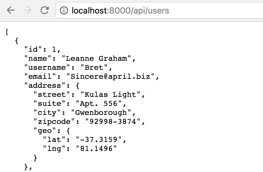 访问 http://localhost:8000/api/users ,就能访问到 http://jsonplaceholder.typicode.com/users 的数据。(由于 typicode.com 服务的稳定性,偶尔可能会失败。不过没关系,正好便于我们之后对于出错的处理)
