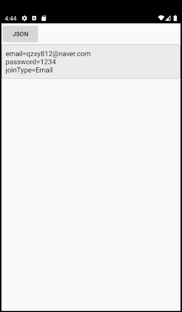 @Override protected void onCreate(Bundle savedInstanceState) { super.onCreate(savedInstanceState); setContentView(R.layout.activity_json_test); tv = findViewById(R.id.tvResult1); b = findViewById(R.id.button2); b.setOnClickListener(new View.OnClickListener() { @Override public void onClick(View view) { doJSONParser(); } }); }void doJSONParser() { LoginDTO loginInfo = getLoginInfo(); retrofitService = RetrofitClient.getClient().create(RetrofitService.class); retrofitService.login(loginInfo).enqueue(new ResultDataCallback(this) { @Override public void onFailure(Call<ResultData> call, Throwable t) { //int j = 0; dubug test } @Override public void onSuccess(Call<ResultData> call, Response<ResultData> response) { ResultData result = response.body(); //assert result != null; String vs = (String) result.getData(); LoginResult rs = LoginResult.valueOf(vs); if(true) { tv.setText(loginInfo.toString()); } } }); //tv.setText(loginInfo.toString()); }private LoginDTO getLoginInfo() { LoginDTO loginDTO = new LoginDTO(); loginDTO.setEmail(email); loginDTO.setPassword(pw); loginDTO.setJoinType(joinType); //tv.setText(loginDTO.toString()); return loginDTO; }