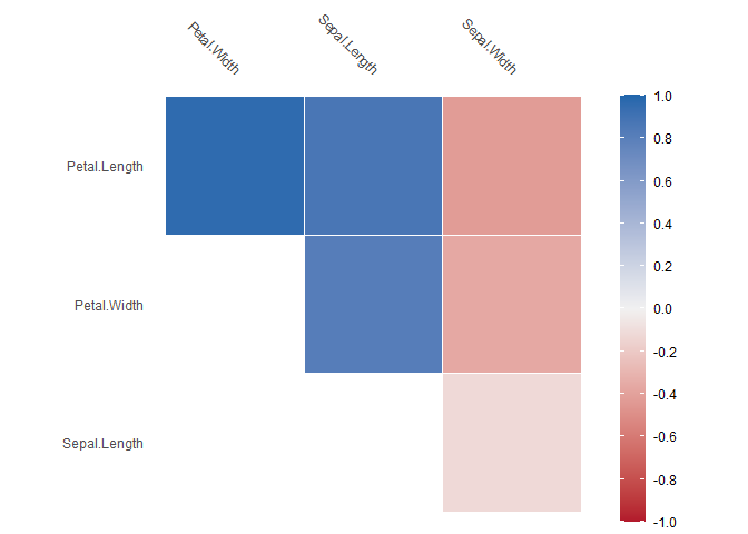 I have been using the package corrplot where there is a function corrplot::corrplot.mixed . This function uses mixed methods to visualize a correlation matrix which in the package corrr are not incorporated in relation to corrr::autoplot. Here is a comparison between the plots created: