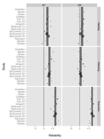 These graphics display data from 15 published and unpublished experiments, involving a total of 1128 human participants. Each experiment employed a popular experimental psychology task called the Attention Network Test (ANT). The ANT requires participants to respond to visual stimuli on a computer screen, and both response time (RT) and error rate (ER) are measured. Within each participant and each measure (RT & ER), the ANT computes a score reflecting the efficiency of each of 3 proposed “Networks” of attention, Alerting, Orienting, and Executive Control. Thus each person has 6 scores of interest (2 measures × 3 networks). Raw data from the 15 experiments was obtained to answer two questions: